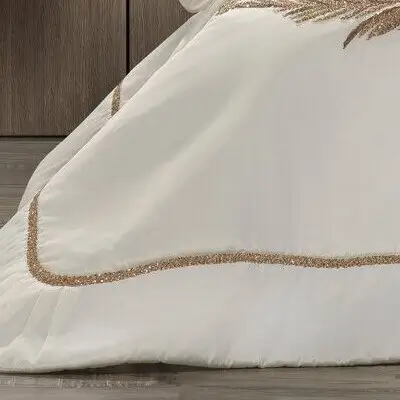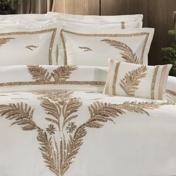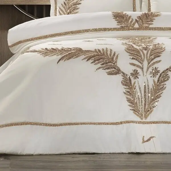 - Yatak Örtüsü: Dayanıklı ve şık görünüme sahip polyester kumaş taş işlemeleriyle zenginleştirilmiştir.