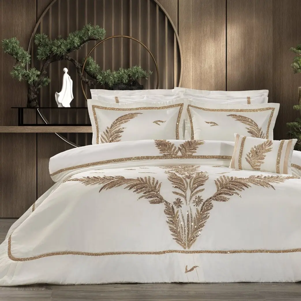 CAROLINE 10 PARÇA ÇEYİZ YATAK SETİ / BEJ taşlı ve zarif tasarıma sahip yatak seti, klasiklerden vazgeçemeyenlerin tercihi!