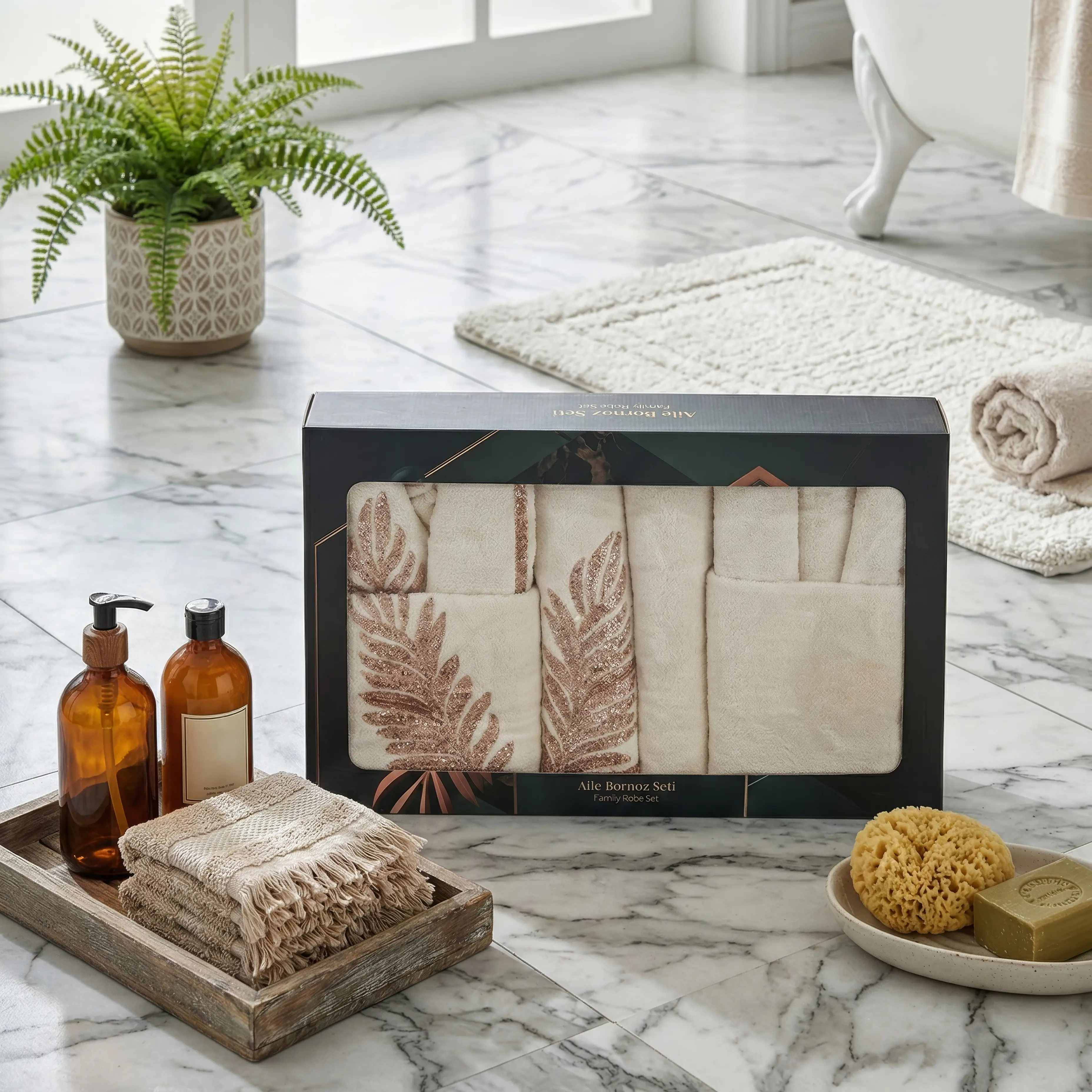 6 parçadan oluşan aile bornoz seti, kadın bornoz, erkek bornoz, 2 adet banyo havlusu ve 2 adet baş havlusundan oluşmaktadır. Bambu içeriği sayesinde yüksek su emiciliğine sahiptir.