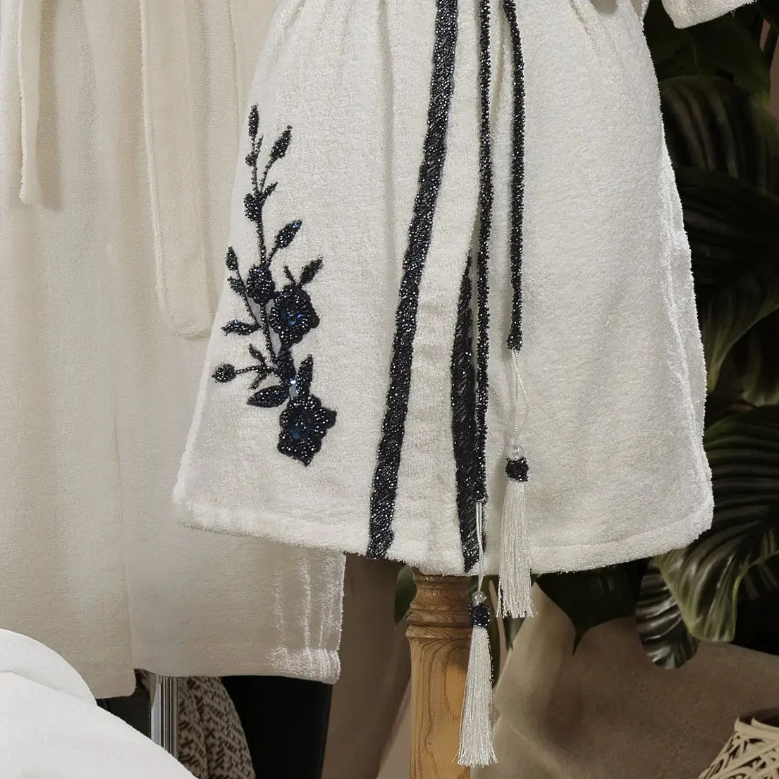 Tasarım: Krem lacivert tonlarında tasarlanan bornozun yaka kısmı ve göğüs bölgesinde dantel işlemeleri bulunmaktadır.