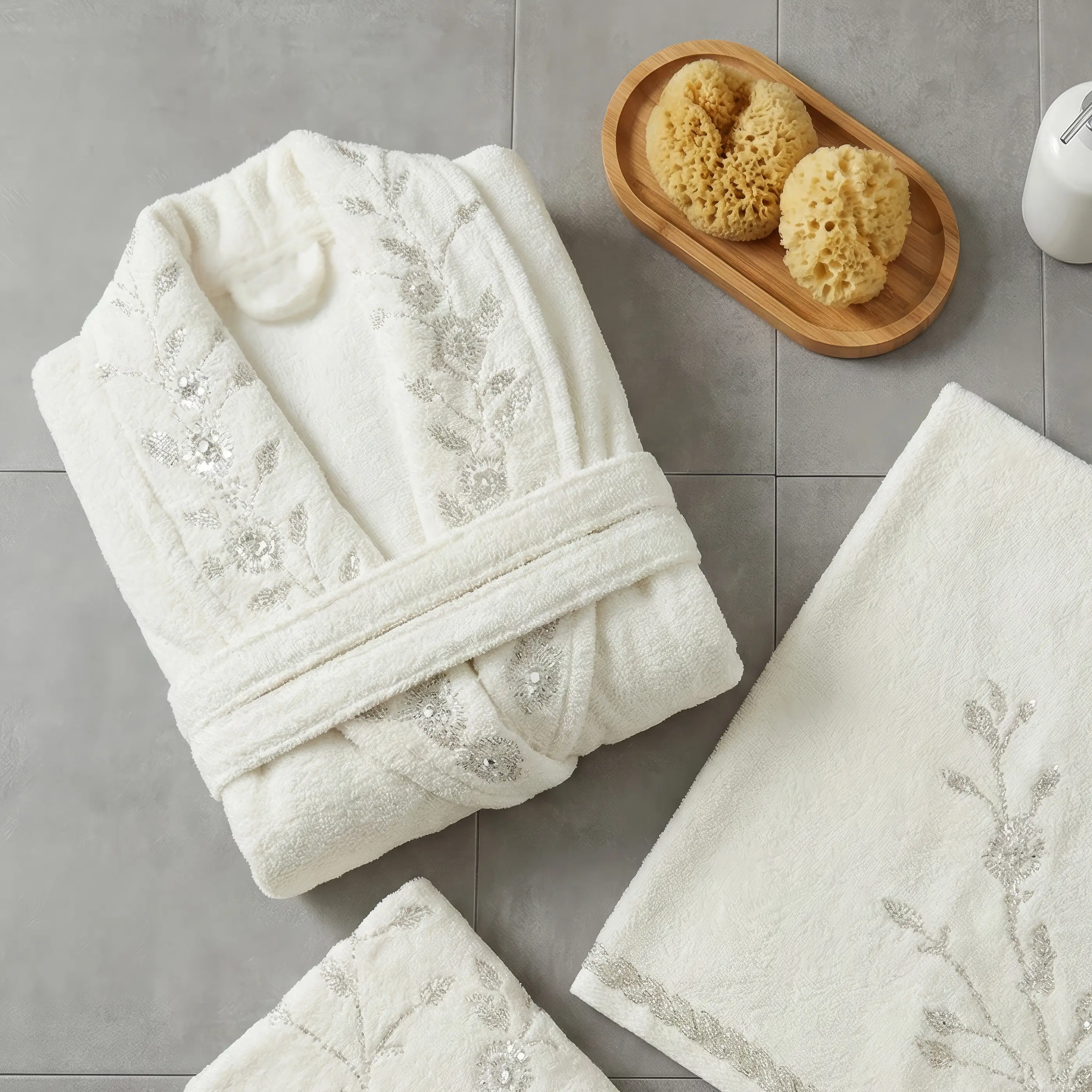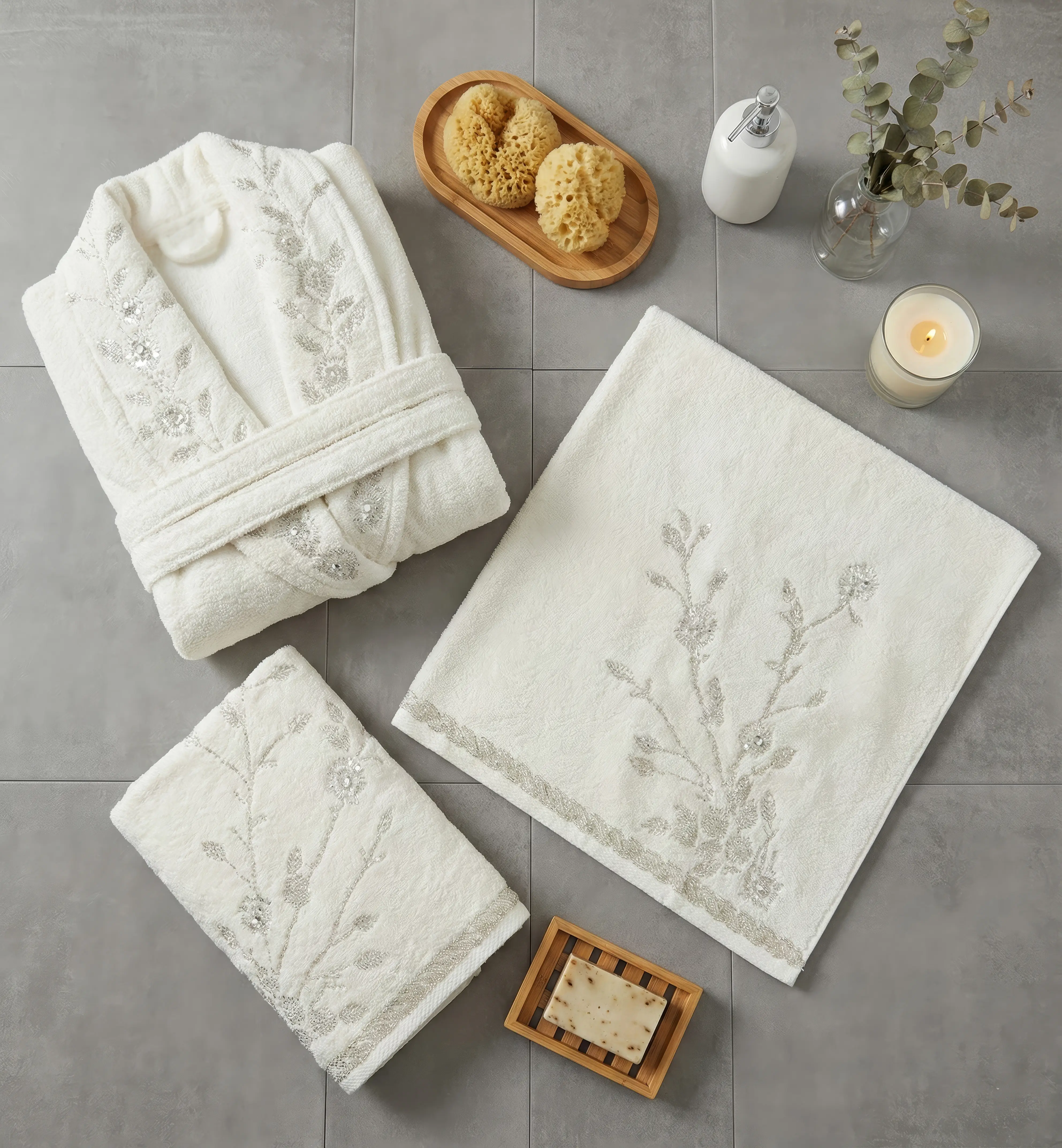 Doku: Yumuşak dokulu kumaşı, zarif floral desenli taşlı işlemeleri ve krem tonlarının huzur veren etkisiyle hem günlük kullanım hem de özel anlar için ideal bir tercihtir.