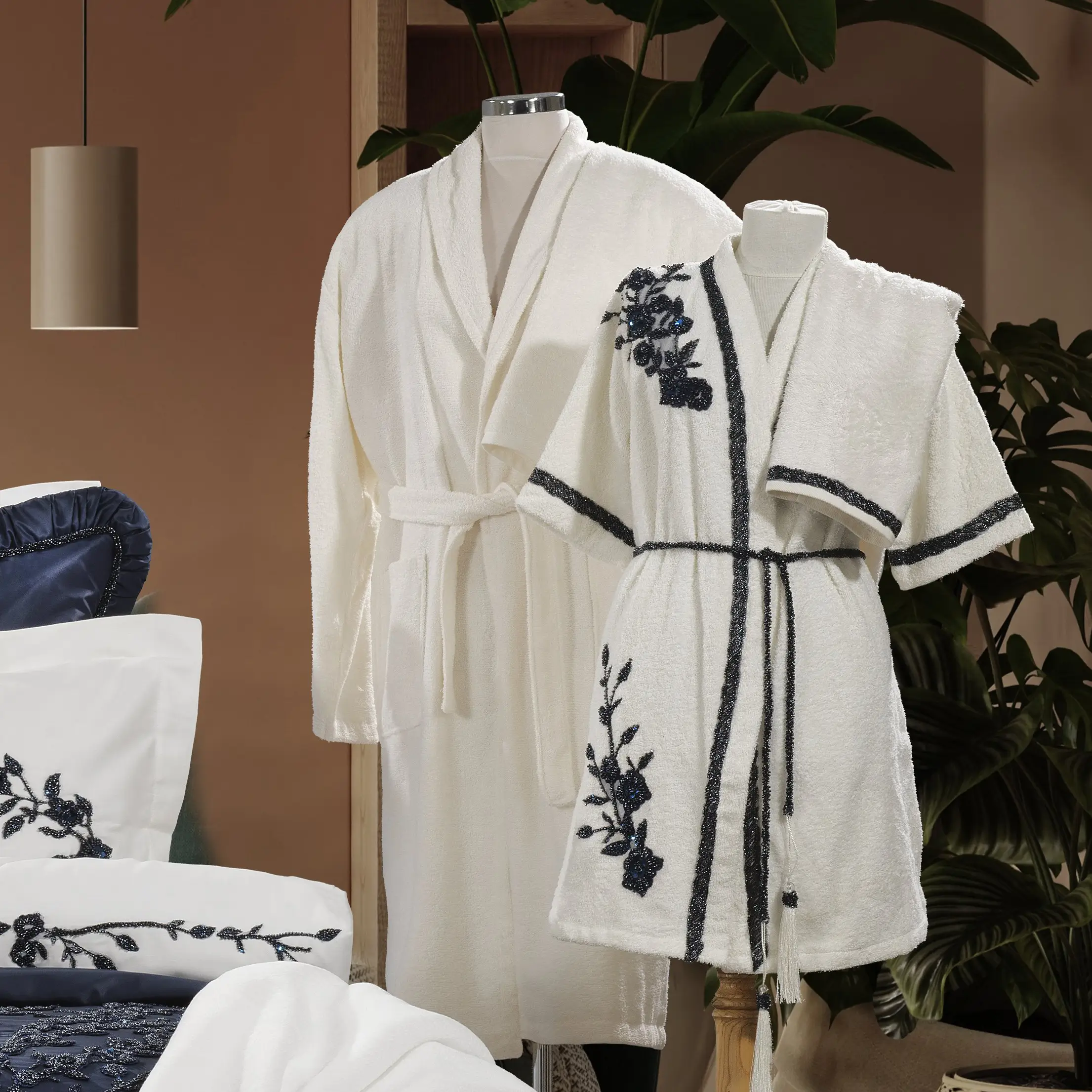 Tasarım: Krem lacivert tonlarında tasarlanan bornozun yaka kısmı ve göğüs bölgesinde işlenmiş çiçek dantelleri bulunmaktadır.