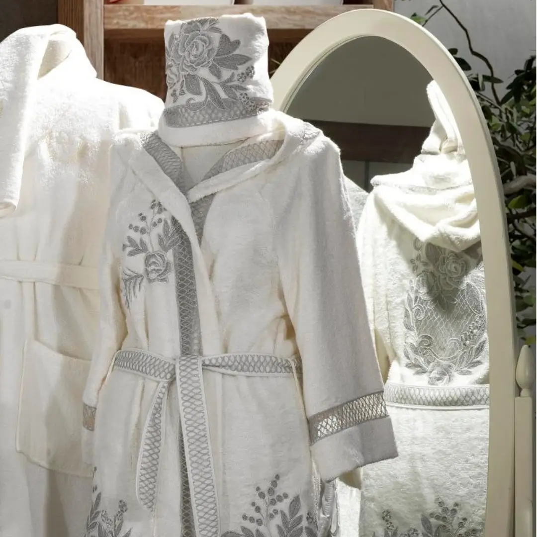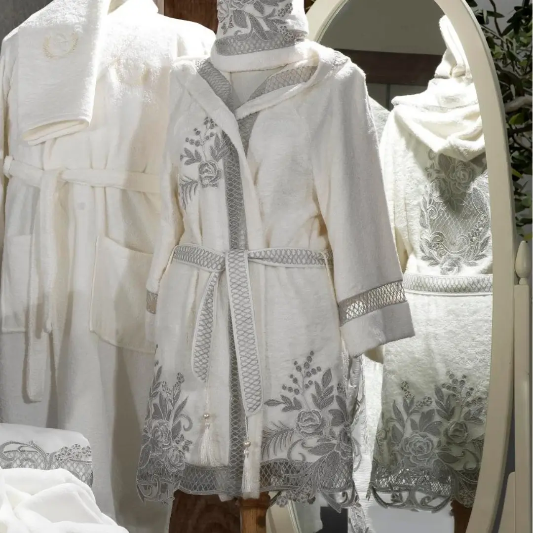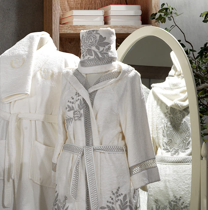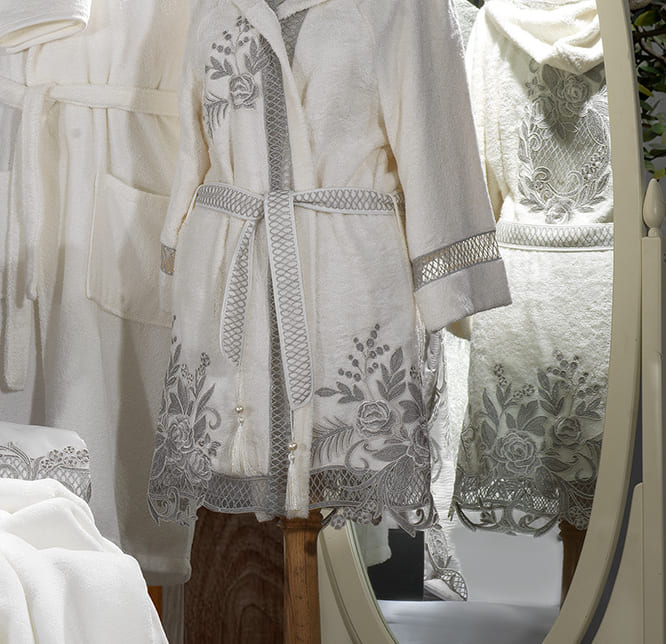 Tasarım: Gri tonlarında tasarlanan bornozun yaka kısmı ve göğüs bölgesinde işlenmiş büyük çiçek dantelleri bulunmaktadır.