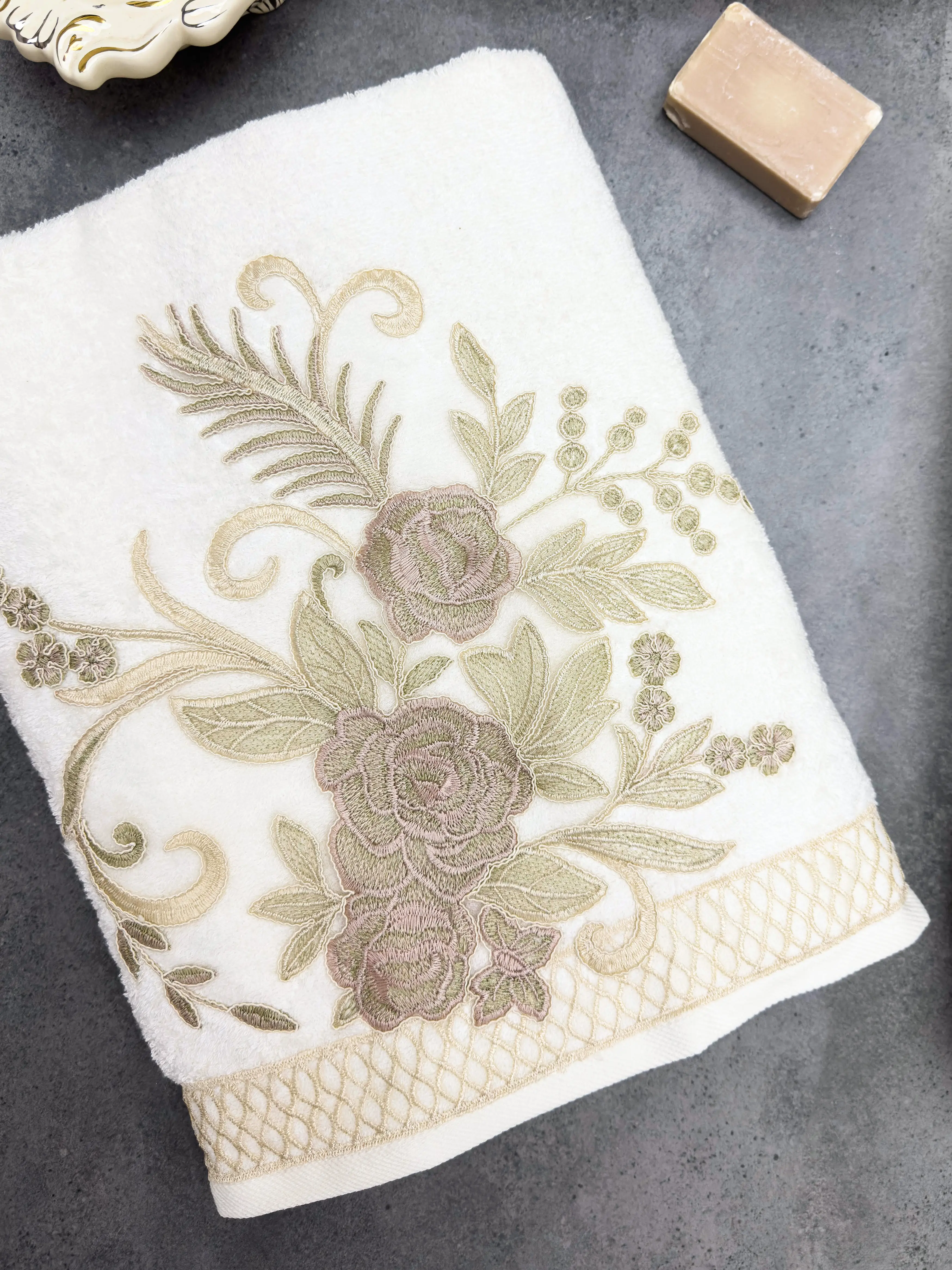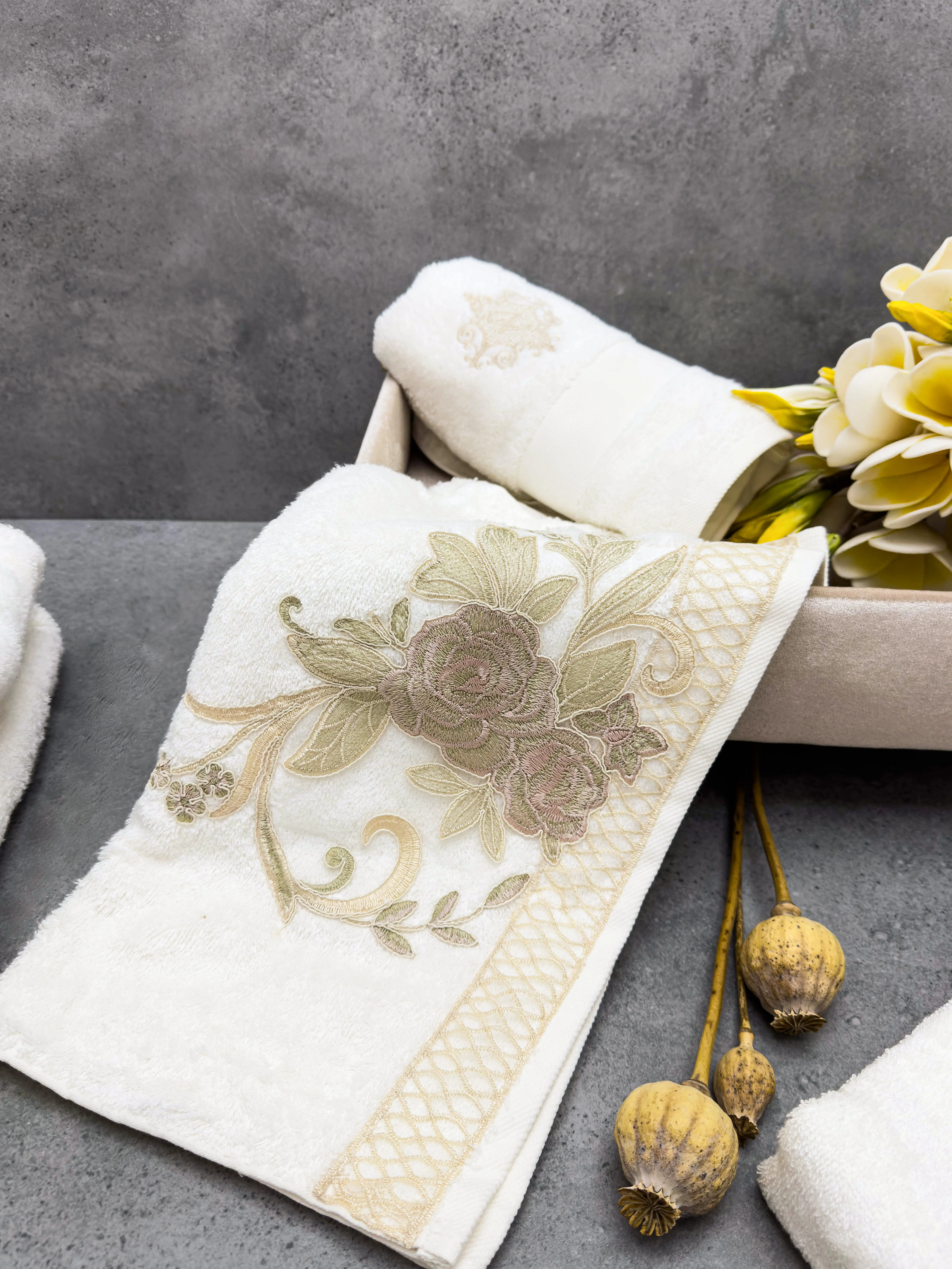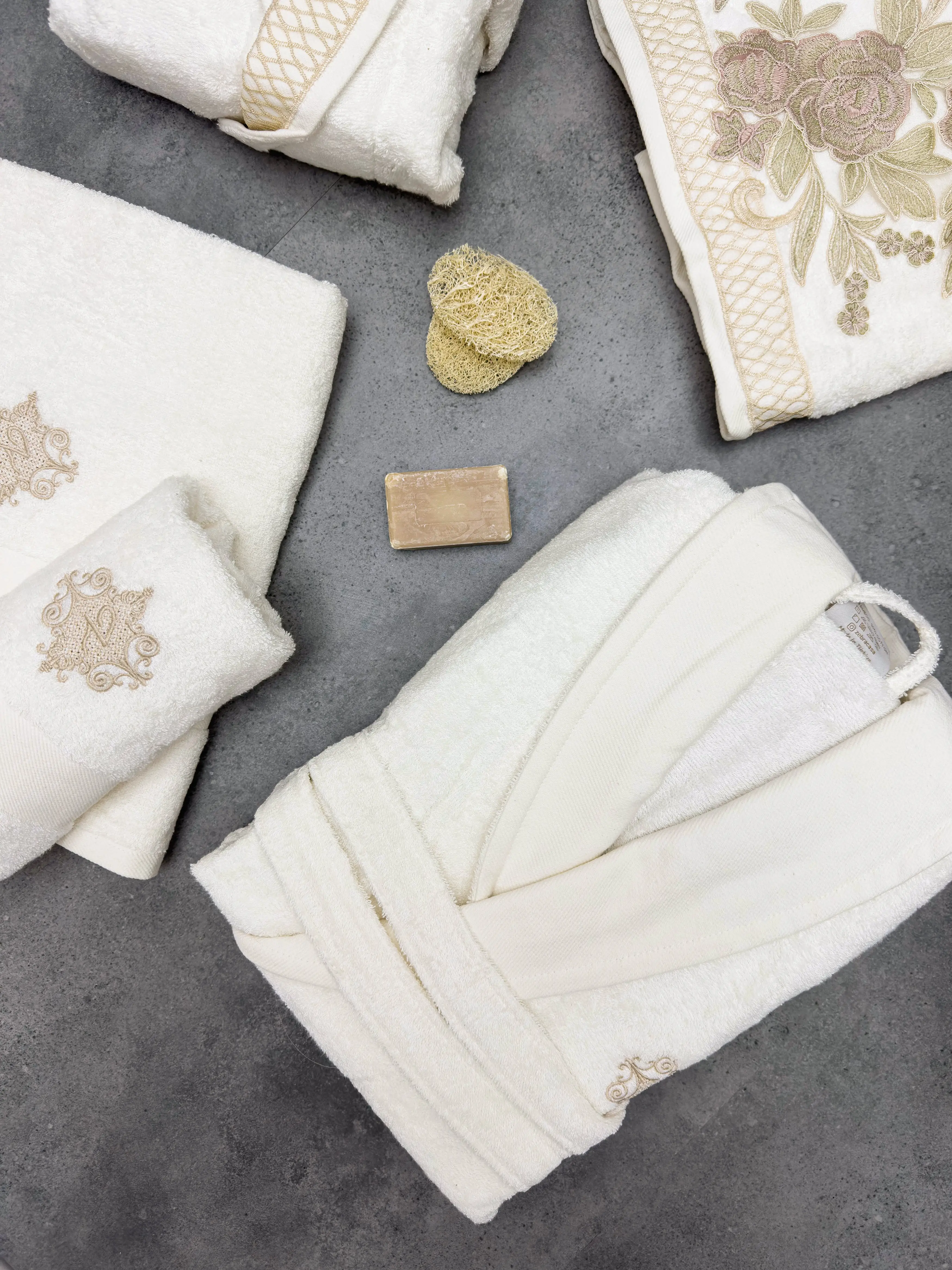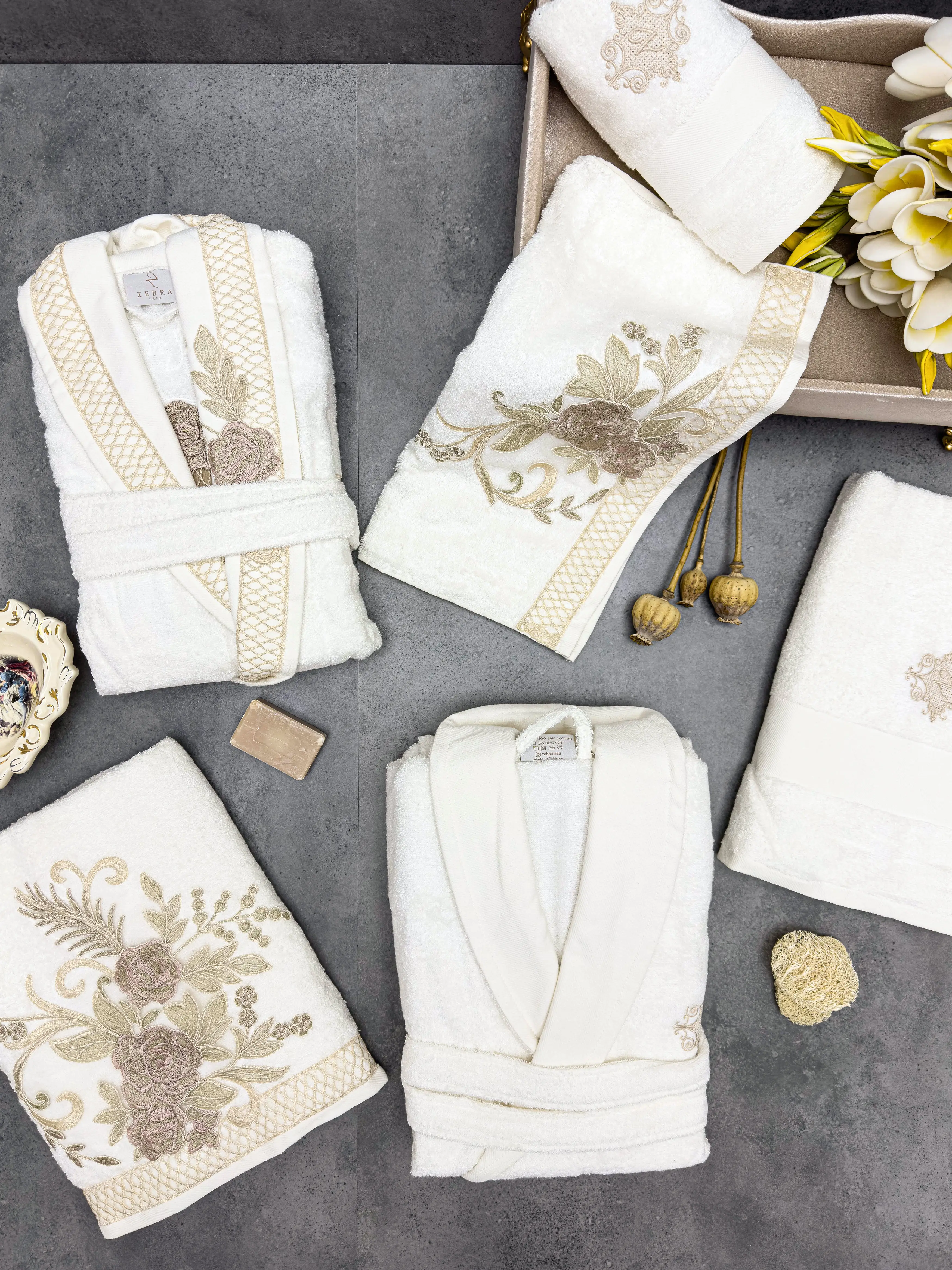 Doku: Yumuşak dokulu kumaşı, zarif çiçek desenli işlemeleri ve krem tonlarının huzur veren etkisiyle hem günlük kullanım hem de özel anlar için ideal bir tercihtir.
