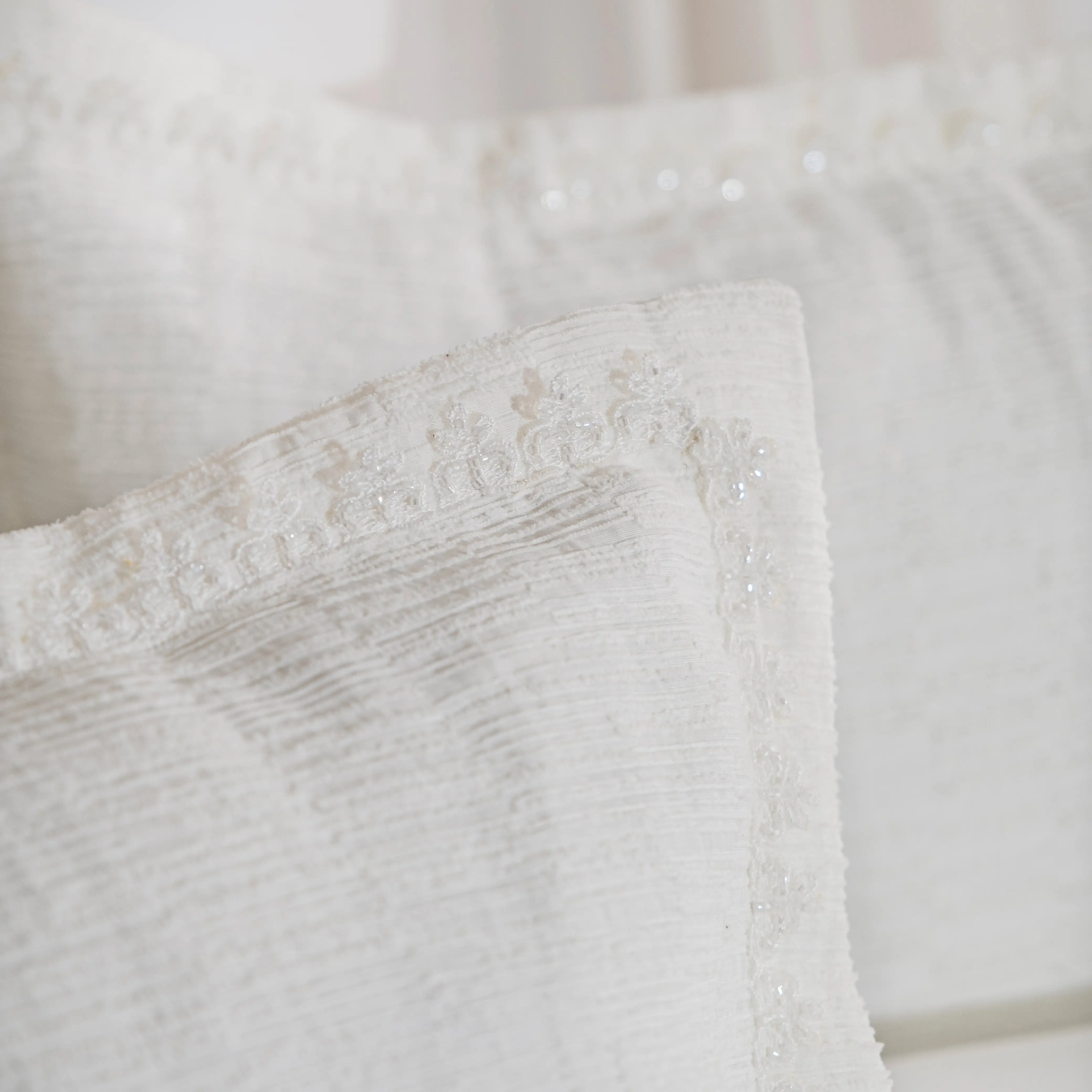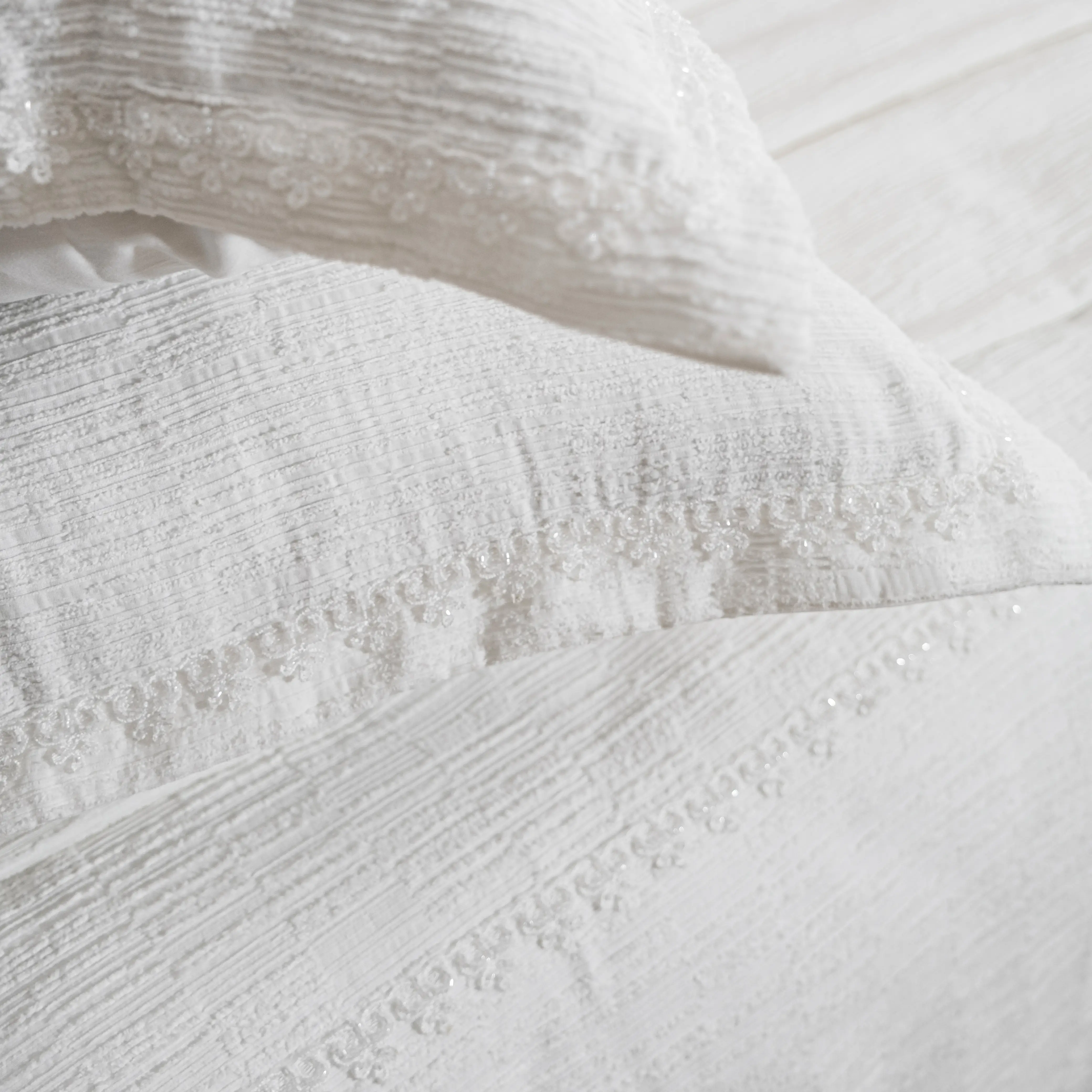 Pike, nevresim ve yastık kılıflarında bulunan taş işlemeli dantel şeritleri bulunmaktadır.