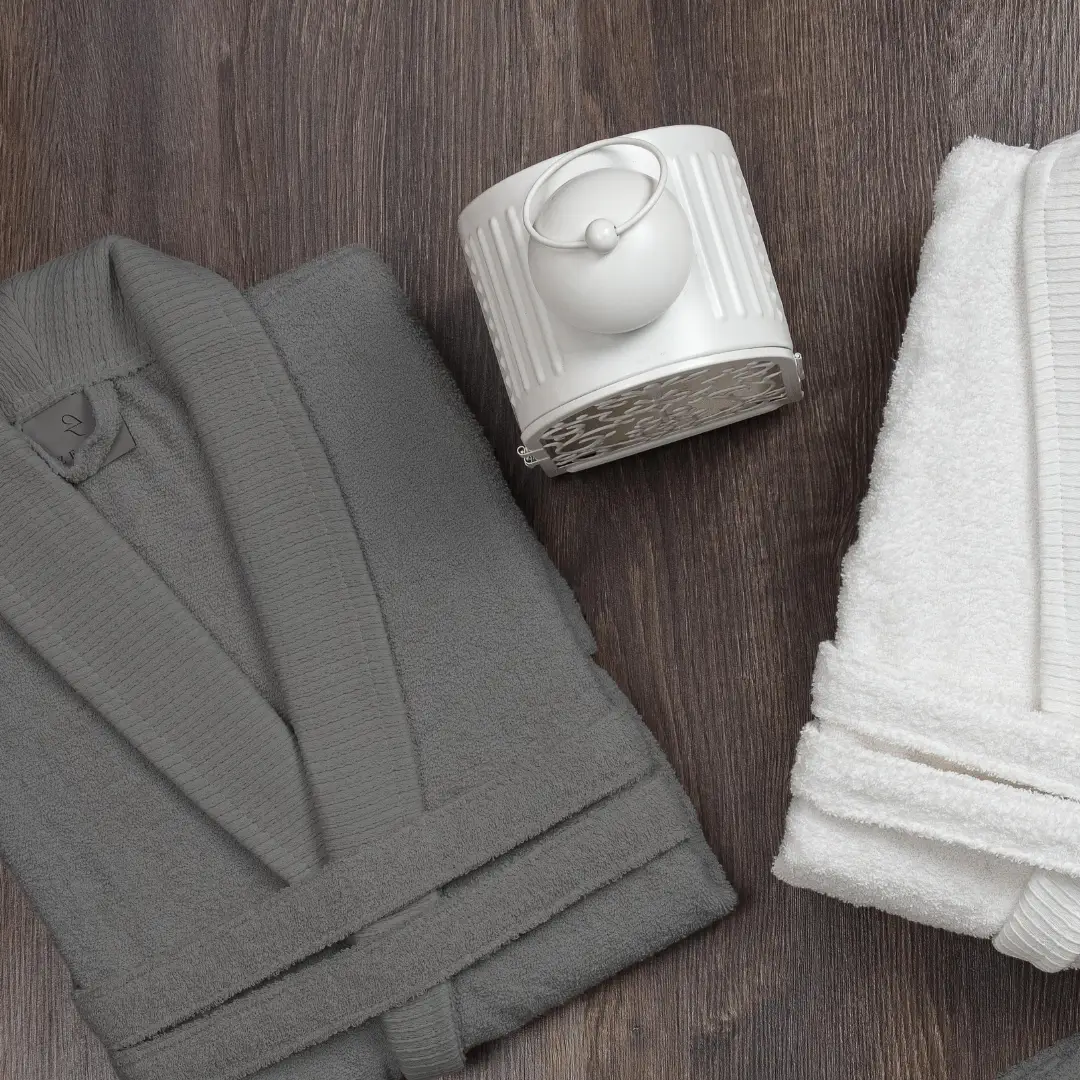 Tasarım: Krem ve antrasit tonlarında tasarlanan bornozun yaka kısmında çizgili desenleri vardır.