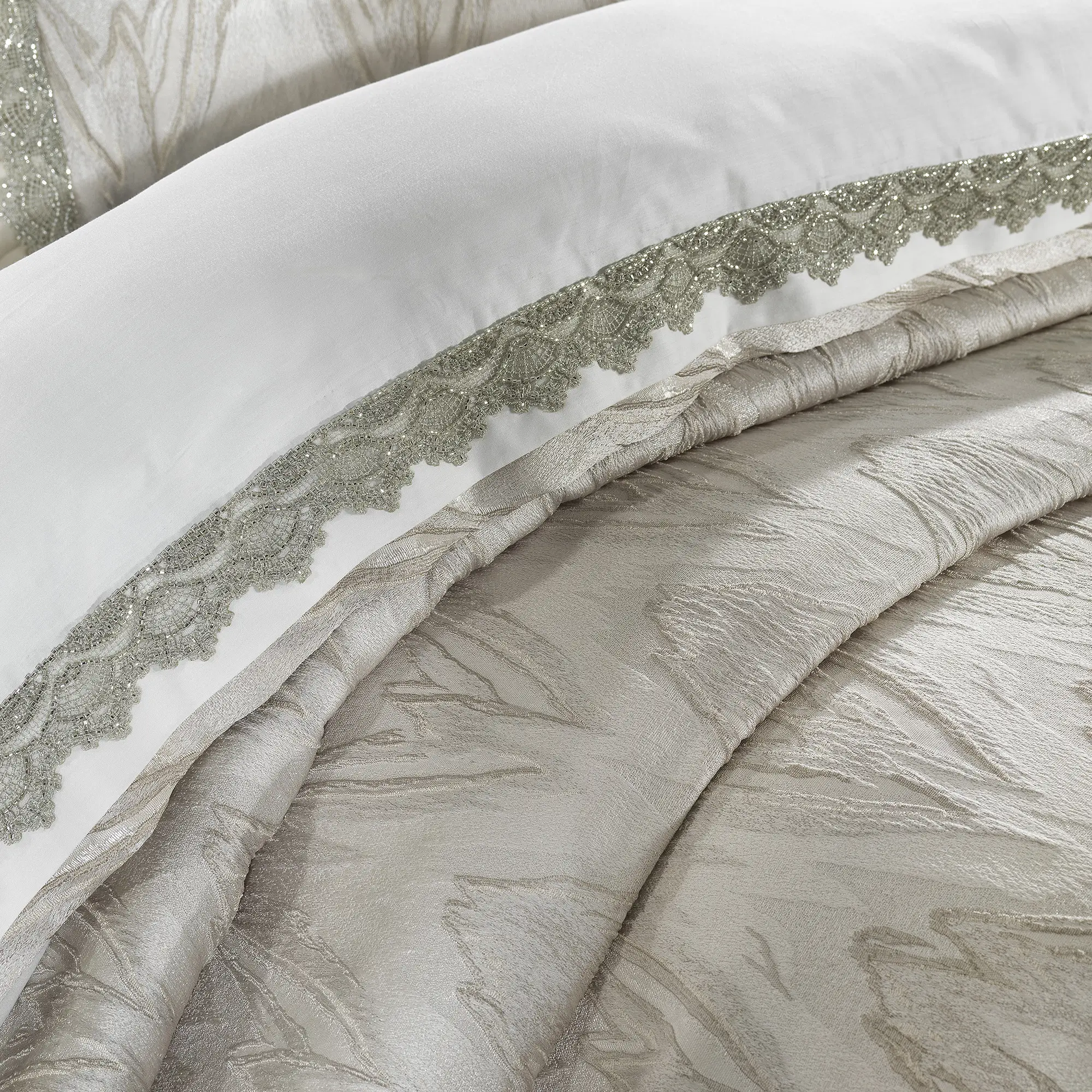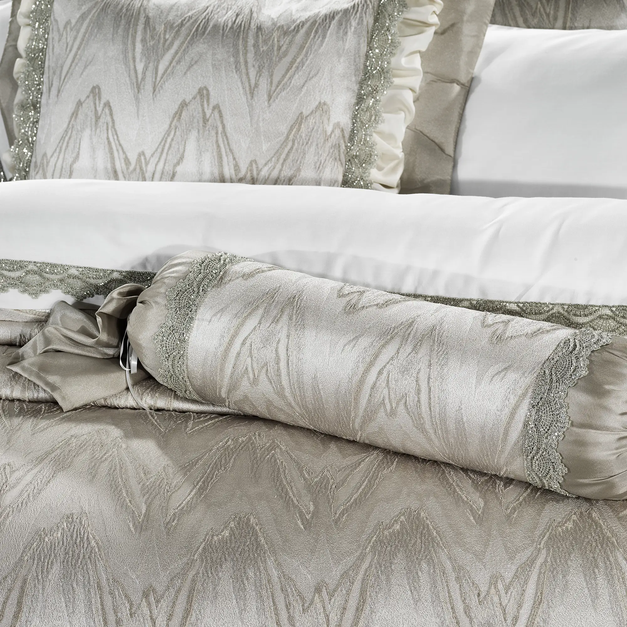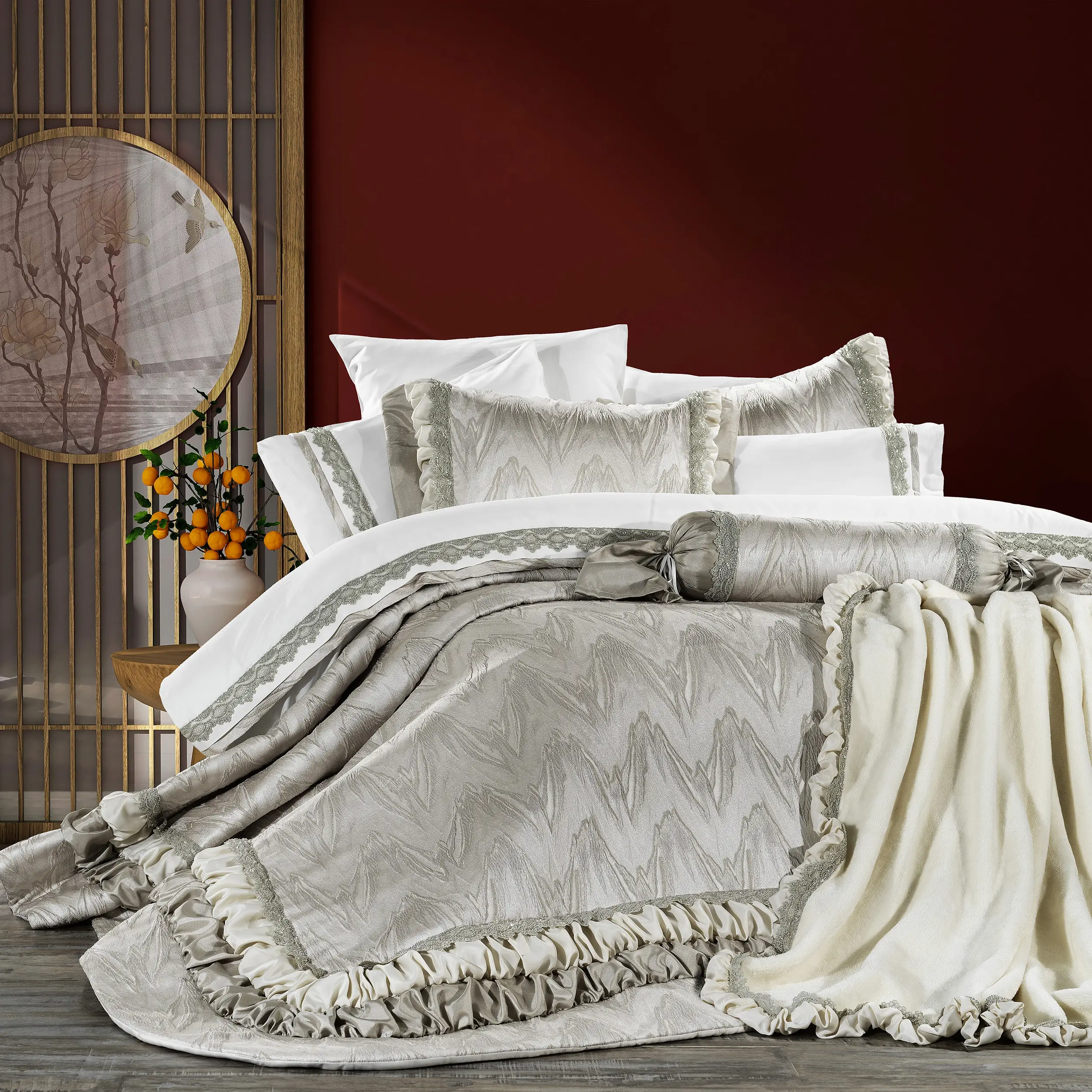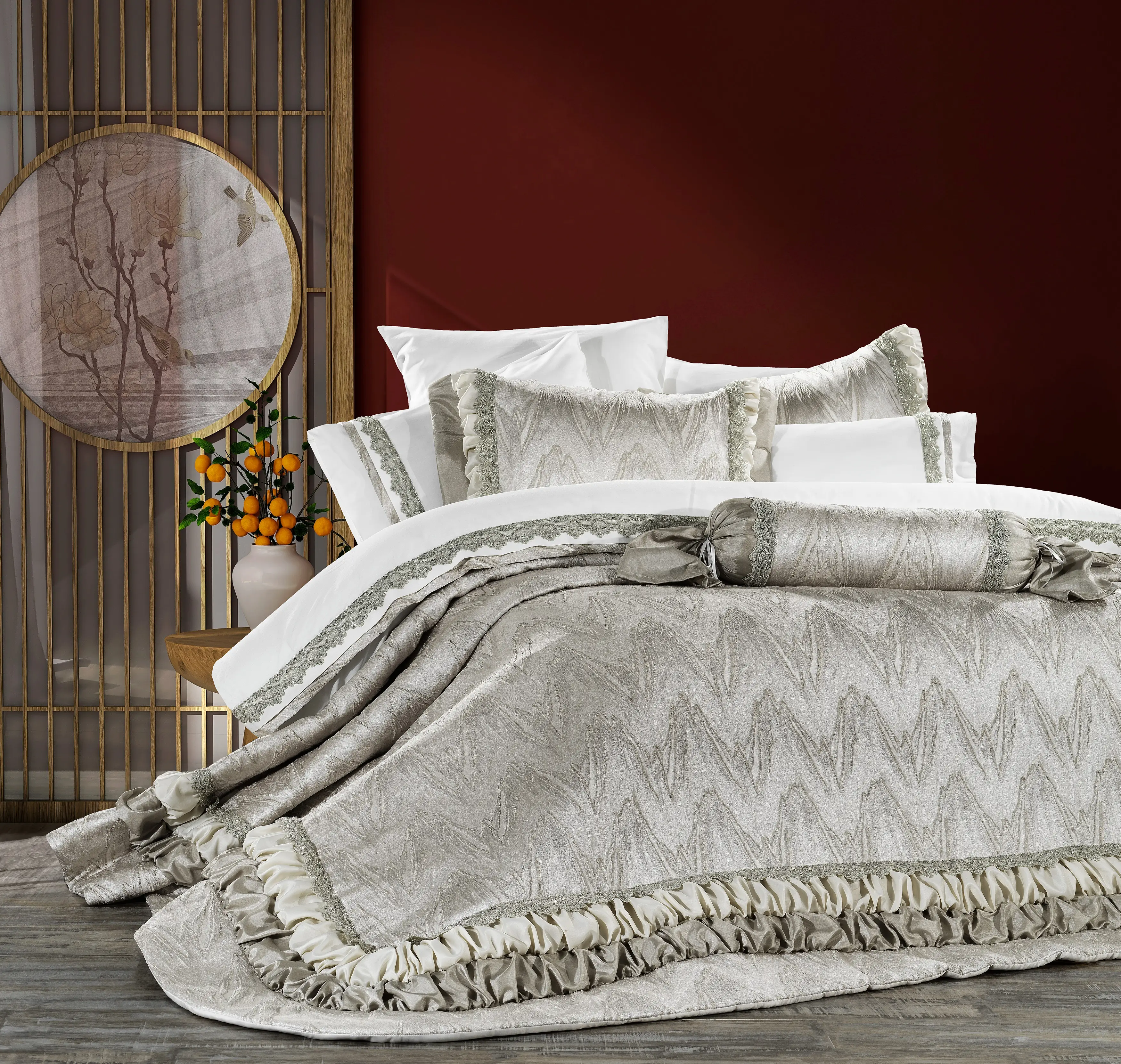 - Zarif Jakarlı Desen: Yatak örtüsünün üzerinde yer alan dalgalı jakar desenler, odaya hareket ve derinlik kazandırır. Işığa göre hafif parlama yapan yüzey, premium bir görünüm sunar.