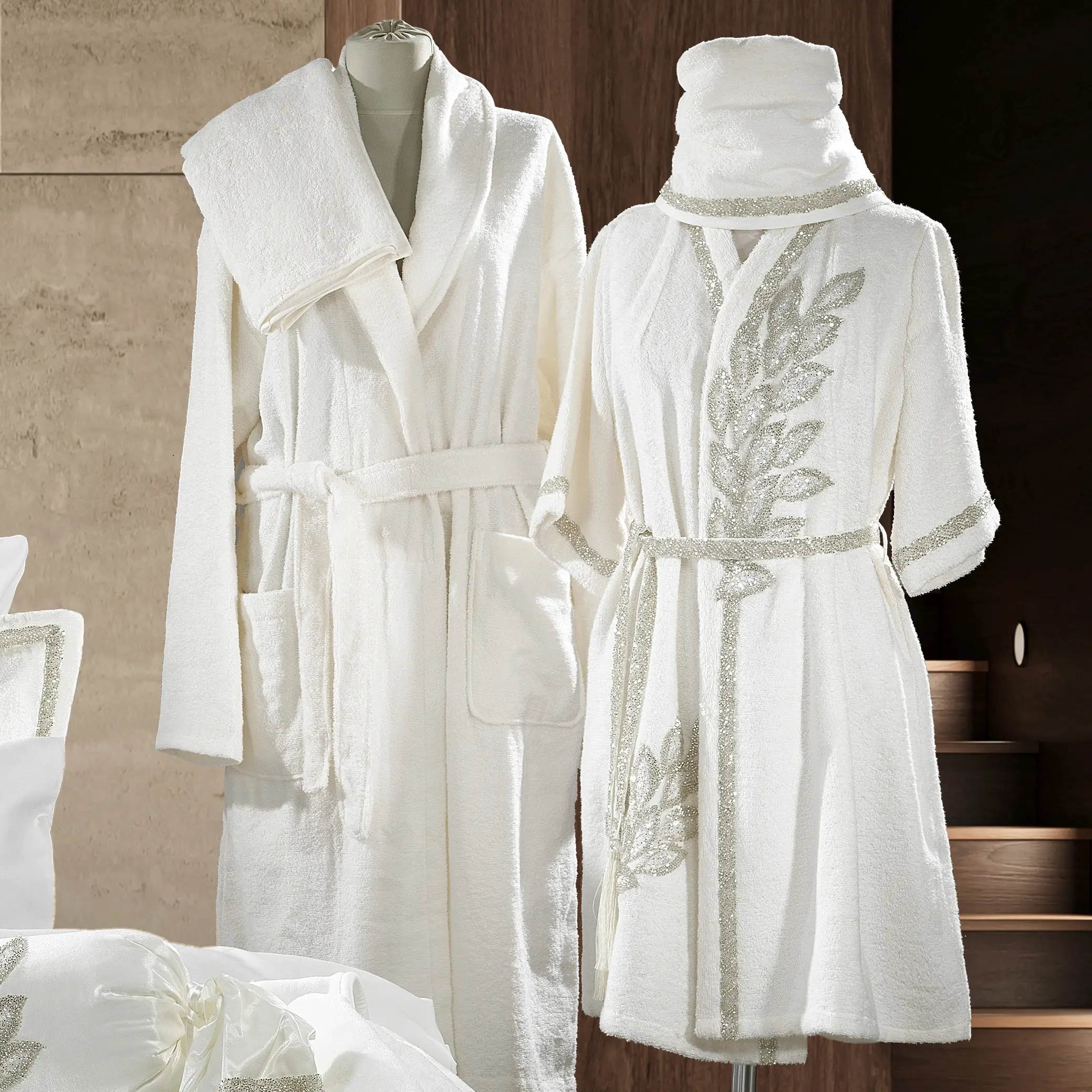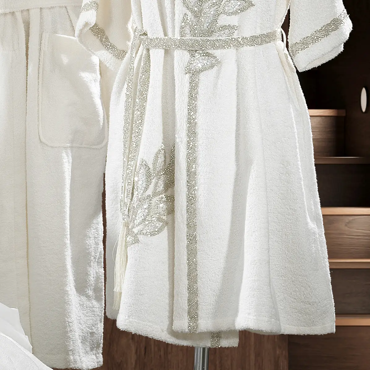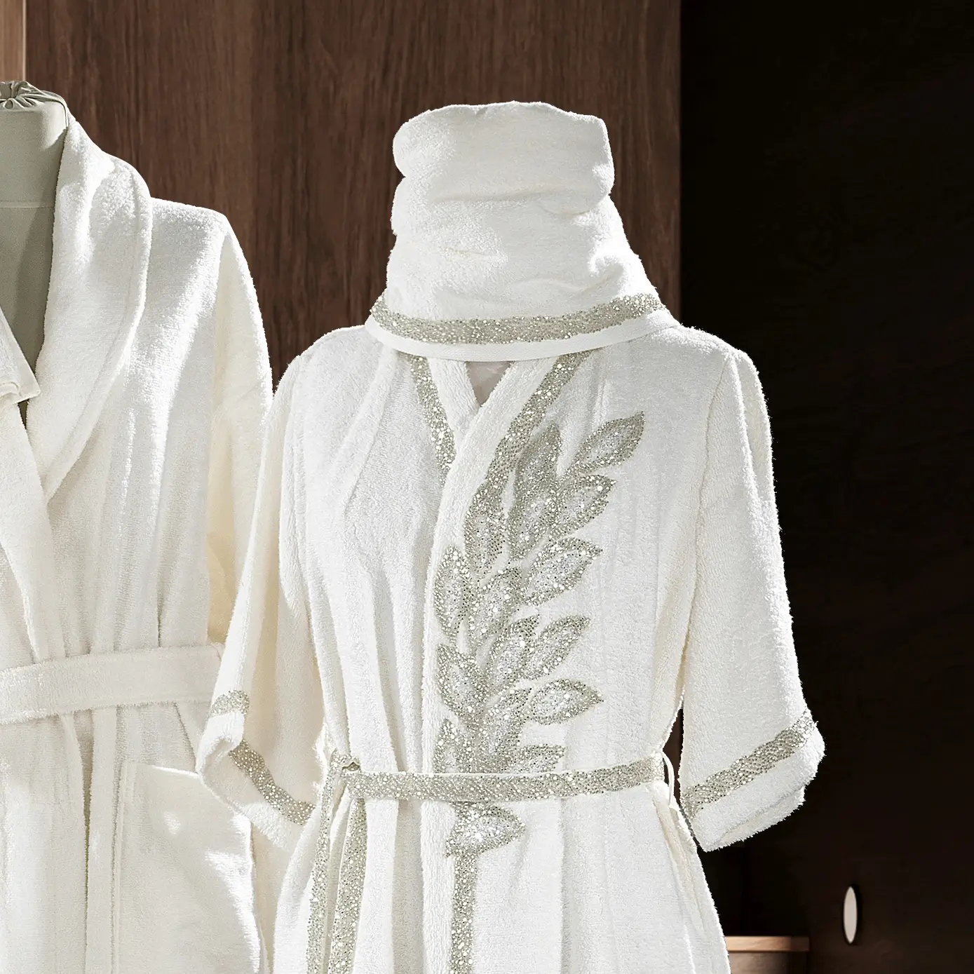 Tasarım: Krem tonlarında tasarlanan bornozun yaka kısmı ve göğüs bölgesinde taş işlemeleri bulunmaktadır.