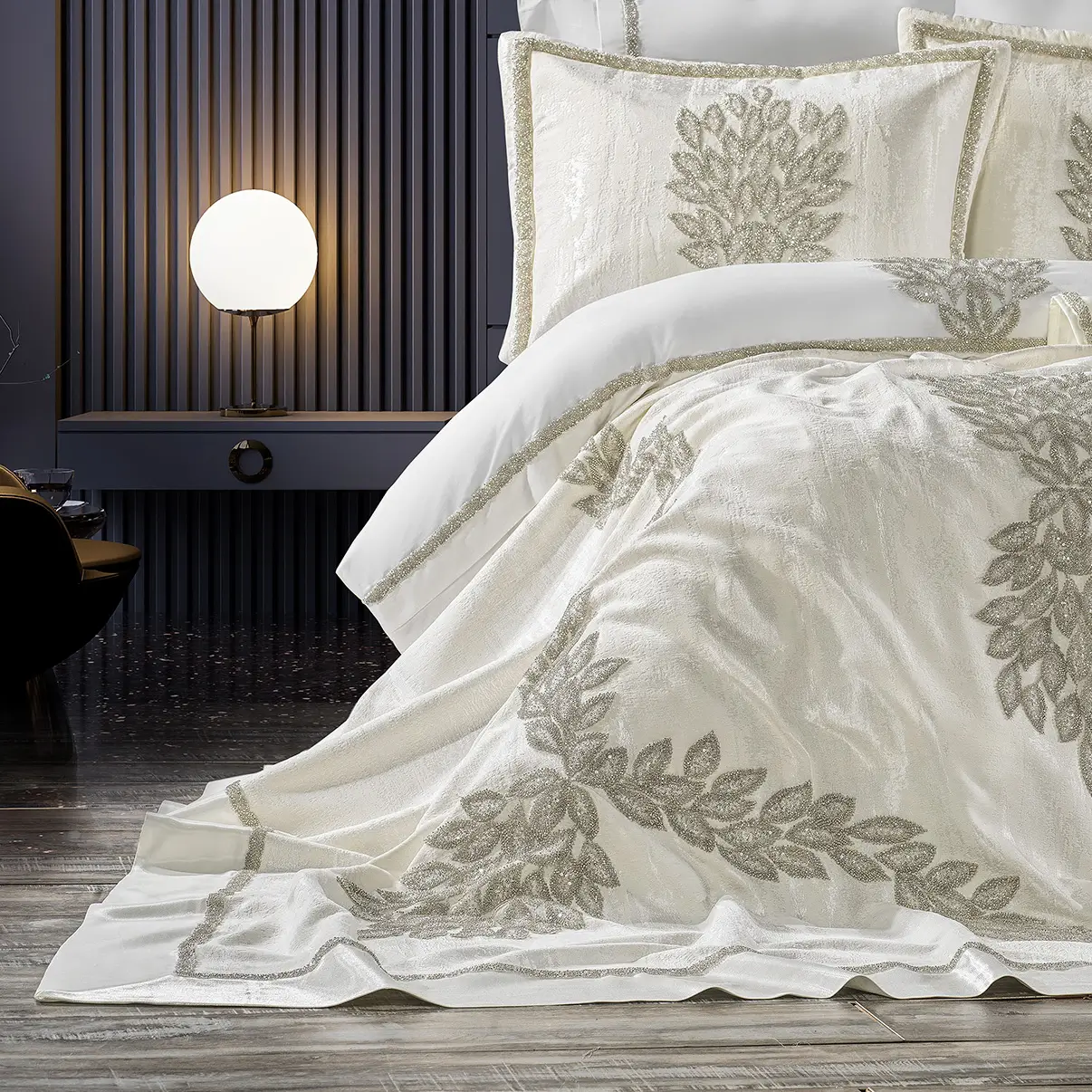 Işığı zarifçe yansıtan taş detaylar ve işlemeler, ürüne sofistike ve ağır bir duruş kazandırır.