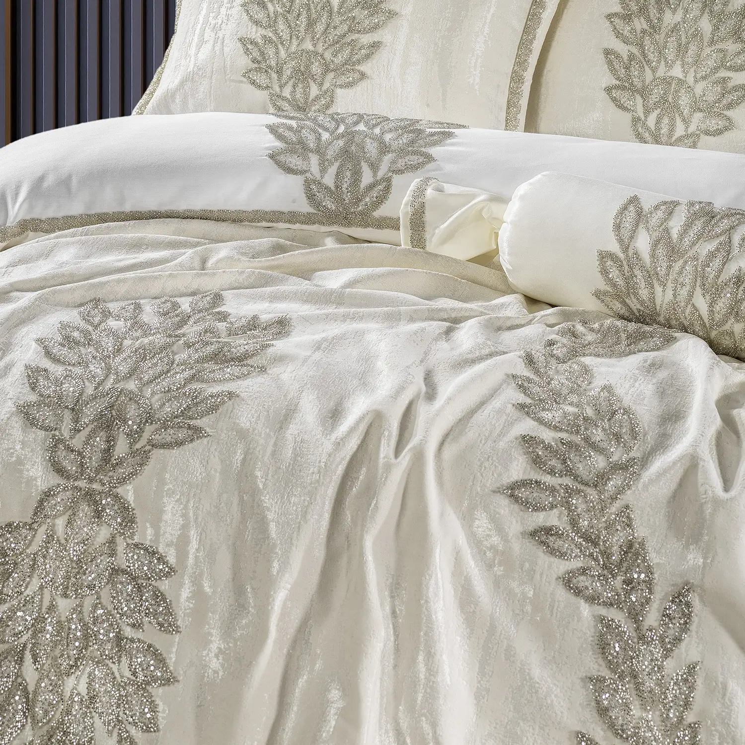 Premium dokuma kumaş üzerine özenle uygulanan taş detaylar