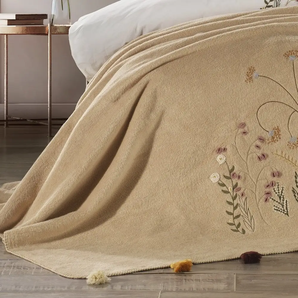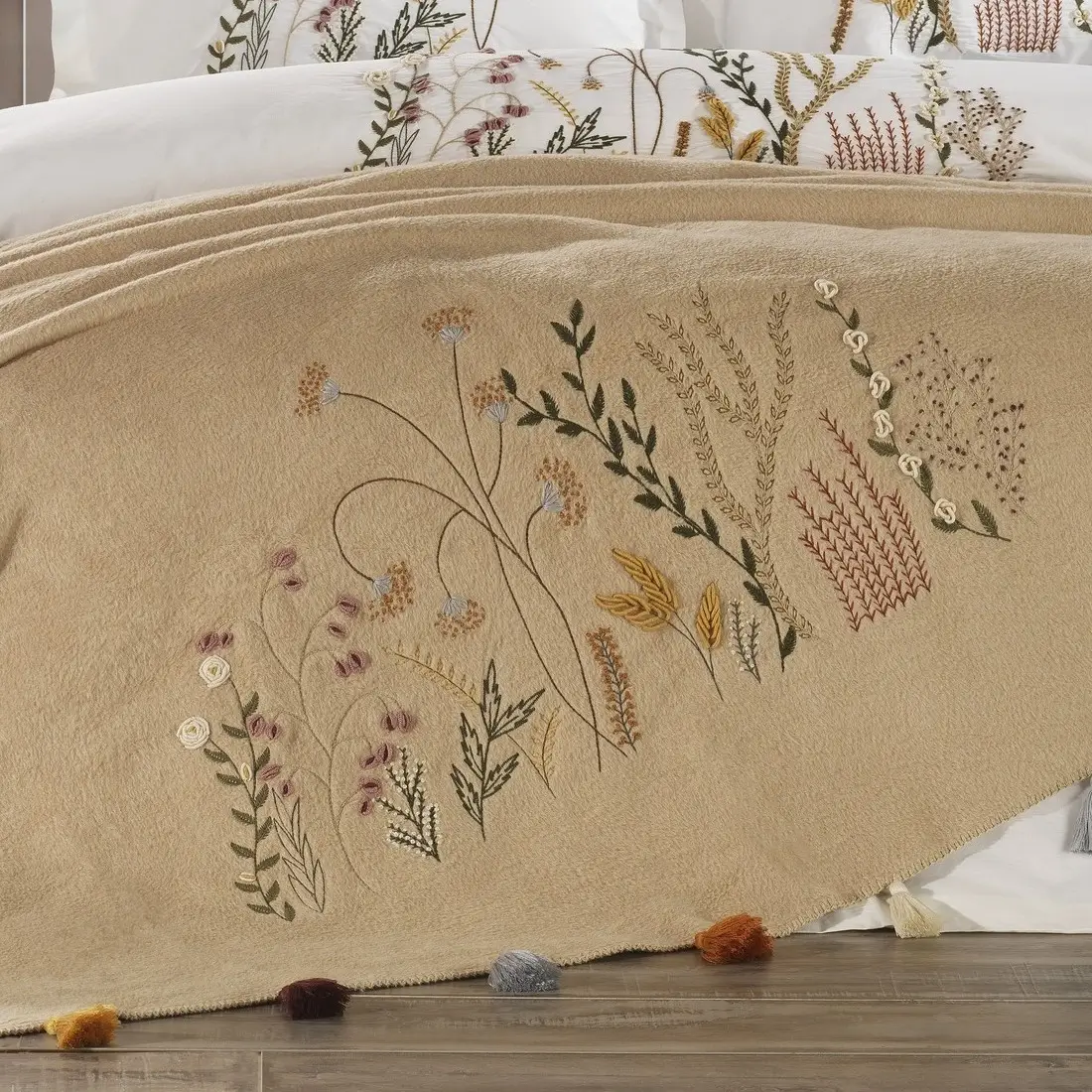 - Battaniye: Bej tonlarında battaniye, üzerinde aynı bitki desenlerinin nakış işlemeleri bulunuyor. Battaniye uçlarında bulunan renkli ponpon detayları ürüne hoş bir hareketlilik katıyor.
