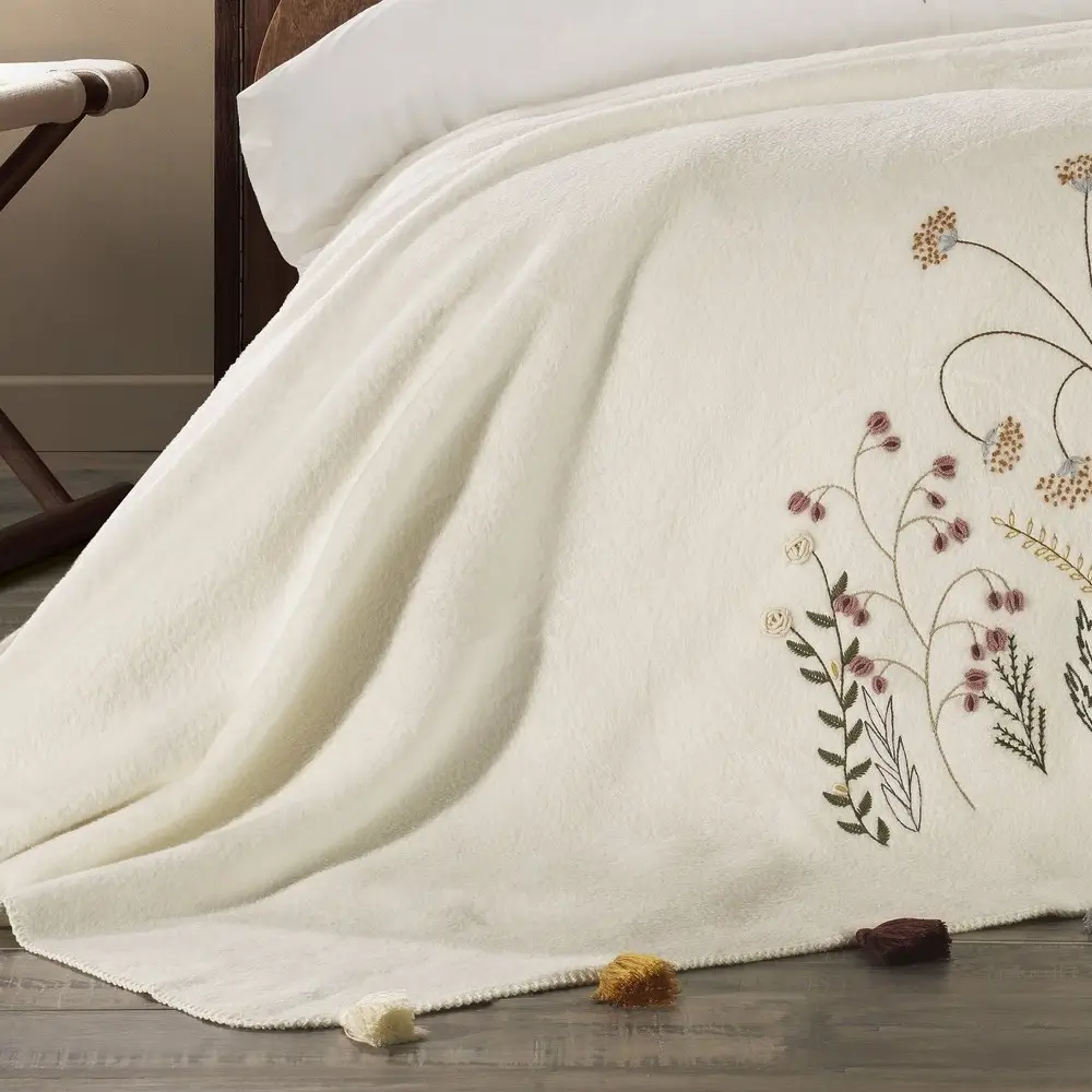 - Battaniye: Krem tonlarında battaniye, üzerinde aynı bitki desenlerinin nakış işlemeleri bulunuyor. Battaniye uçlarında bulunan renkli ponpon detayları ürüne hoş bir hareketlilik katıyor.