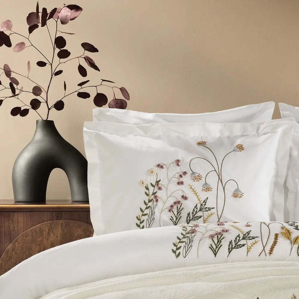 - Nevresim ve Yastık Kılıfları: %100 Pamuk nevresim takımında ince işlenmiş nakışlarla farklı bitki desenleri yer alıyor. Bu nakışlar evinizde kır çiçeklerini ve doğayı andıran bir hava yaratıyor. Minimalist ama zarif bir görünüm sağlıyor.