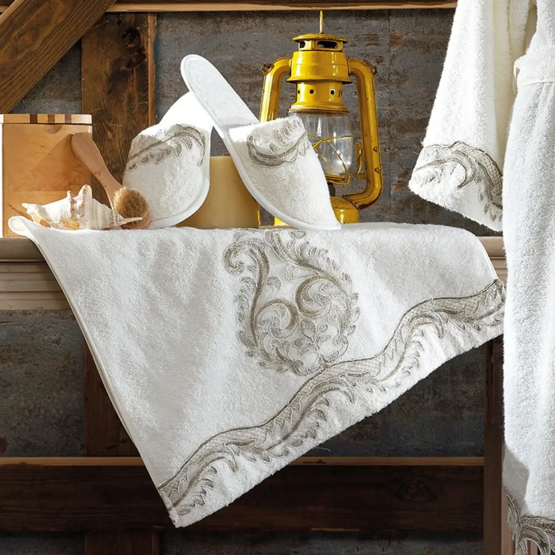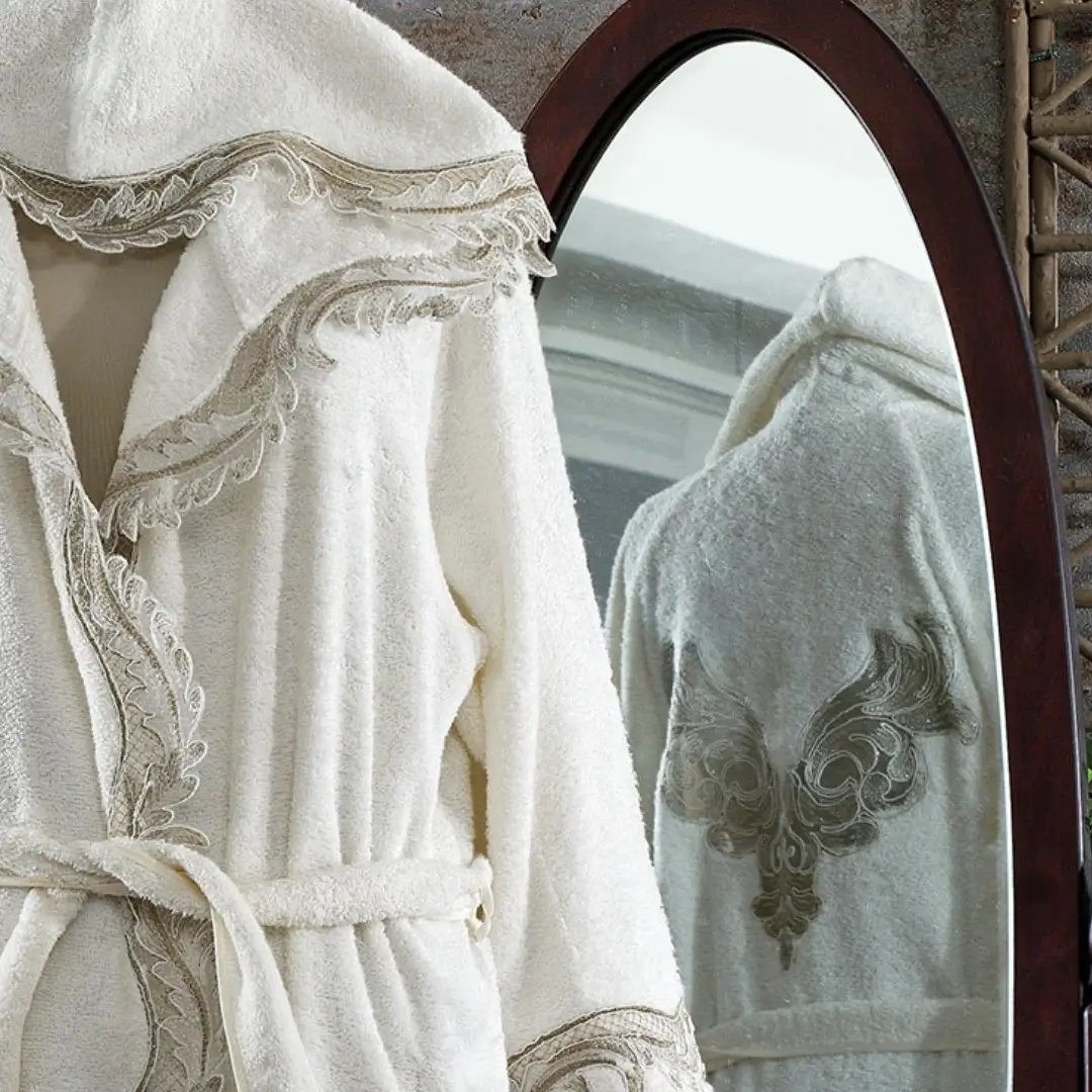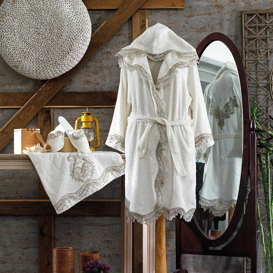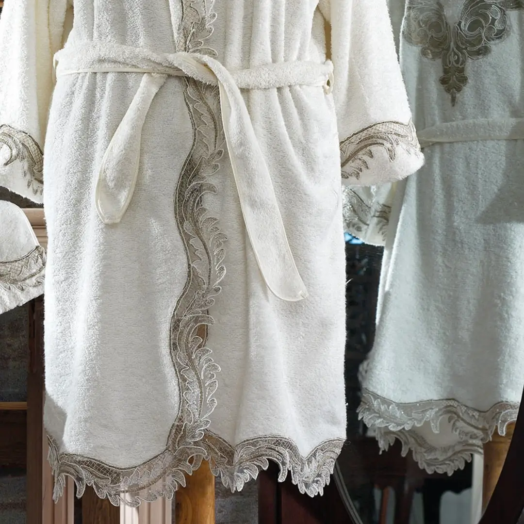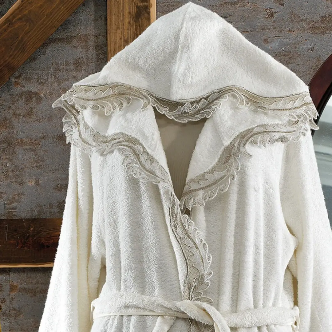 Tasarım: Bornozun yaka kısmı ve göğüs bölgesinde işlenmiş dantelleri bulunmaktadır.