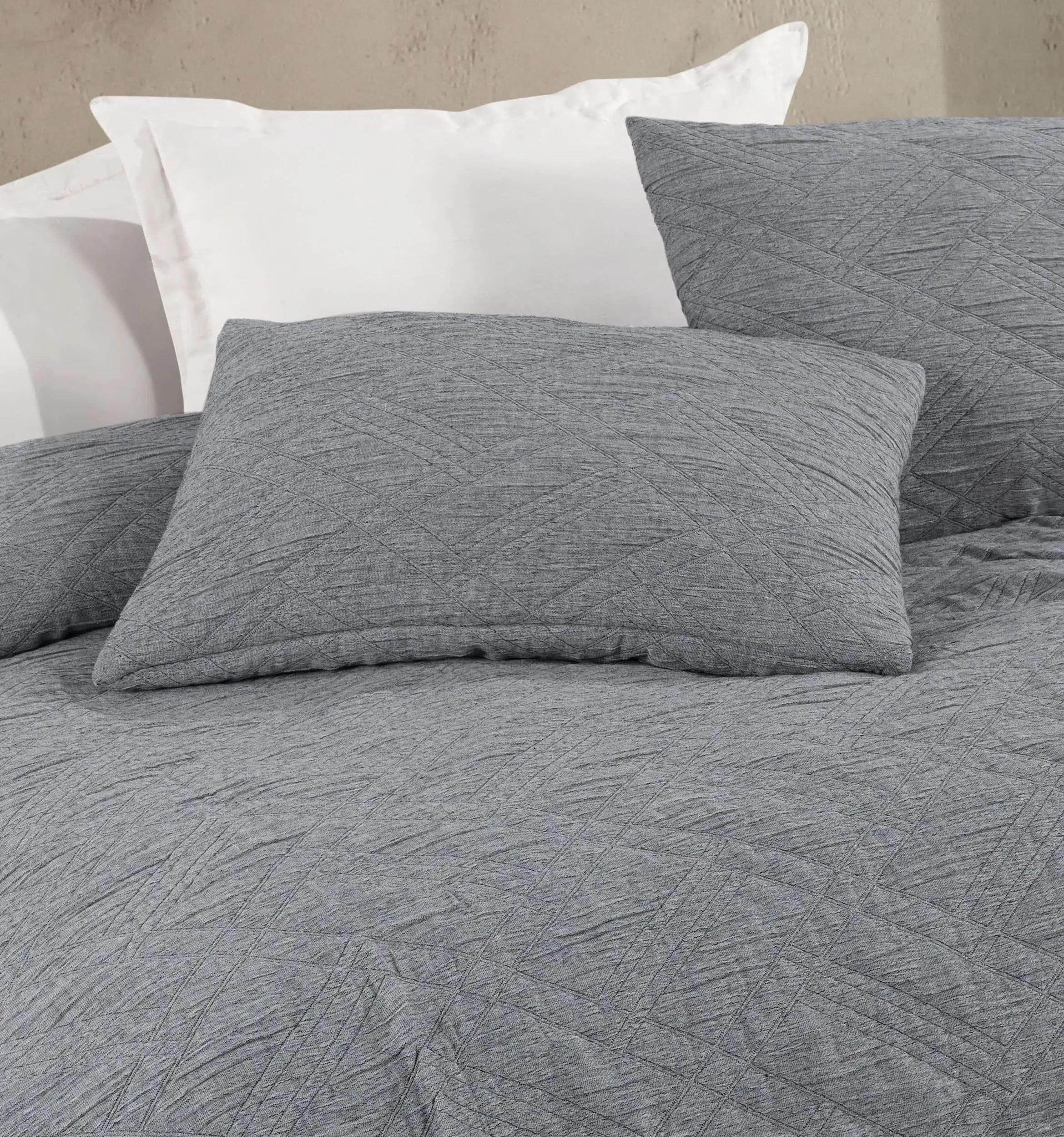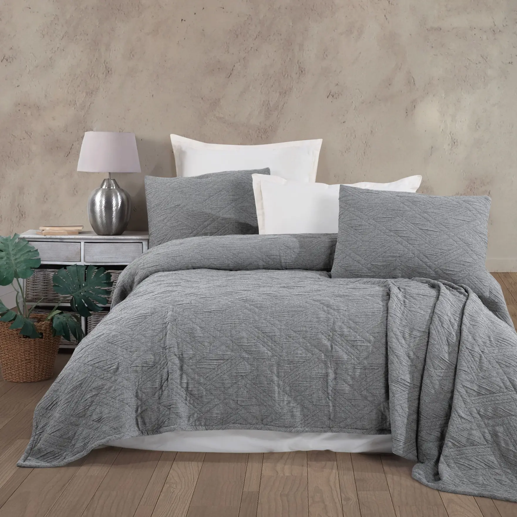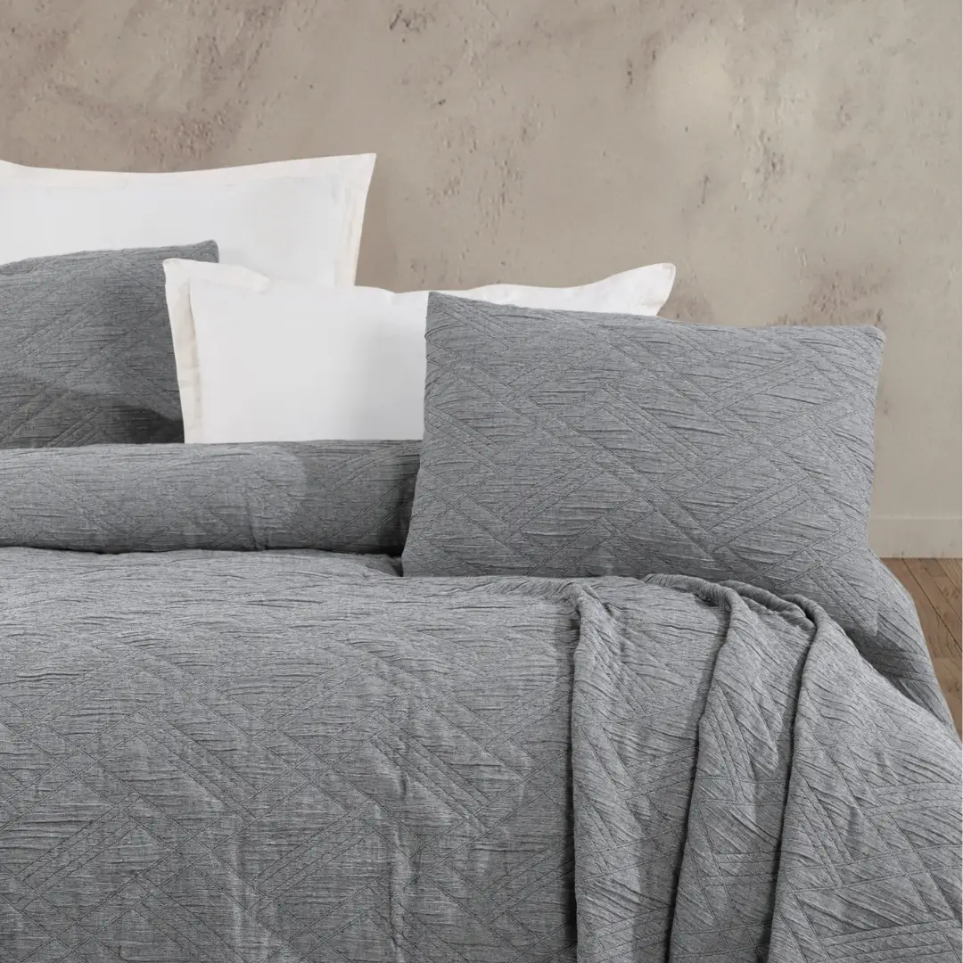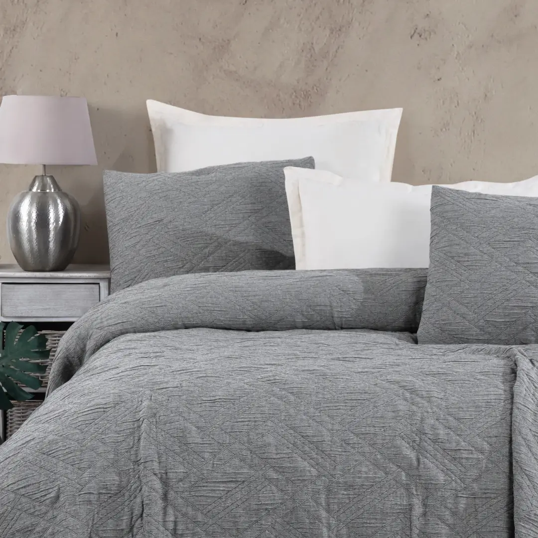 Melba Antrasit Rengi Çift Kişilik Yatak Örtüsü, modern ve şık tasarımı ile yatak odalarınıza zarif bir dokunuş ekler. %100 pamuklu kumaştan üretilen bu ince dolgusuz yatak örtüsü, geometrik desenleriyle odanıza sofistike bir hava katar. Antrasit rengi, her türlü iç mekanla uyum sağlar ve şıklığınıza zarif bir dokunuş ekler.