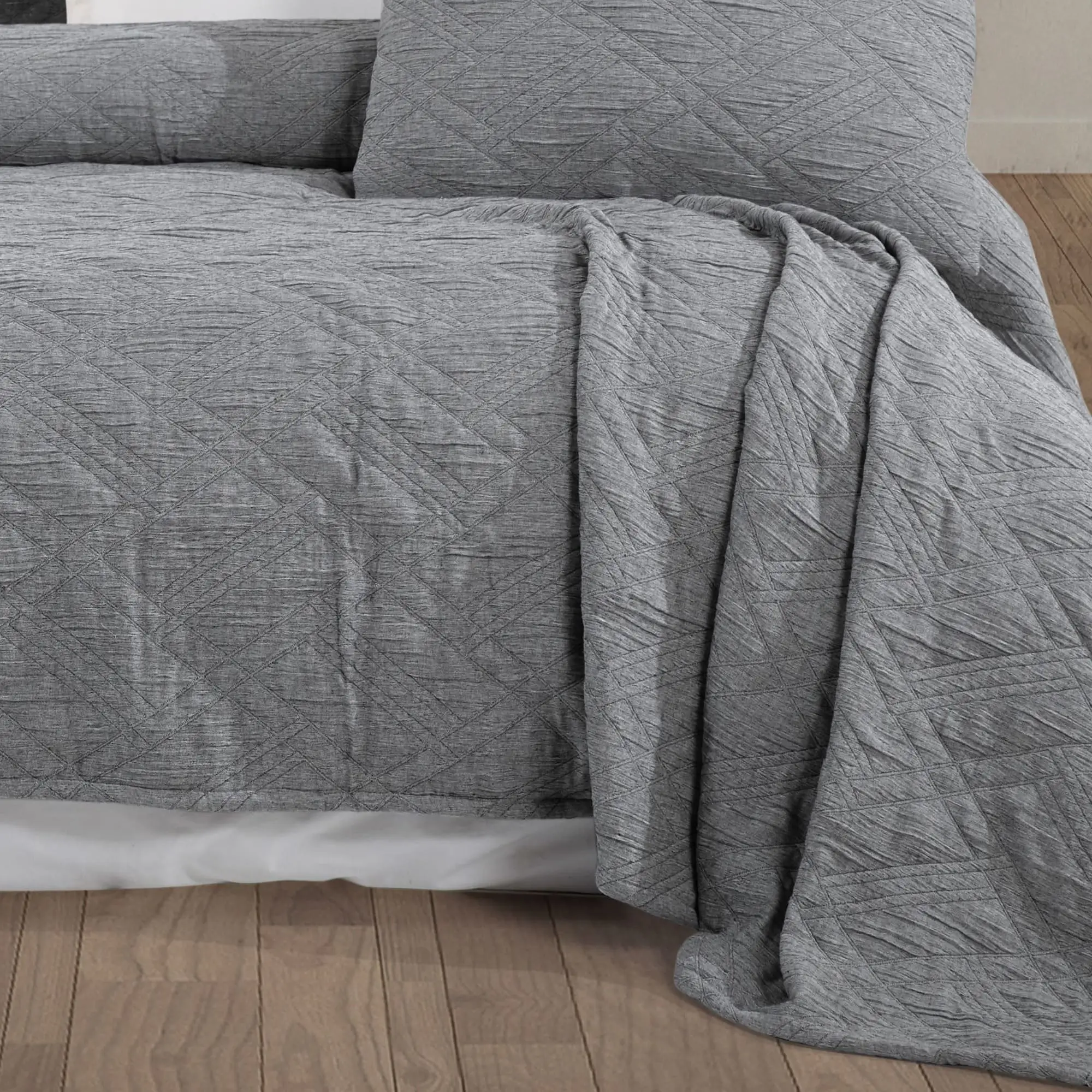 Melba Antrasit Rengi Çift Kişilik Yatak Örtüsü, sadece estetik değil, aynı zamanda rahatlık da sunar. Nefes alabilir pamuklu kumaşı, yaz, sonbahar ve ilkbahar mevsimlerinde rahatça kullanmanıza olanak tanır. İster yatak örtüsü olarak, ister dekoratif bir dokunuş olarak kullanabilirsiniz.