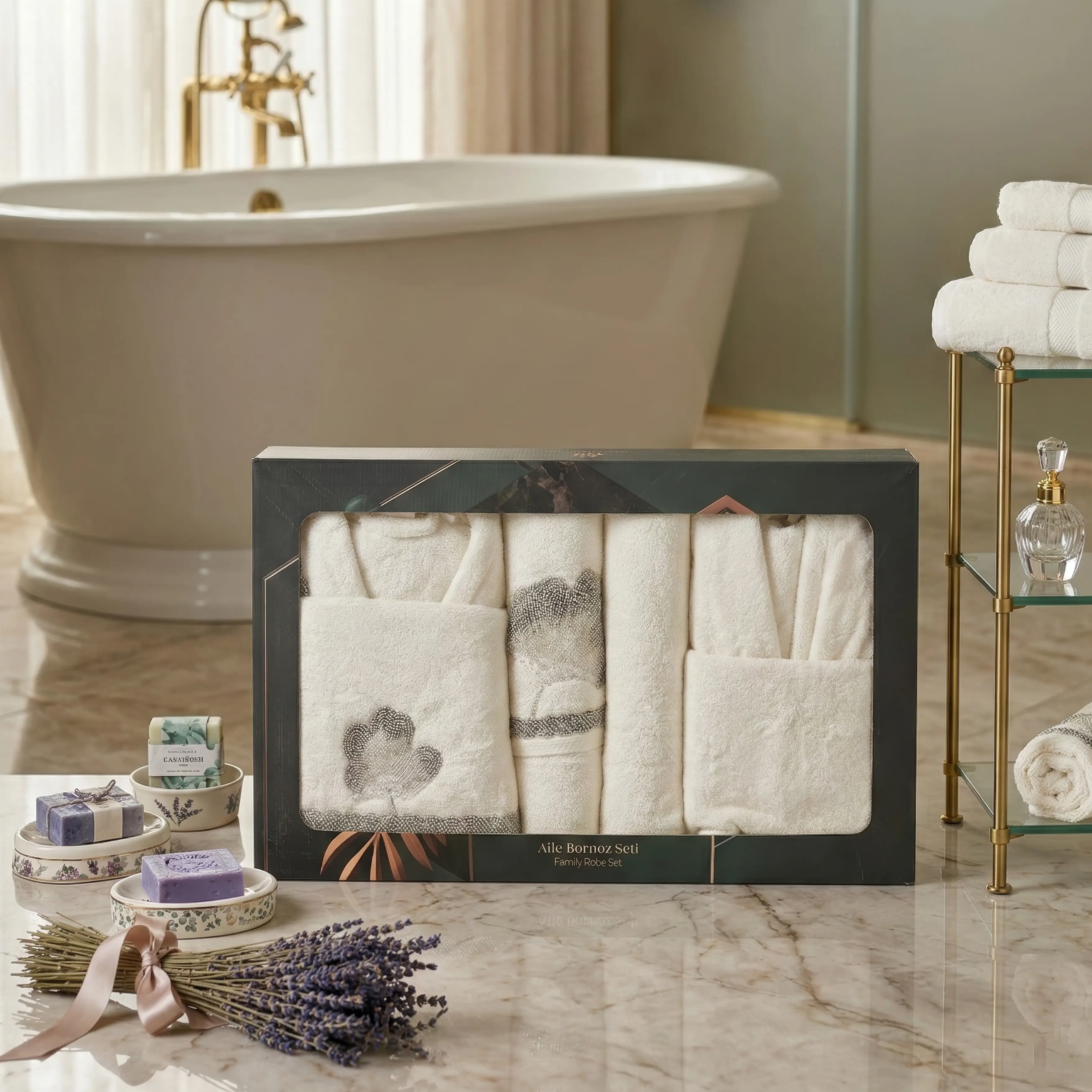 Gelince Haber VerMILA BAMBU AİLE BORNOZ SETİ, yüksek kalitede bambu içeriği ve taşlı işlemeleriyle özel hissettirir!