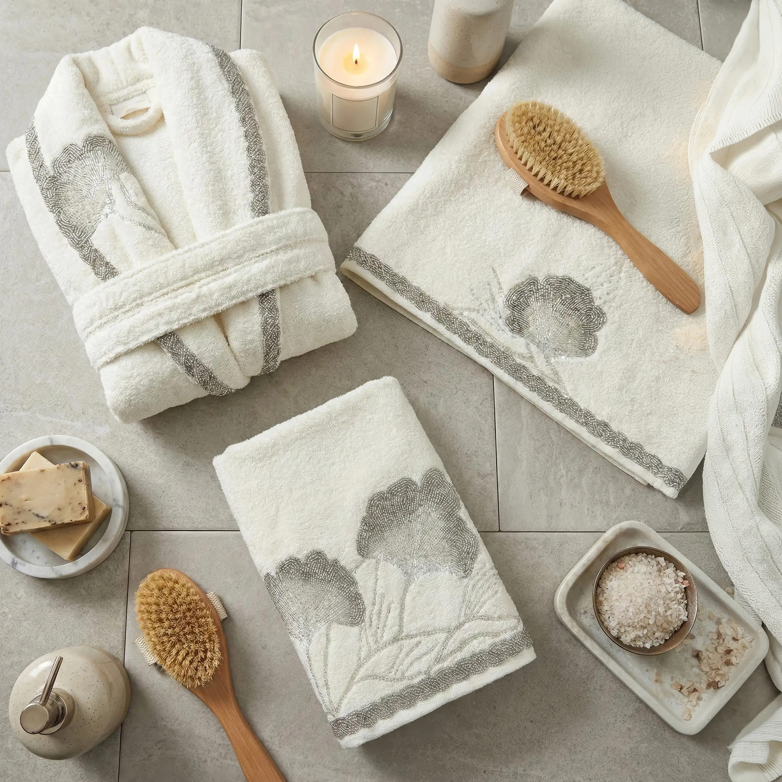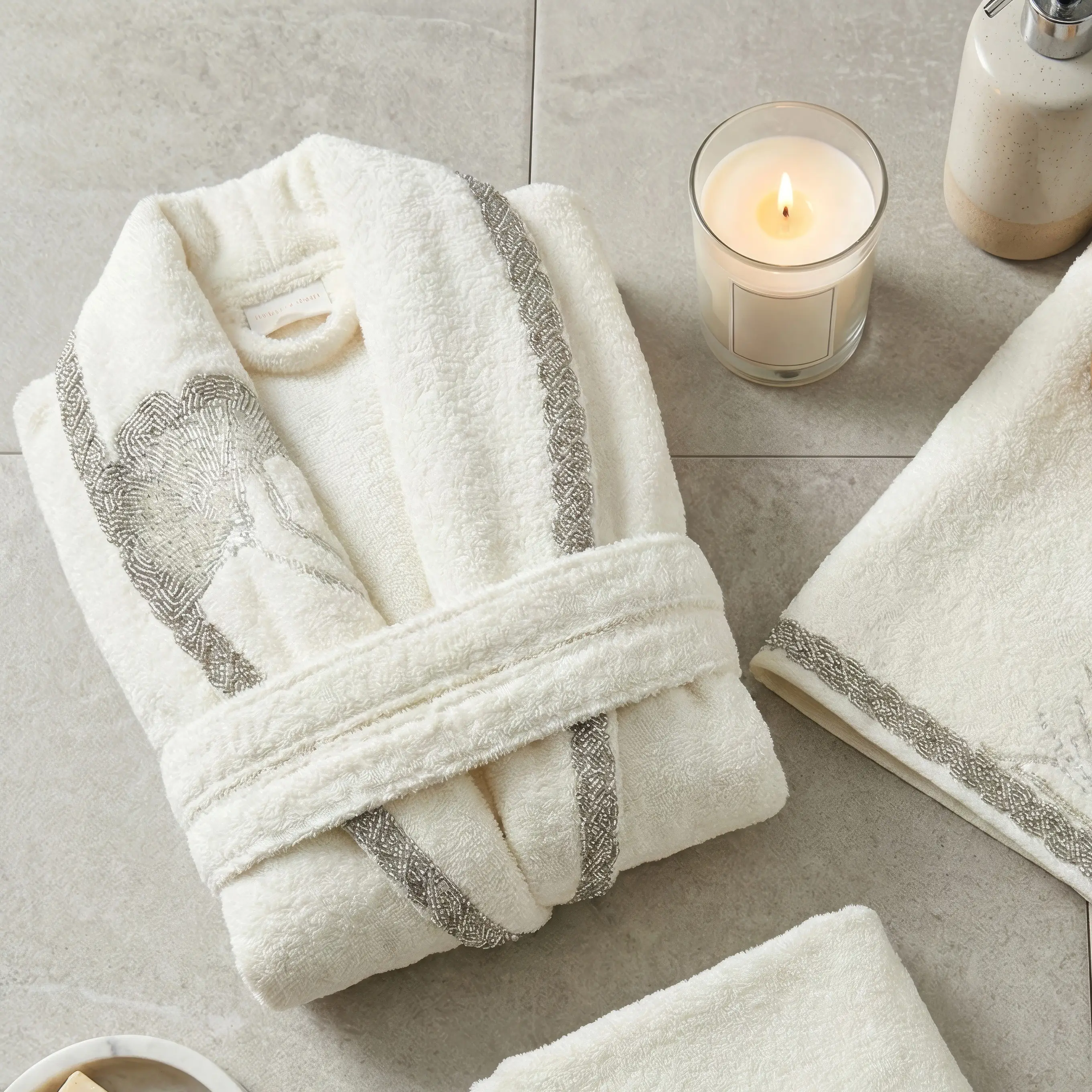 Doku: Yumuşak dokulu kumaşı, zarif floral desenli taşlı işlemeleri ve krem tonlarının huzur veren etkisiyle hem günlük kullanım hem de özel anlar için ideal bir tercihtir.