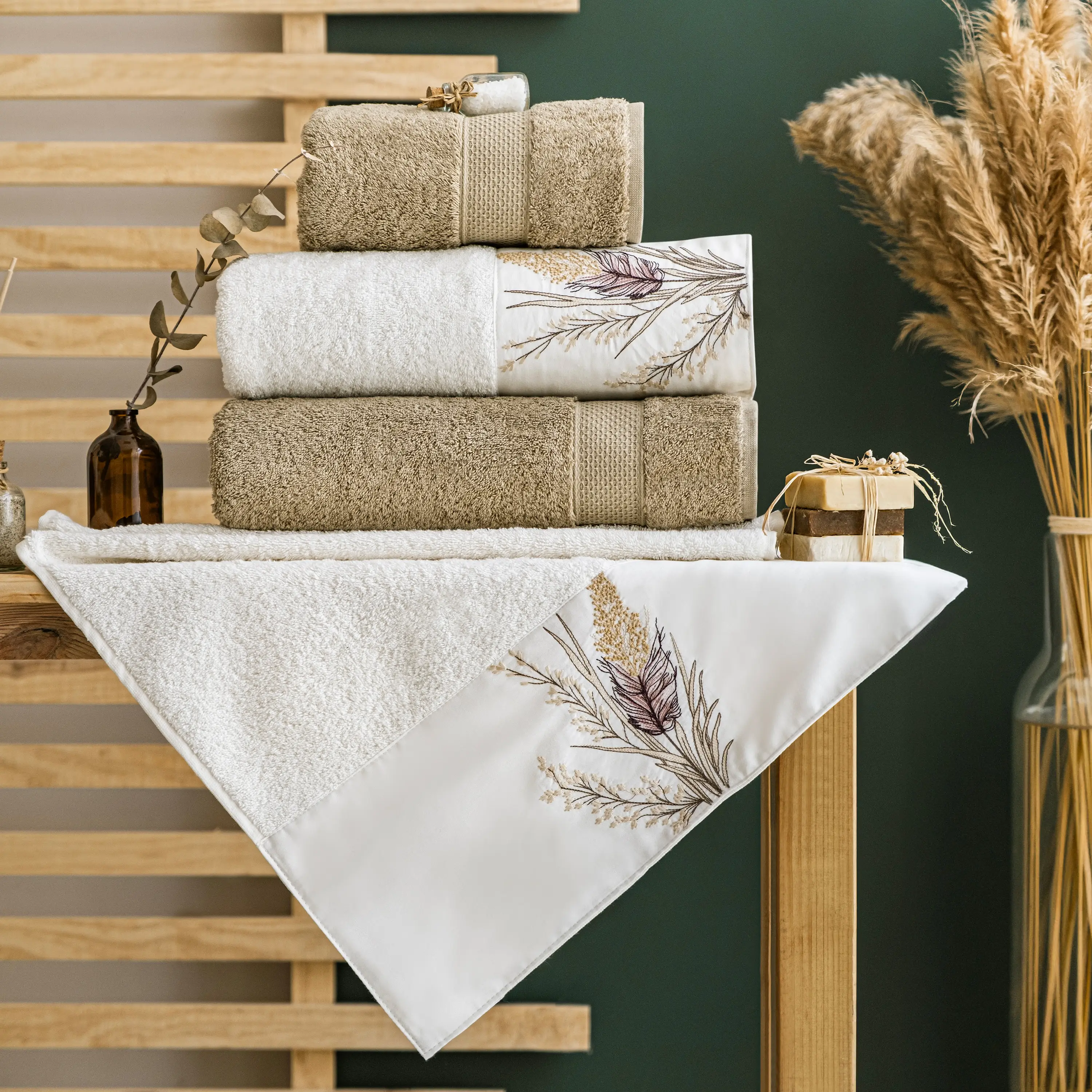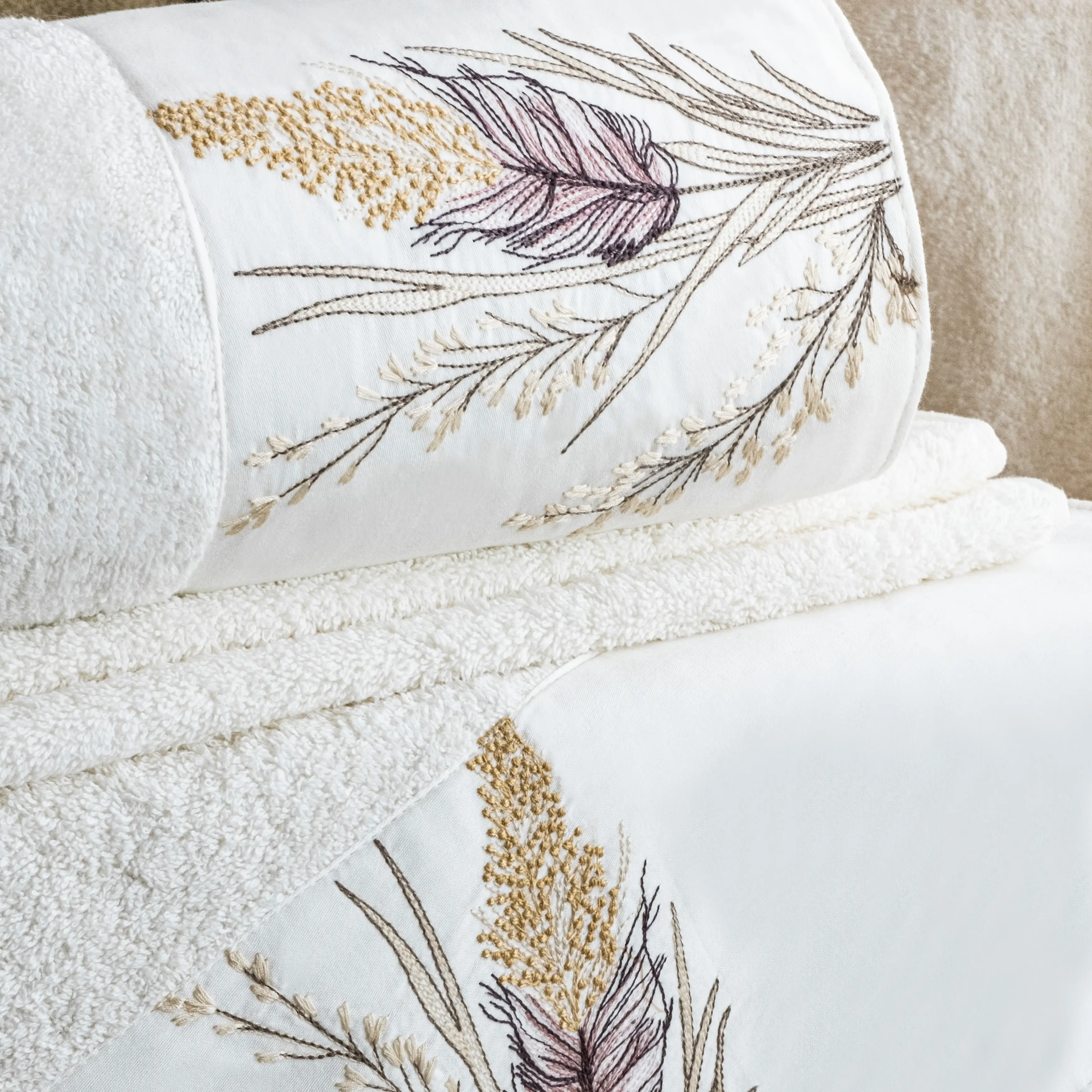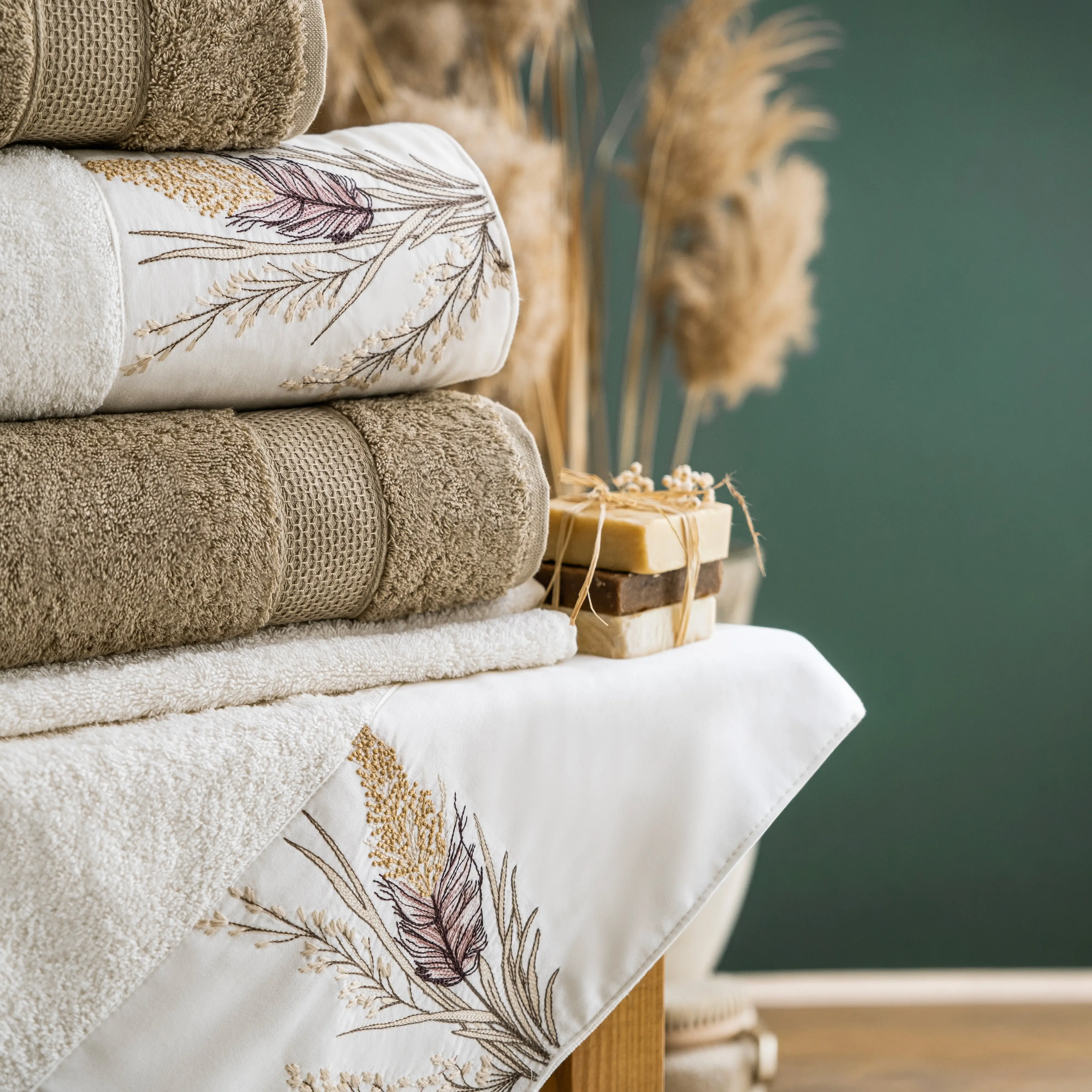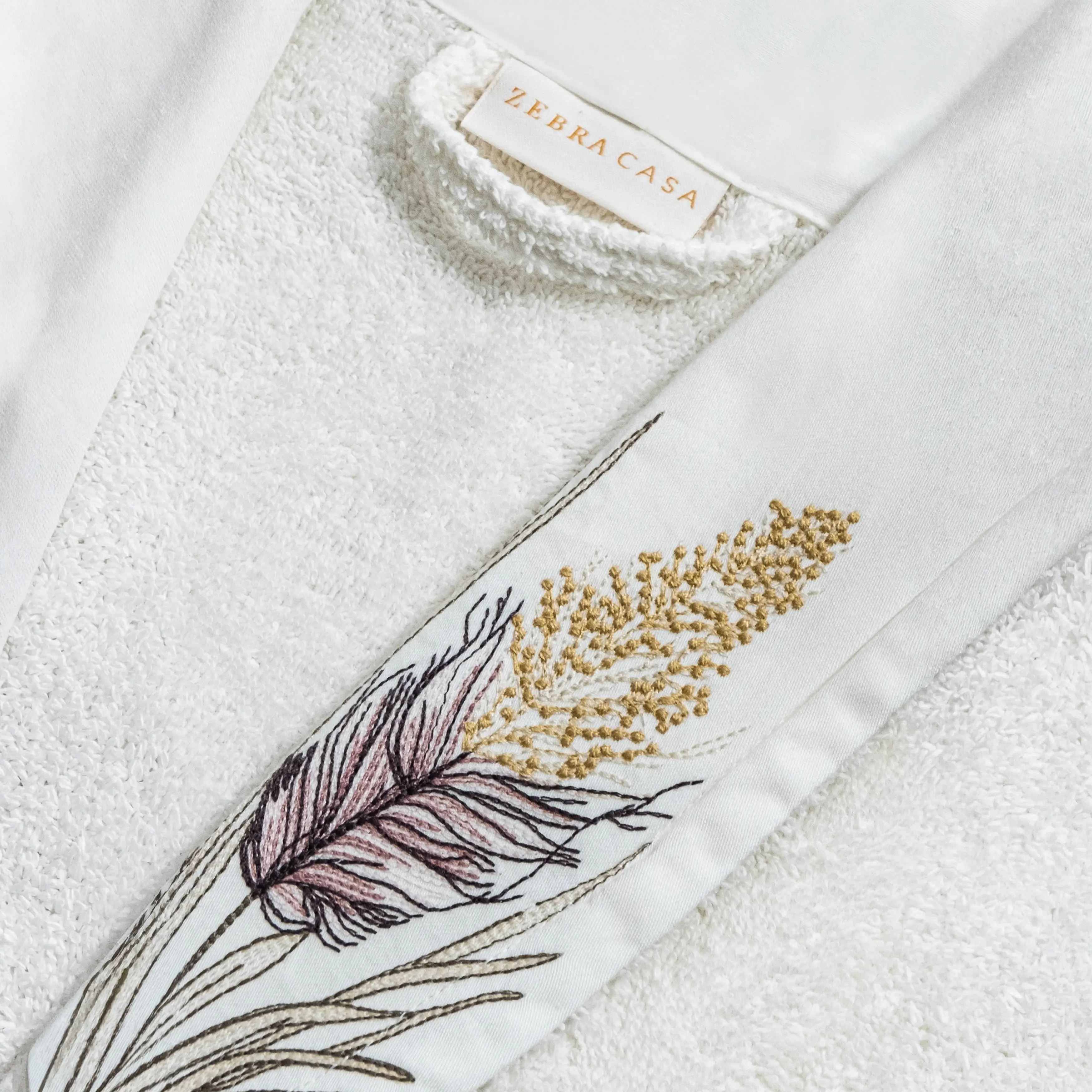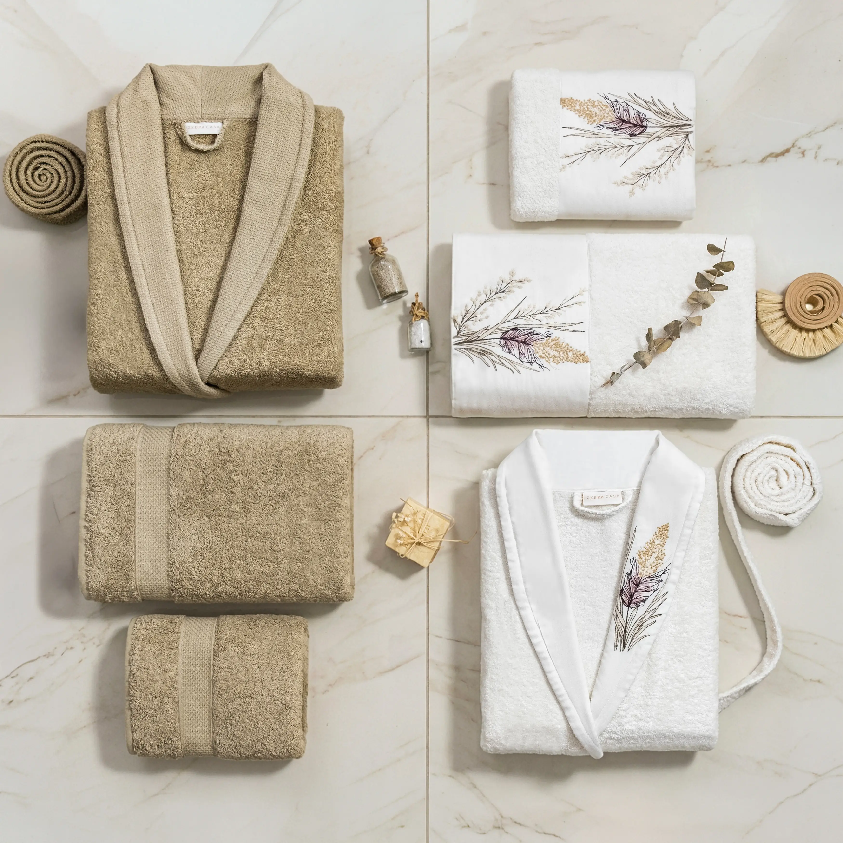 Setin en dikkat çekici özelliklerinden biri, bornoz ve havlu kenarlarında yer alan doğal bitki motifli nakış tasarımlarıdır. Bu detaylar ürüne zarif ve sofistike bir görünüm kazandırır.