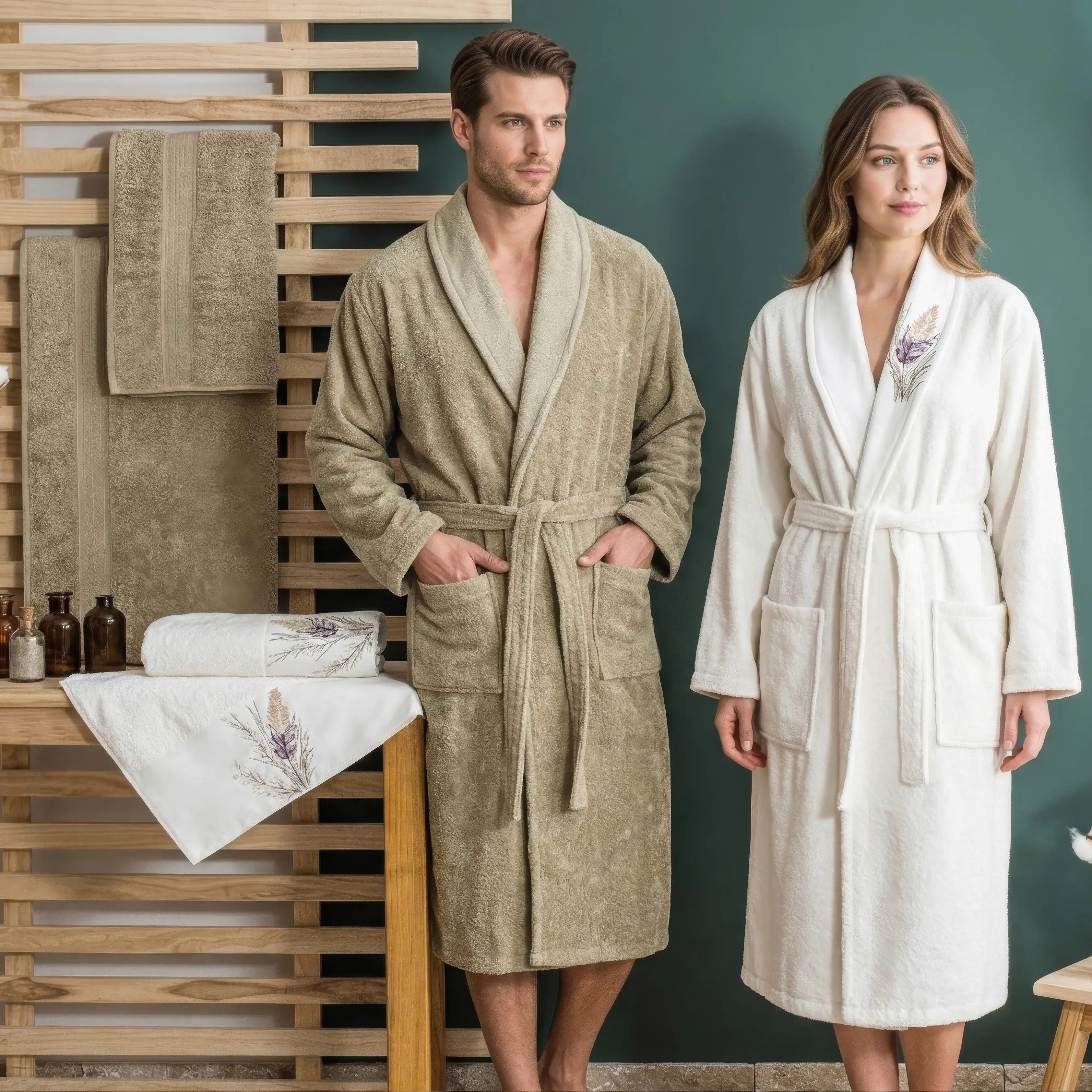 Nakışlı aile bornoz seti, kadın ve erkek bornozları ile uyumlu havlulardan oluşan kapsamlı bir set olarak tasarlanmıştır. Böylece hem günlük kullanım hem de misafirler için pratik ve estetik bir çözüm sunar.