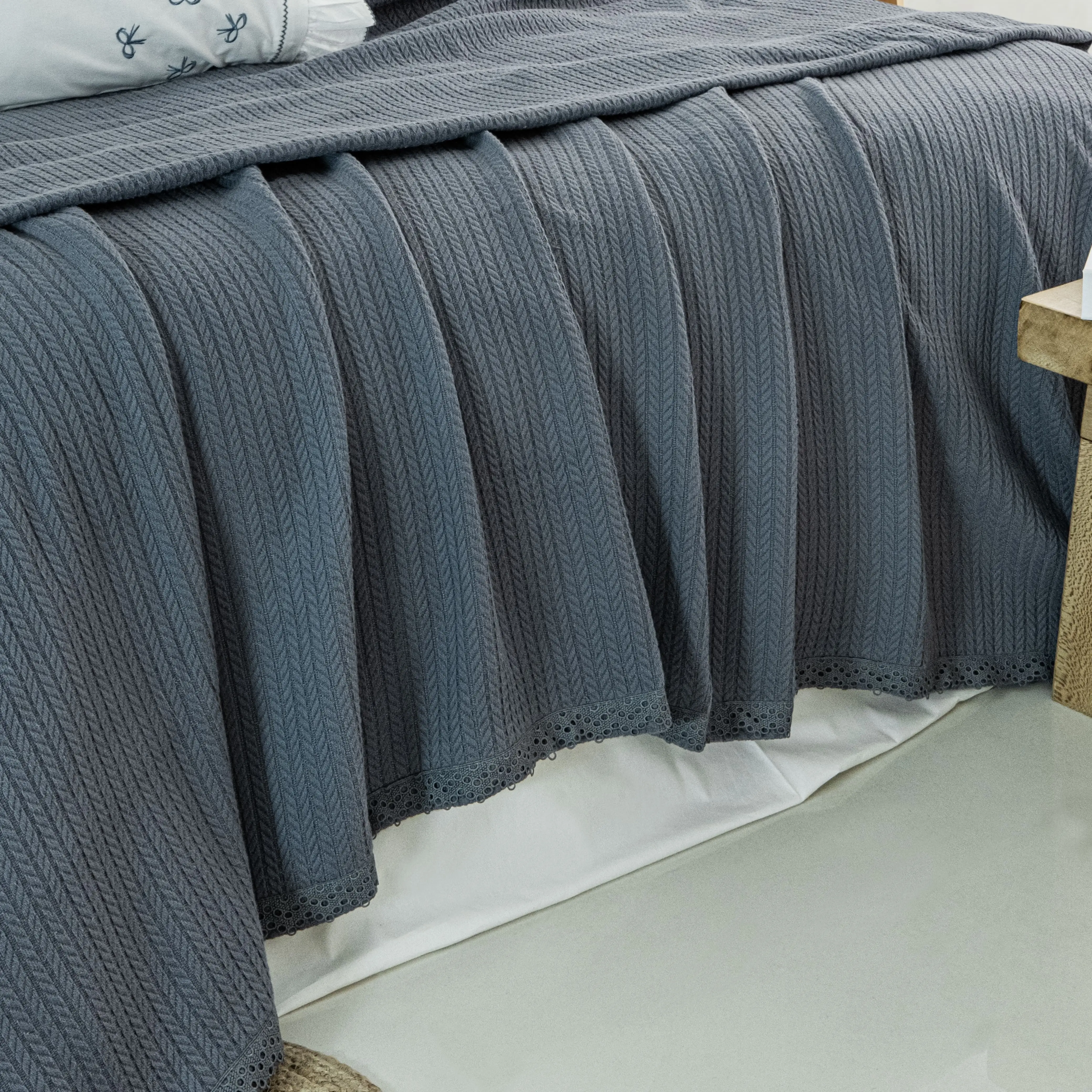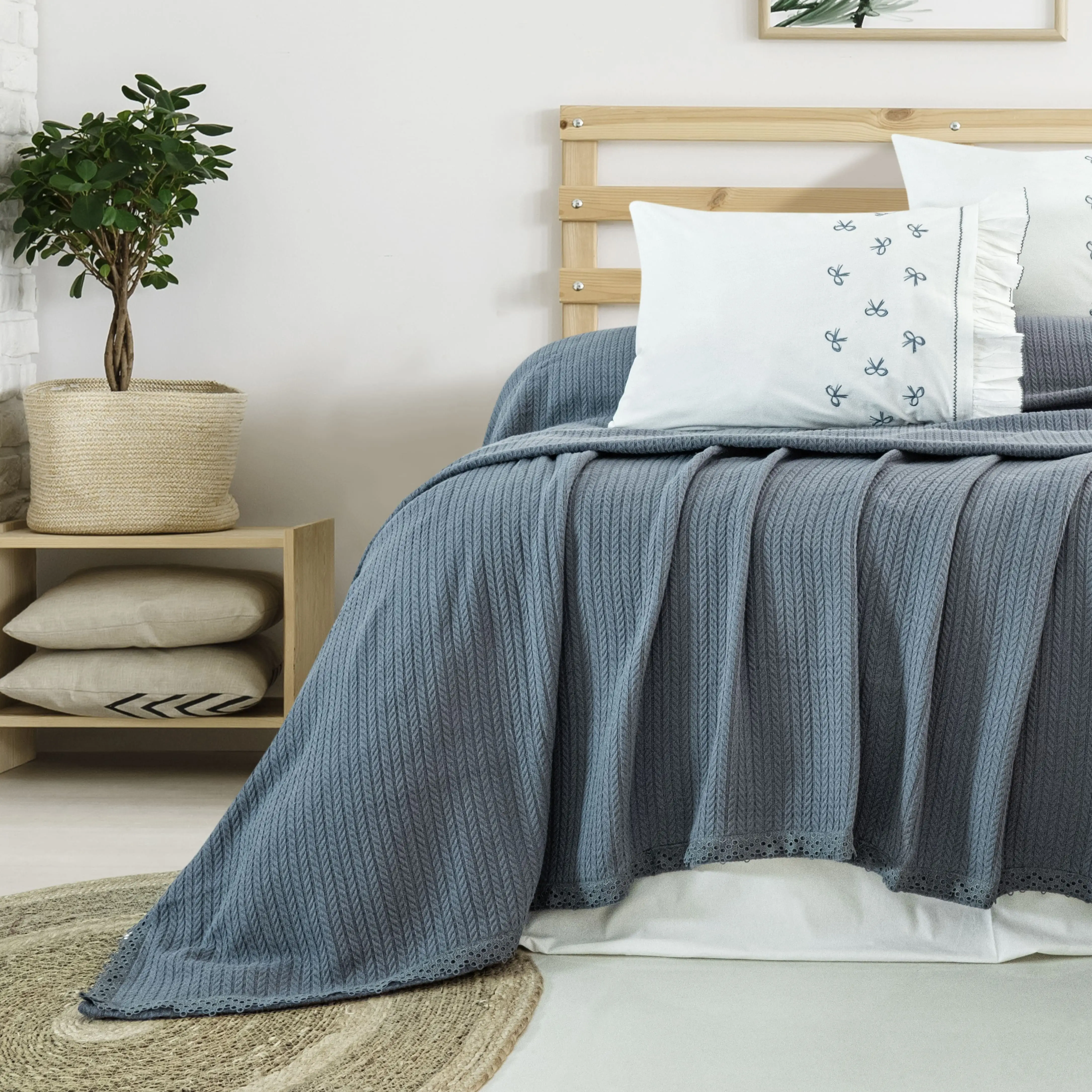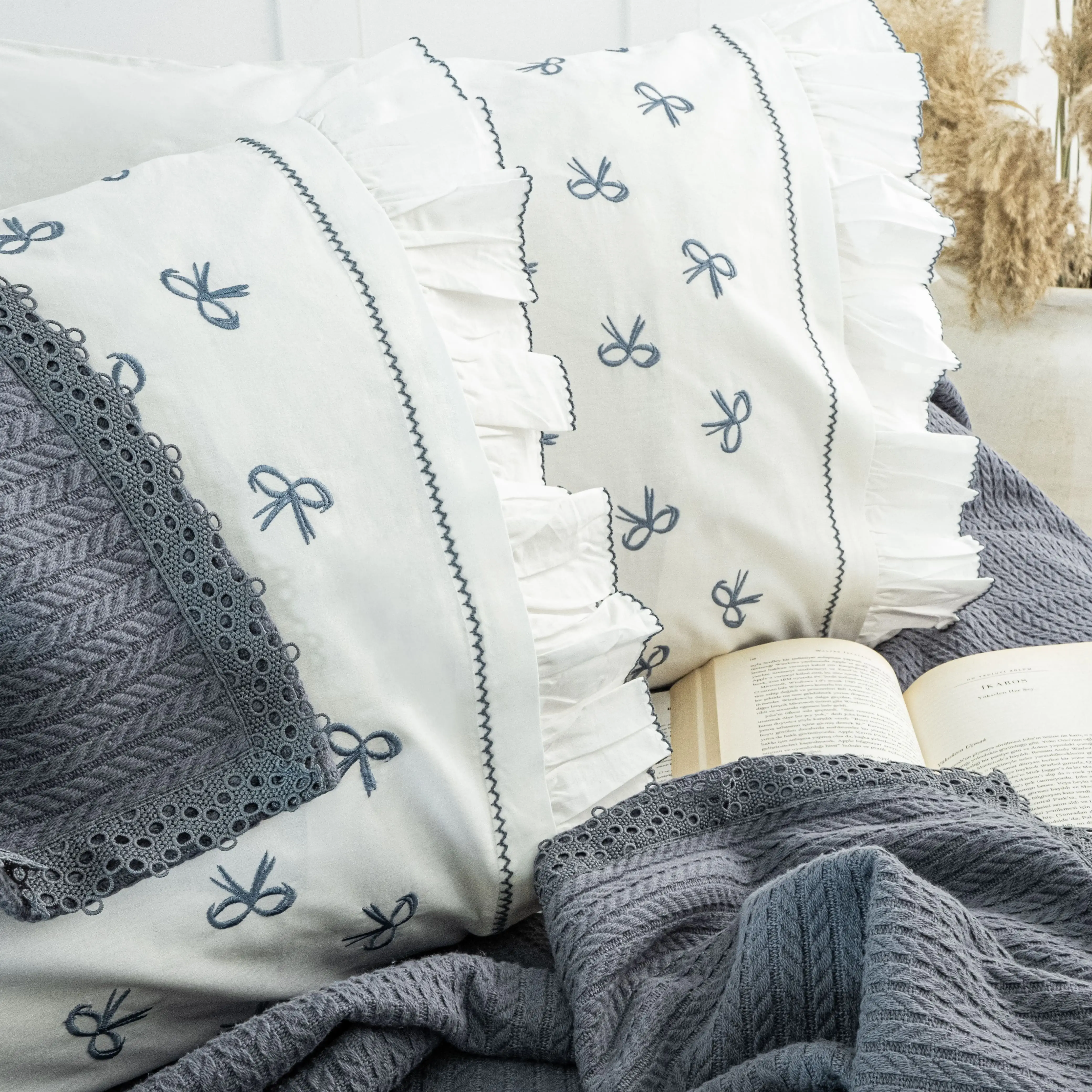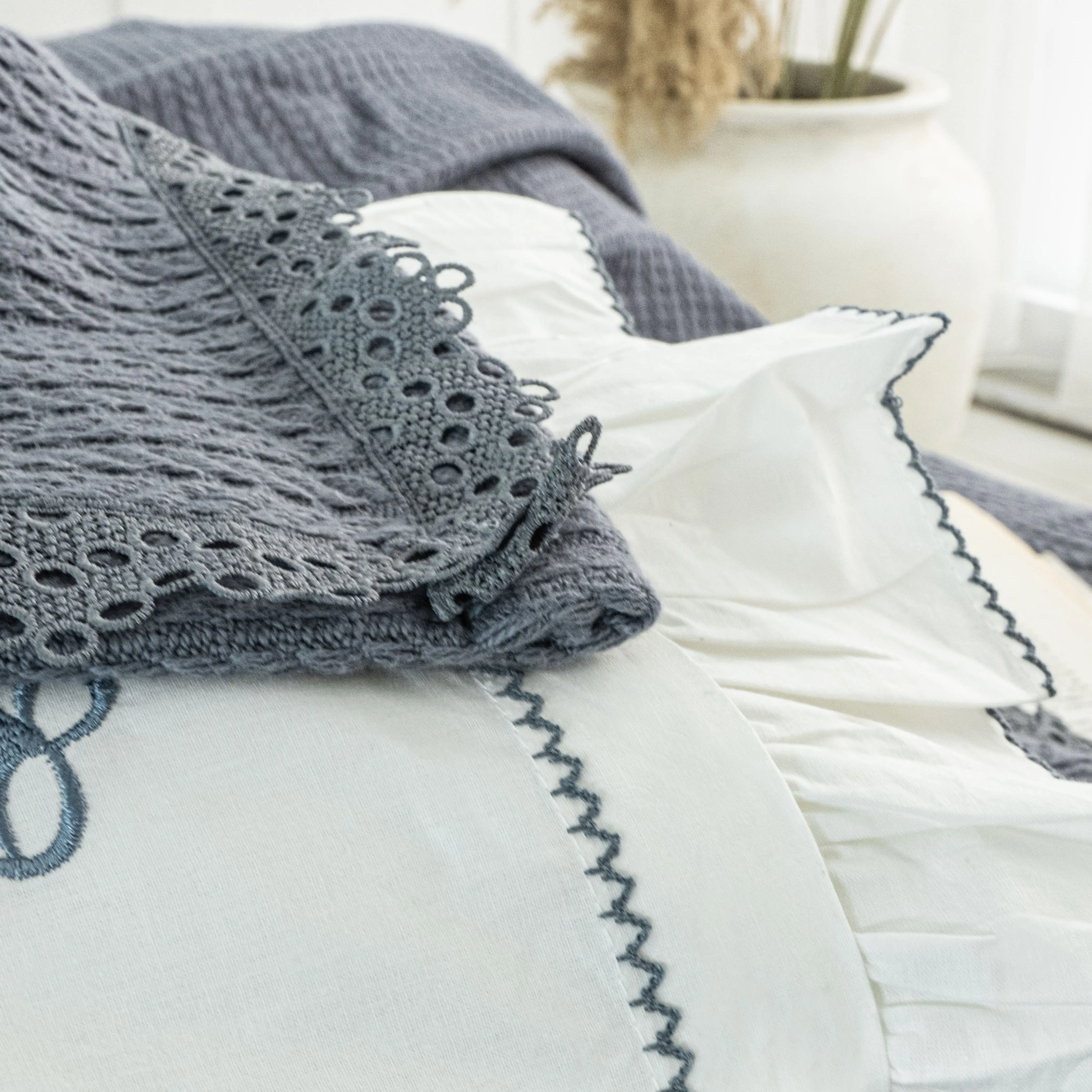 Yumuşak, nefes alabilen ve ciltle temasa uygun pamuklu kumaş tercih edilmiştir. Yastıkların ve nevresimin etrafındaki volanlı (fırfırlı) antrasit rengi dikişler ürüne hem nostaljik hem de feminen bir hava katıyor. Nakışın verdiği romantik ve dekoratif hissi benzer şekilde yansıtıyor. Fırfırların dikiş rengiyle uyum sağlayan antrasit pikenin yumuşak dokusu ve etek uçlarındaki dantel şeritleri dokusunu tamamlamaktadır.