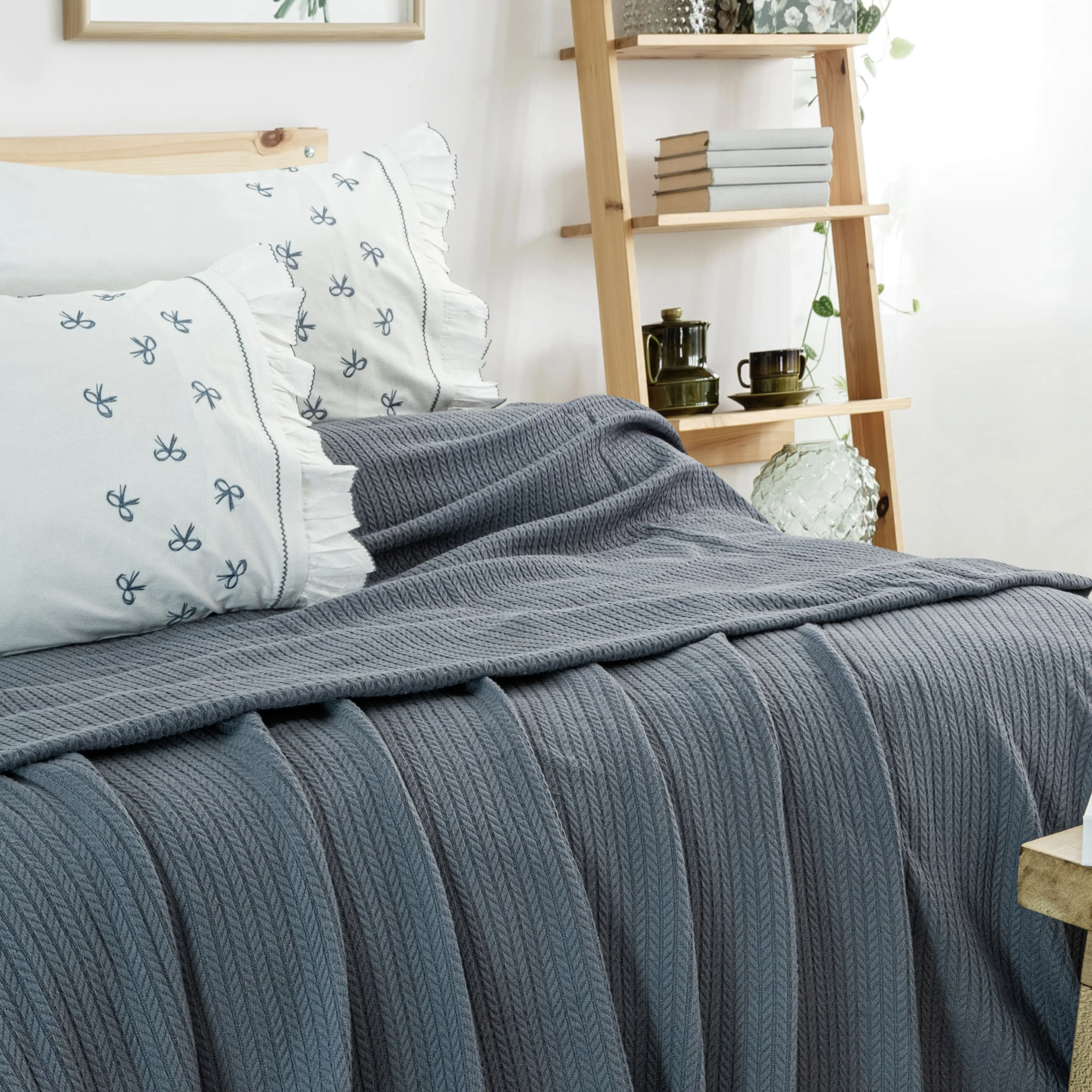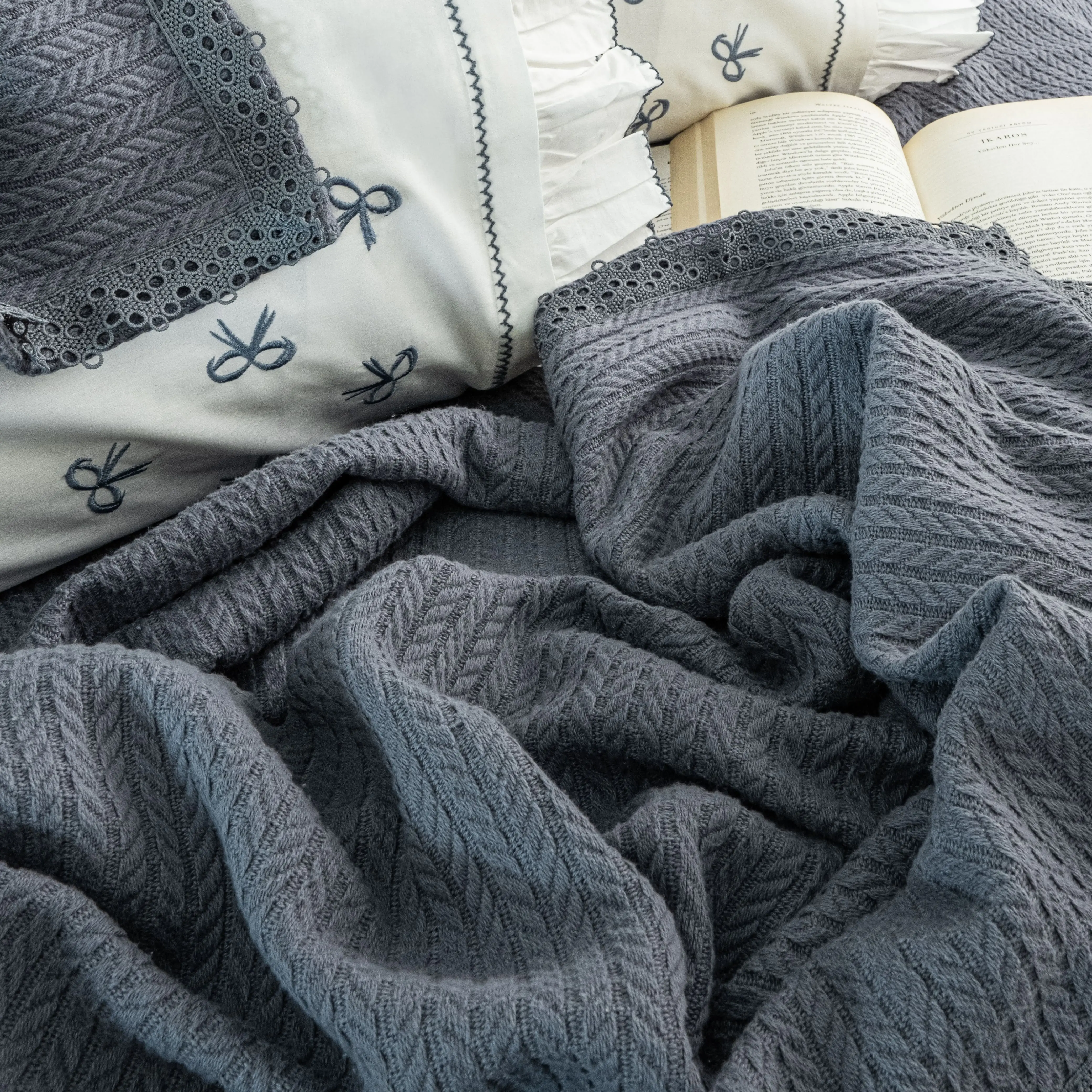 Nevresim takımının ana rengi kremdir; bu, sadelik hissini ön plana çıkarırken, üzerine işlenmiş fiyonk desenleri romantik ve huzurlu kontrast oluşturulmuştur. Fiyon desenleri tüm yüzeye eşit aralıklarla serpiştirilmiş olup görünümünü hem düzenli hem de canlı kılmıştır. Fiyonk desenlerinin soft tonu nevresimle hoş bir uyum içinde, gözü yormayan ama dikkat çeken bir detay sunar. Fiyonk desenleri ile birlikte haki antrasit pikenin örgü desenleri bir harmoni yakalarak yatak odanızda soft bir hava oluşturur.