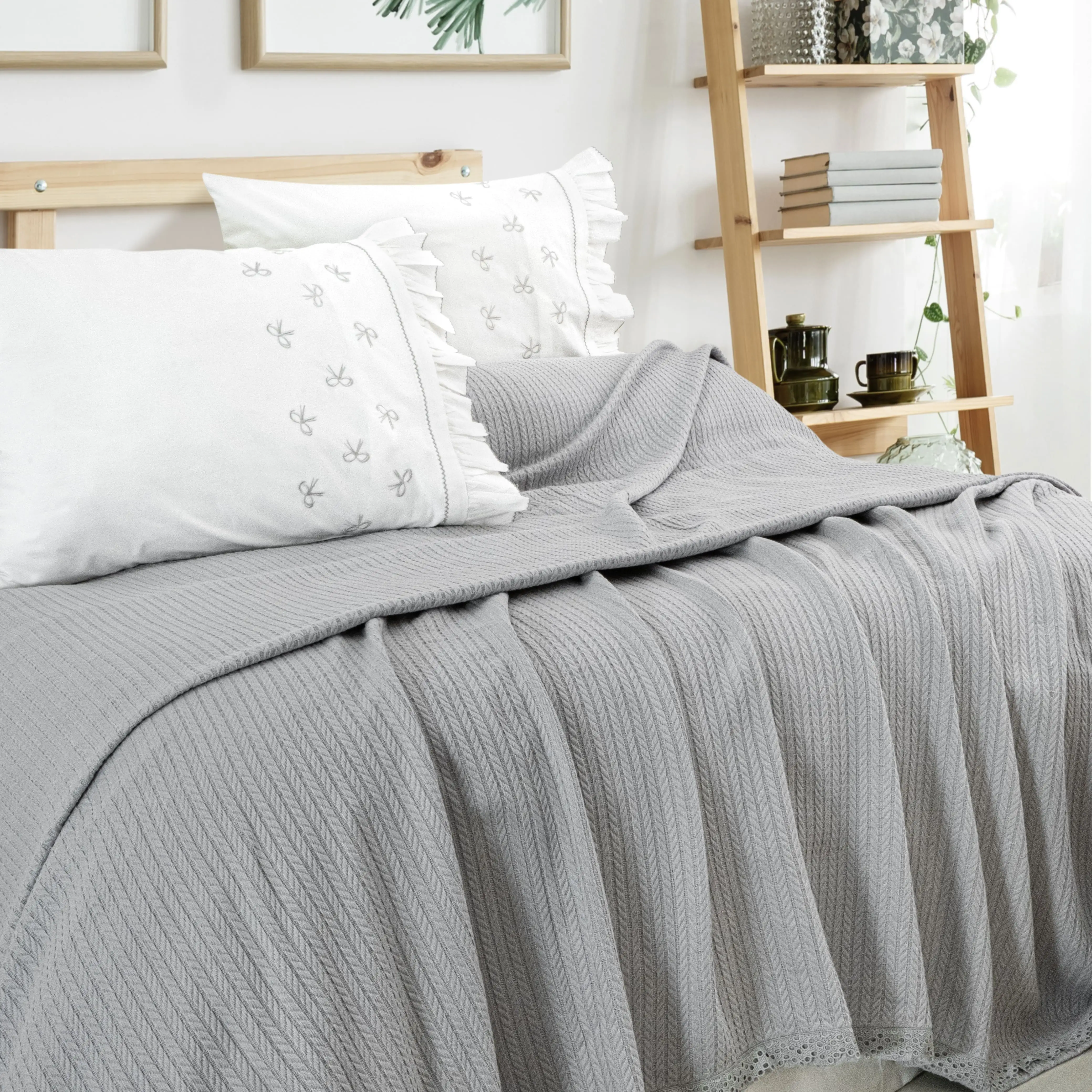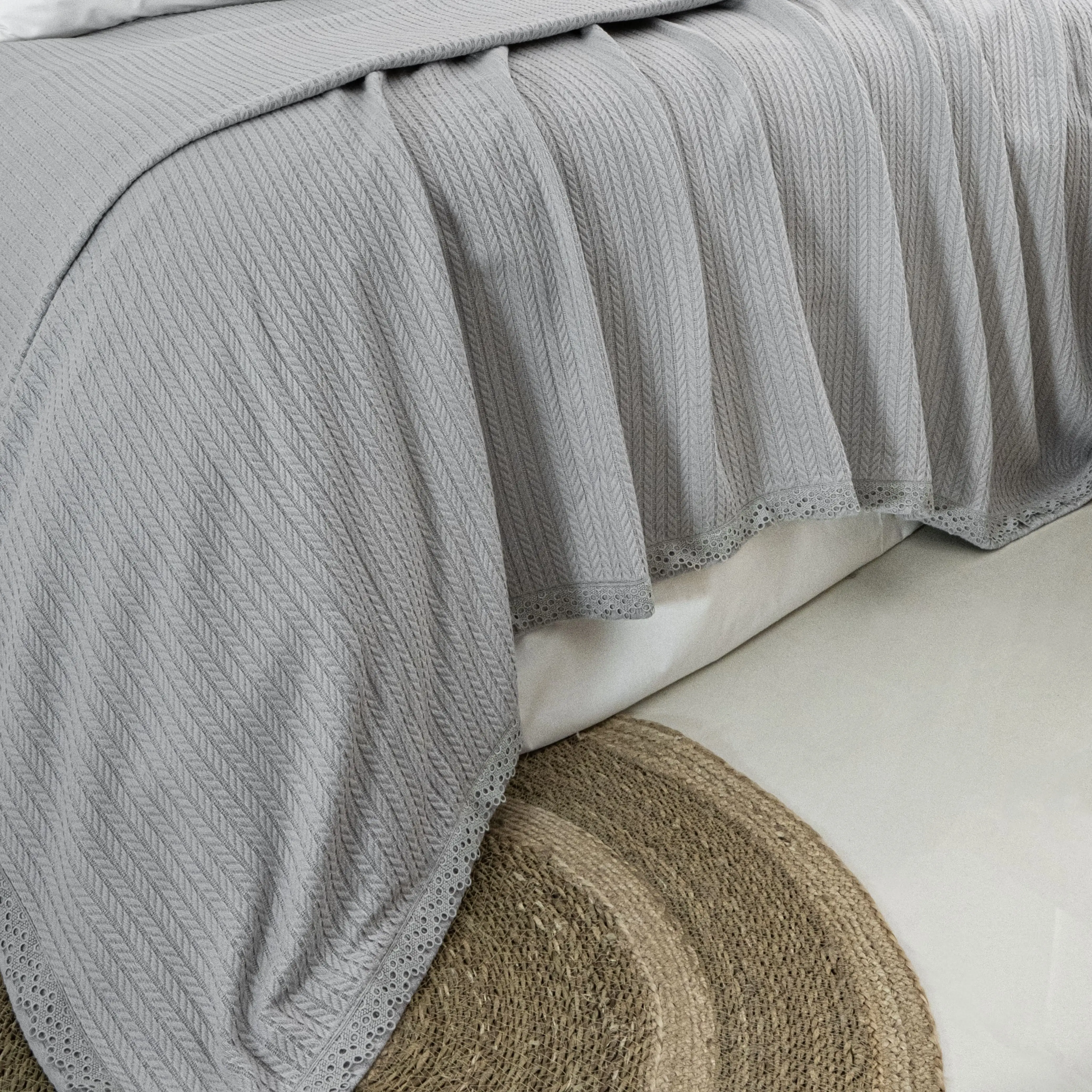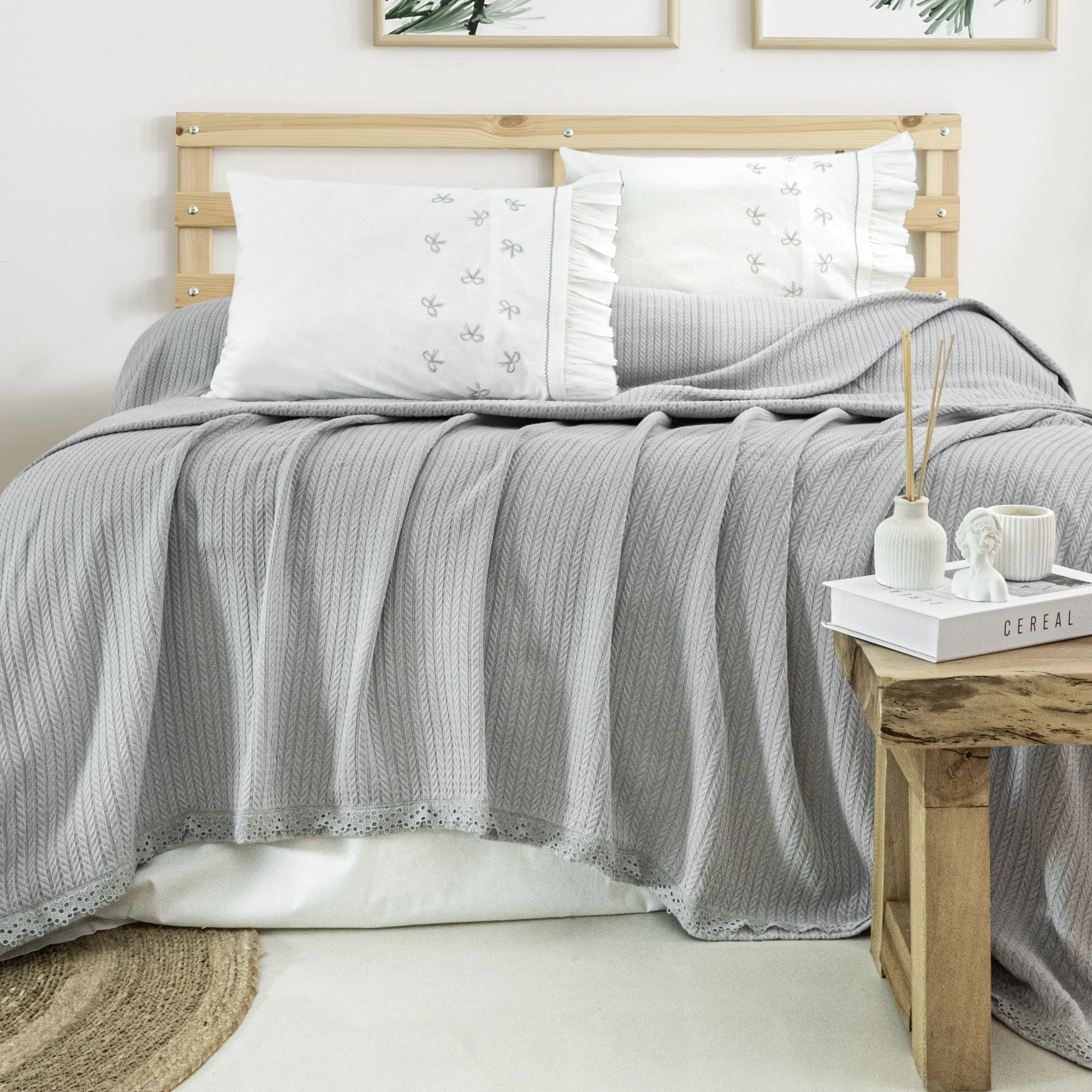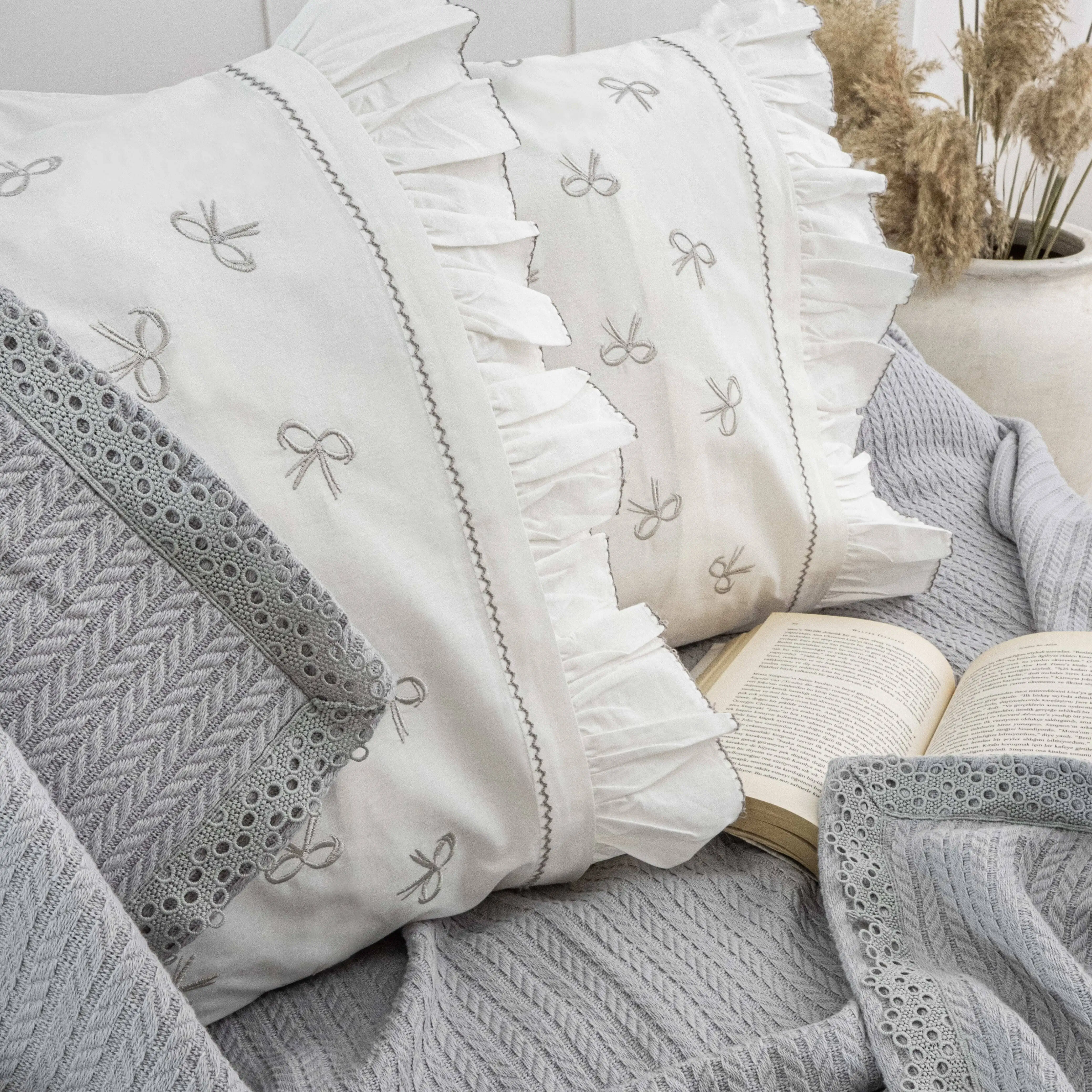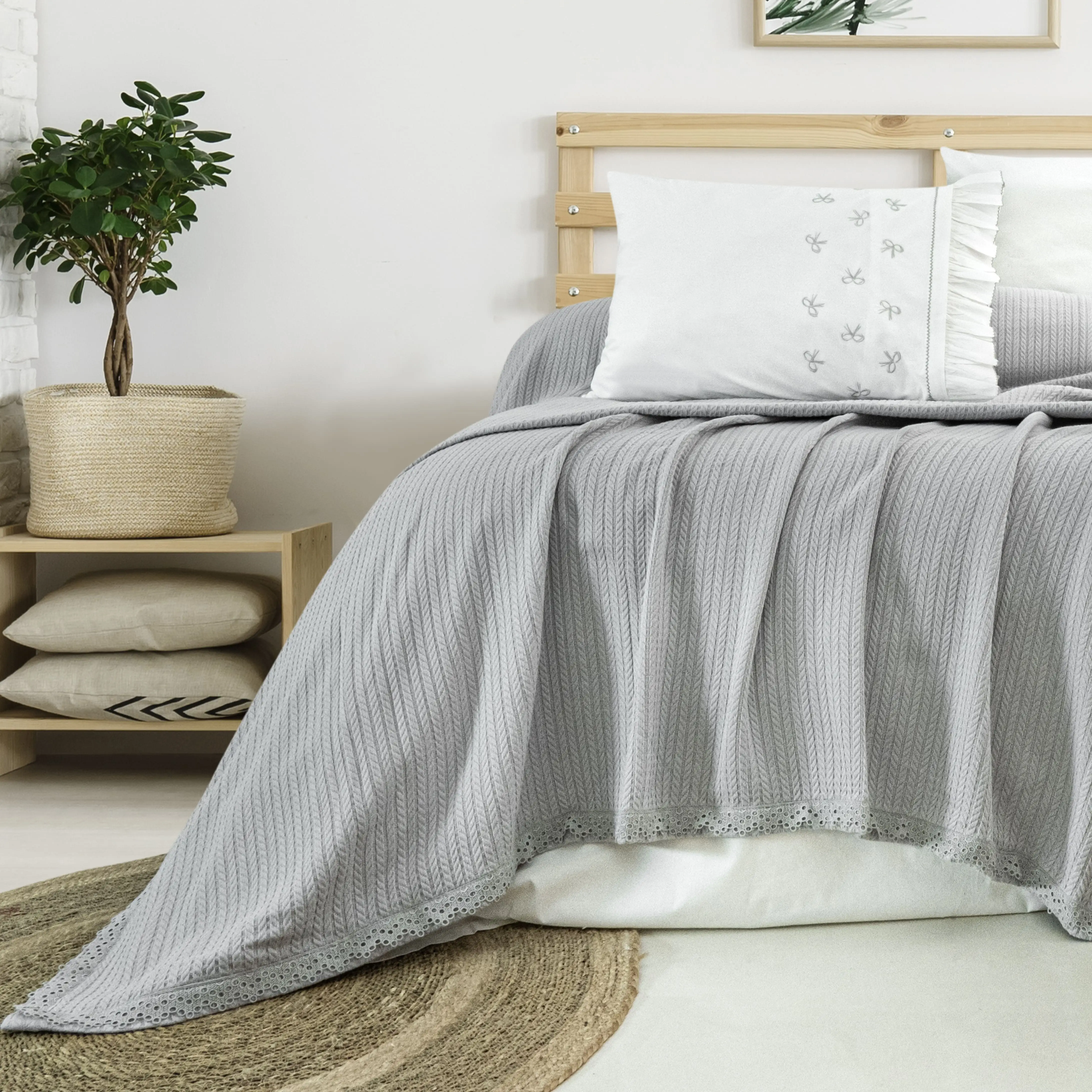 Nevresim takımının ana rengi kremdir; bu, sadelik hissini ön plana çıkarırken, üzerine işlenmiş fiyonk desenleri romantik ve huzurlu kontrast oluşturulmuştur. Fiyon desenleri tüm yüzeye eşit aralıklarla serpiştirilmiş olup görünümünü hem düzenli hem de canlı kılmıştır. Fiyonk desenlerinin soft tonu nevresimle hoş bir uyum içinde, gözü yormayan ama dikkat çeken bir detay sunar. Fiyonk desenleri ile birlikte gri rengi pikenin örgü desenleri bir harmoni yakalarak yatak odanızda soft bir hava oluşturur.