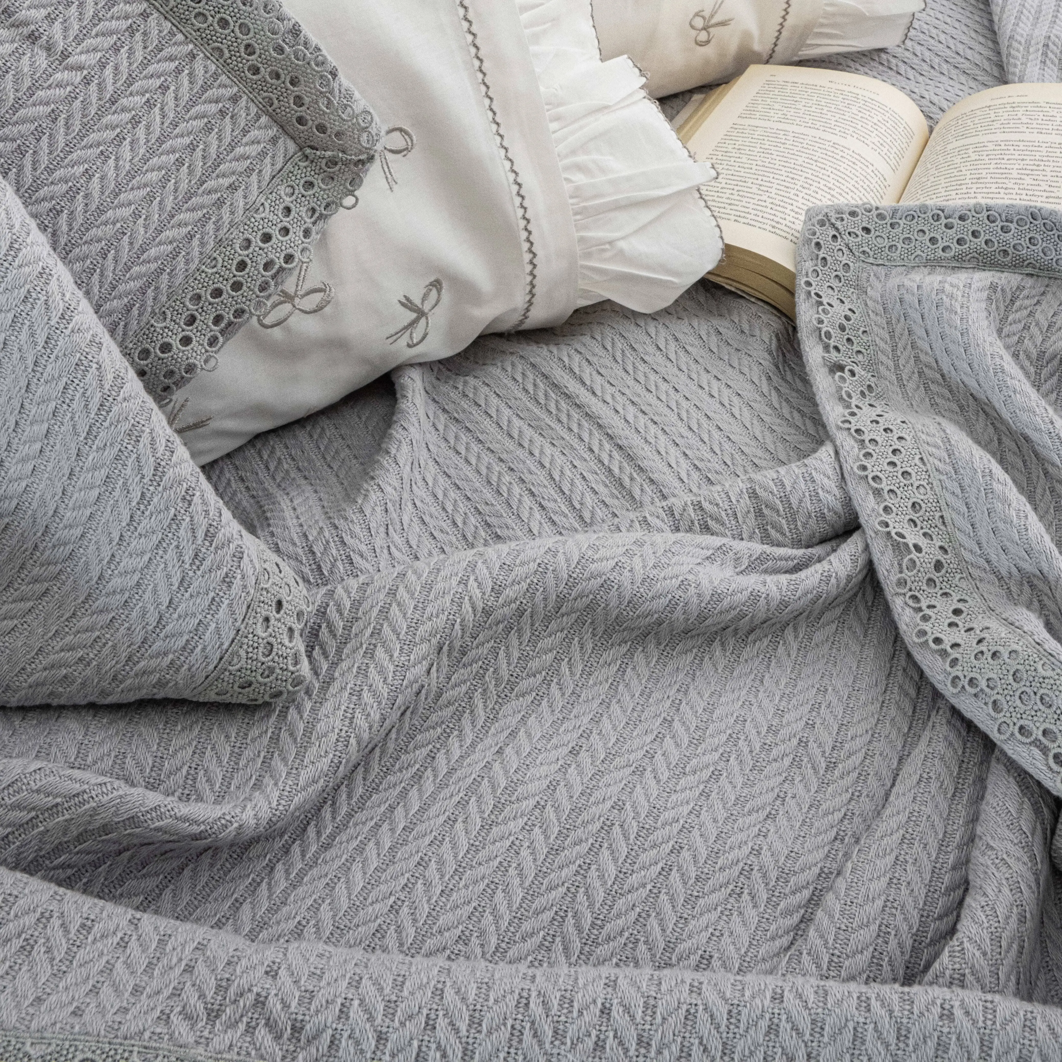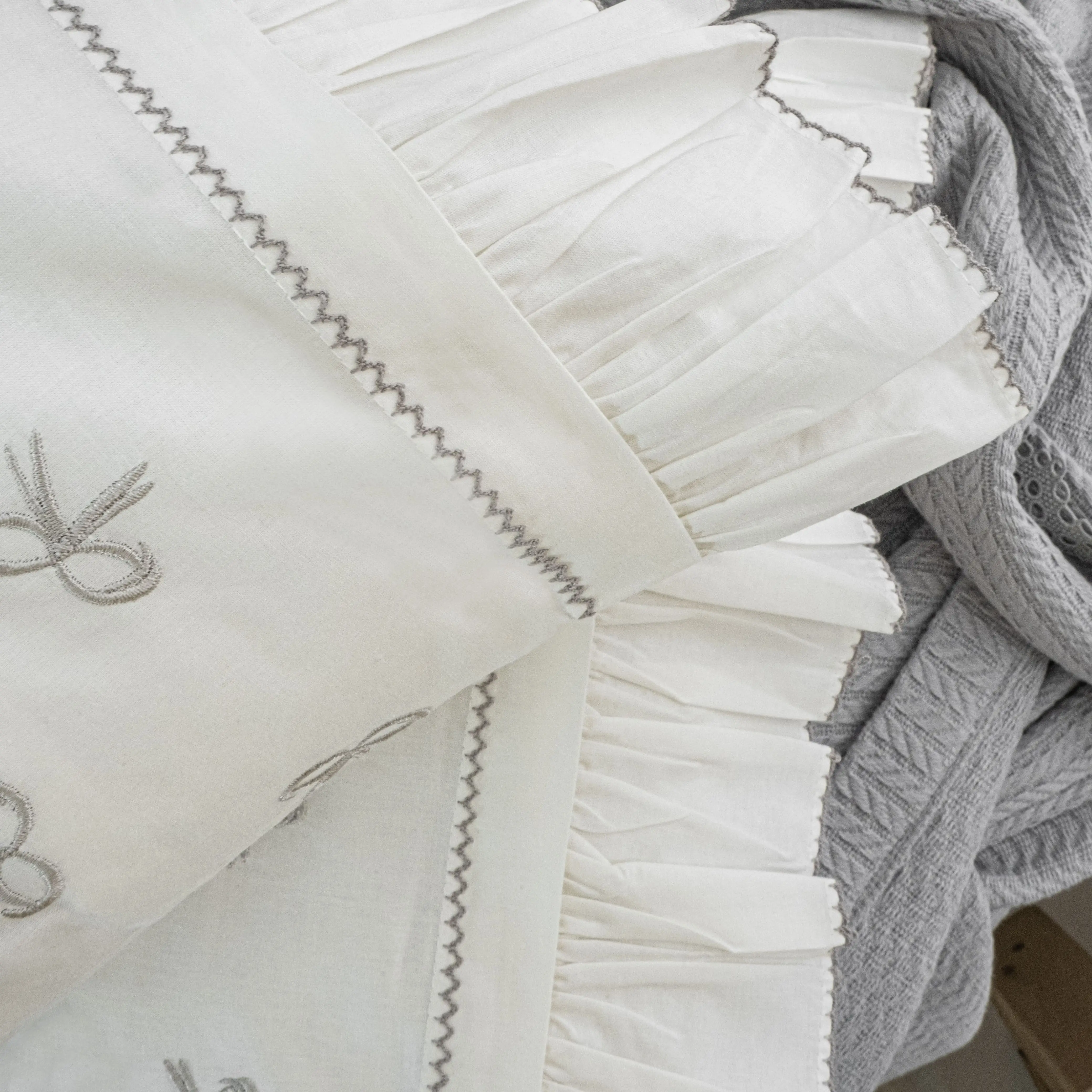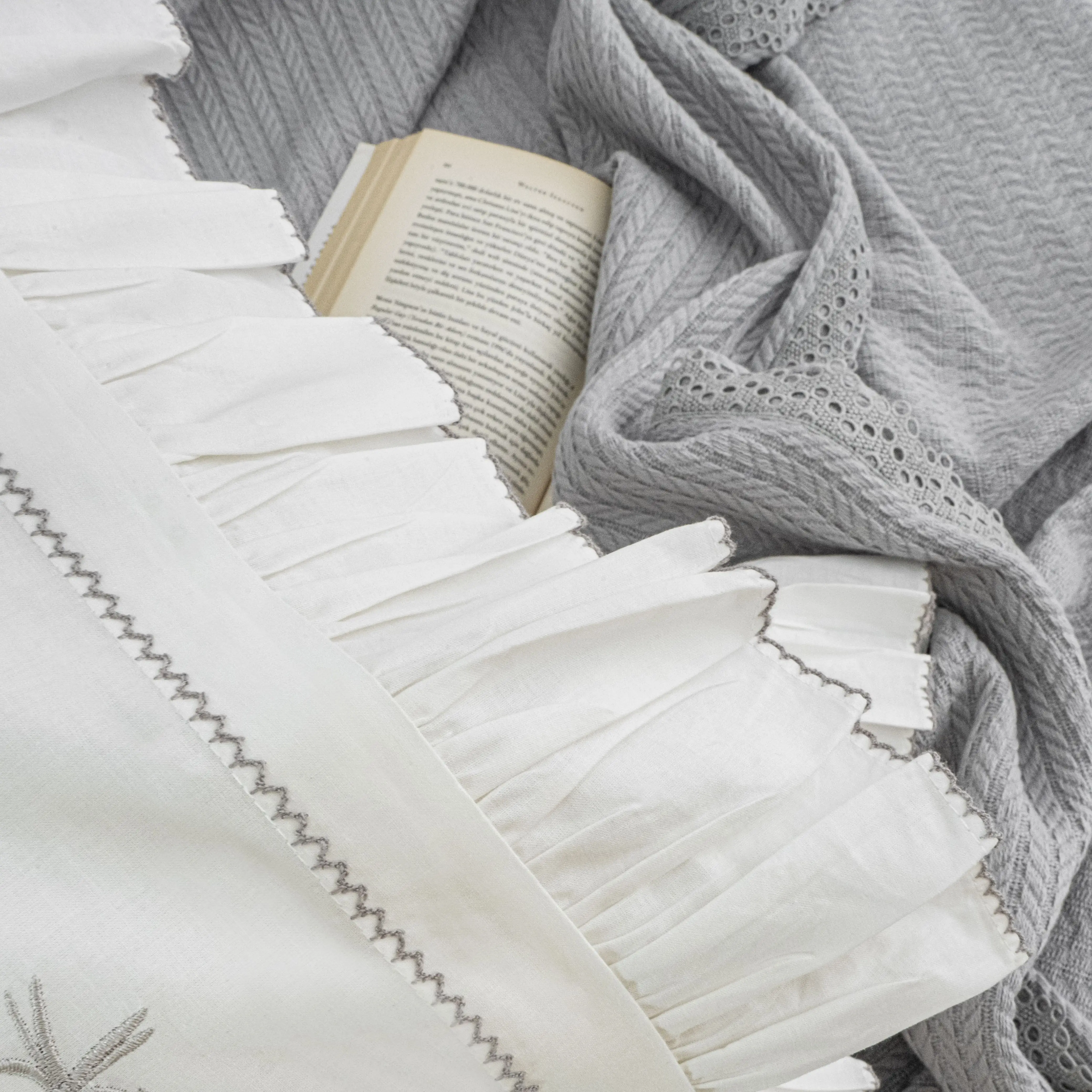 Yumuşak, nefes alabilen ve ciltle temasa uygun pamuklu kumaş tercih edilmiştir. Yastıkların ve nevresimin etrafındaki volanlı (fırfırlı) gri rengi dikişler ürüne hem nostaljik hem de feminen bir hava katıyor. Nakışın verdiği romantik ve dekoratif hissi benzer şekilde yansıtıyor. Fırfırların dikiş rengiyle uyum sağlayan gri pikenin yumuşak dokusu ve etek uçlarındaki dantel şeritleri dokusunu tamamlamaktadır.