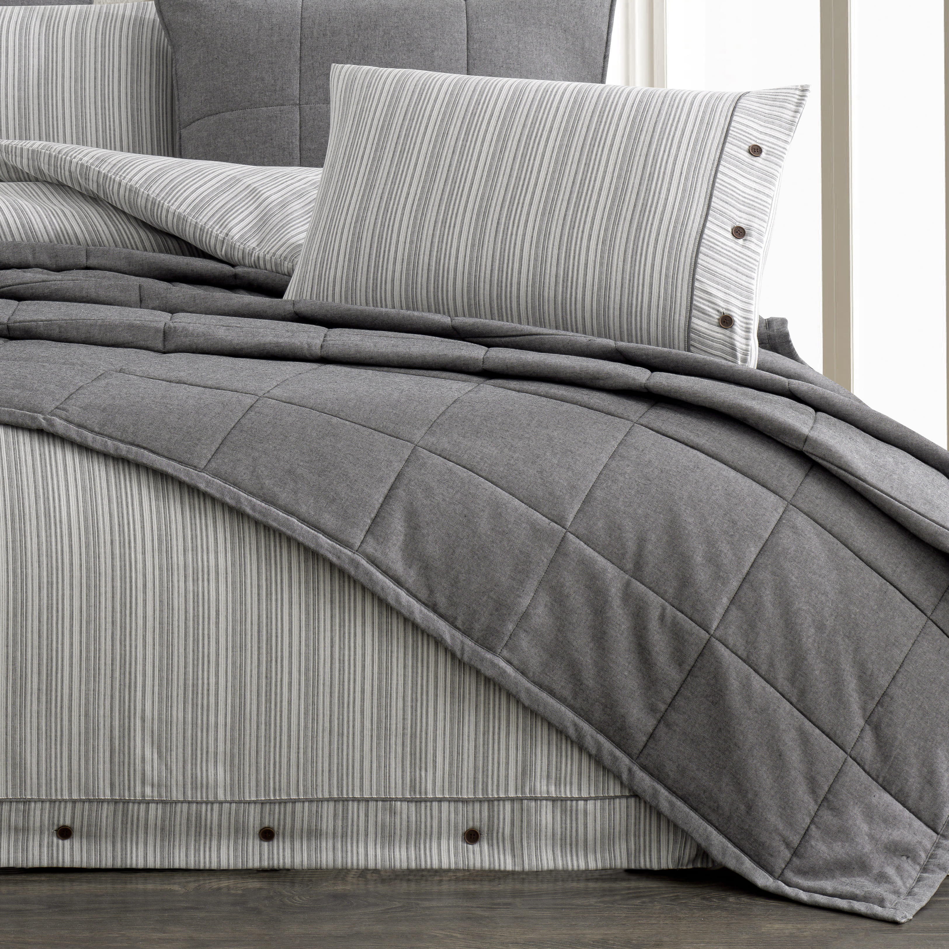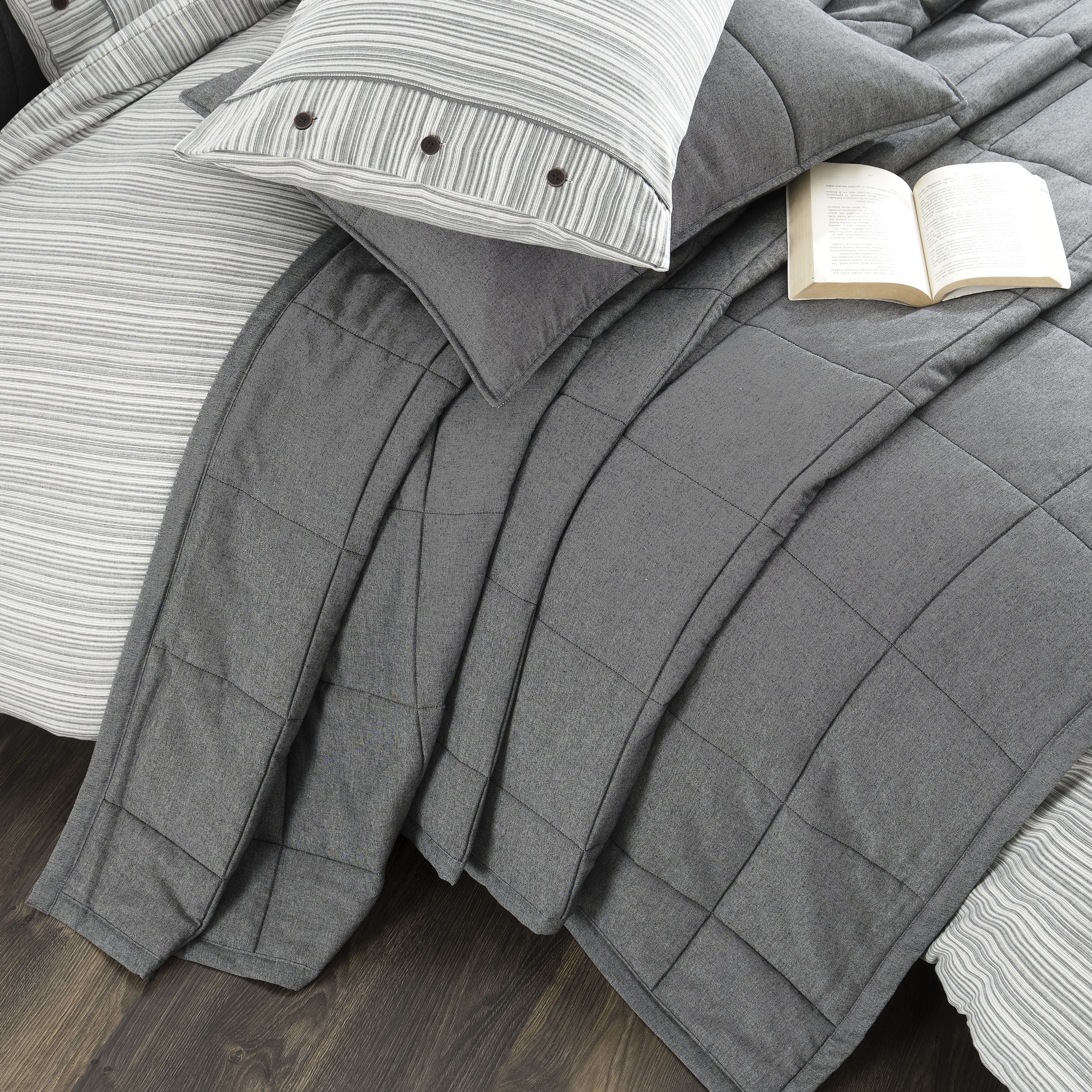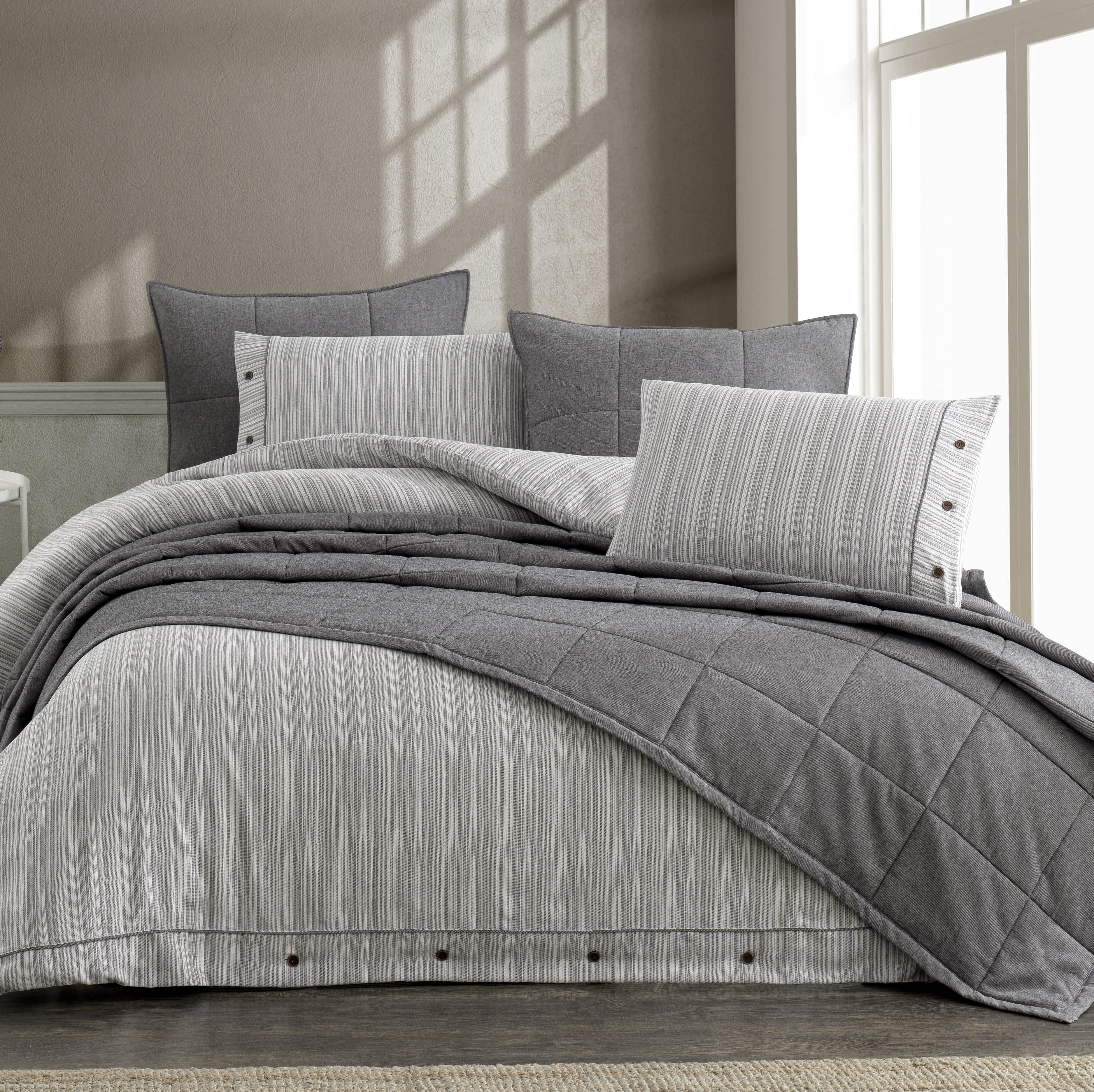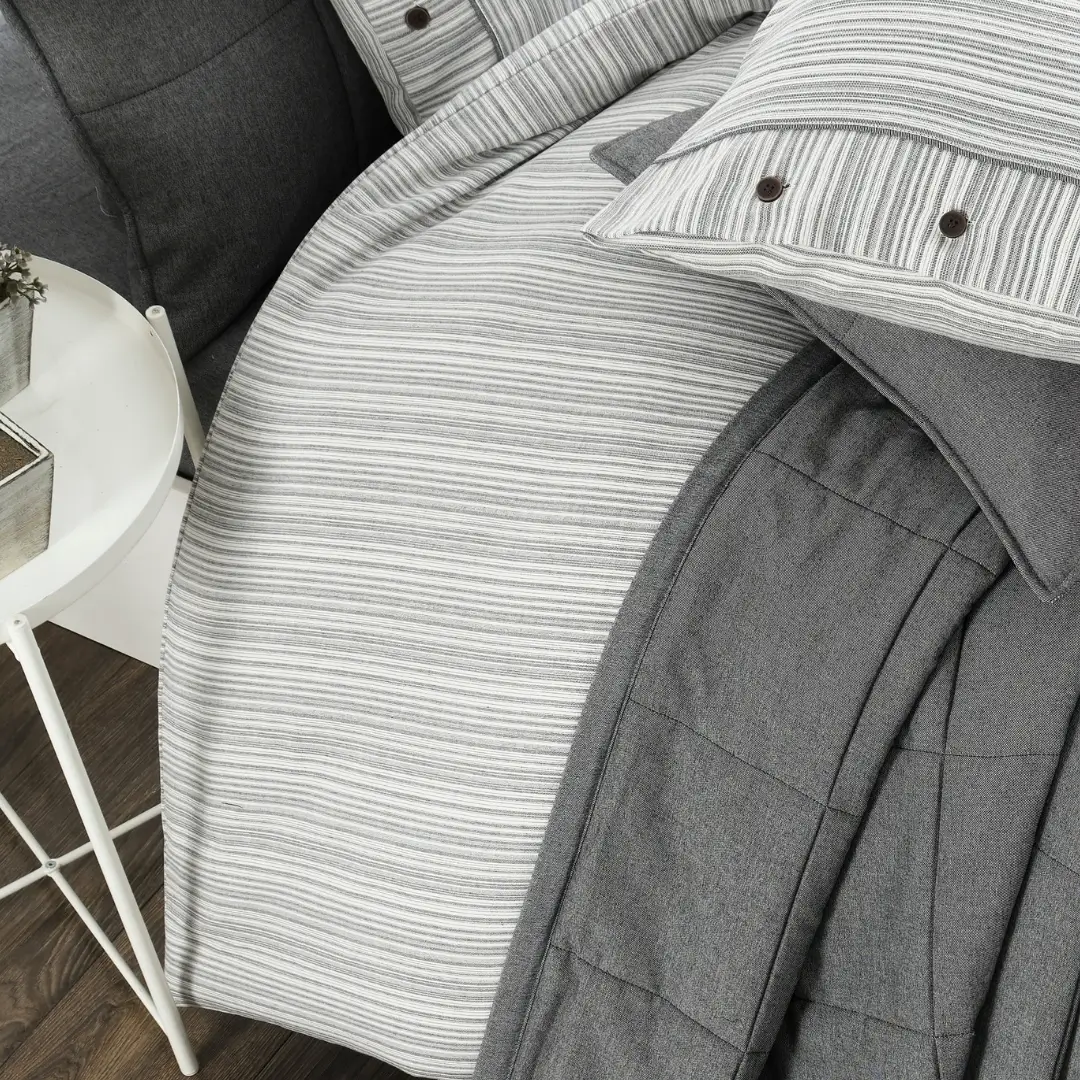Gelince Haber VerOlive Yatak Örtüsü Seti Gri, zarif gri tonlarıyla yatak odanıza sakinleştirici ve sofistike bir hava katacak. %100 pamuklu kumaşı, ipliği boyalı yapısı ile uzun ömürlü ve yumuşak bir kullanım sunar. Kapitone desenli yatak örtüsü ve çizgili nevresim takımı modern ve minimalist bir tasarım sunarken, düğme detayları da şıklığı tamamlar.