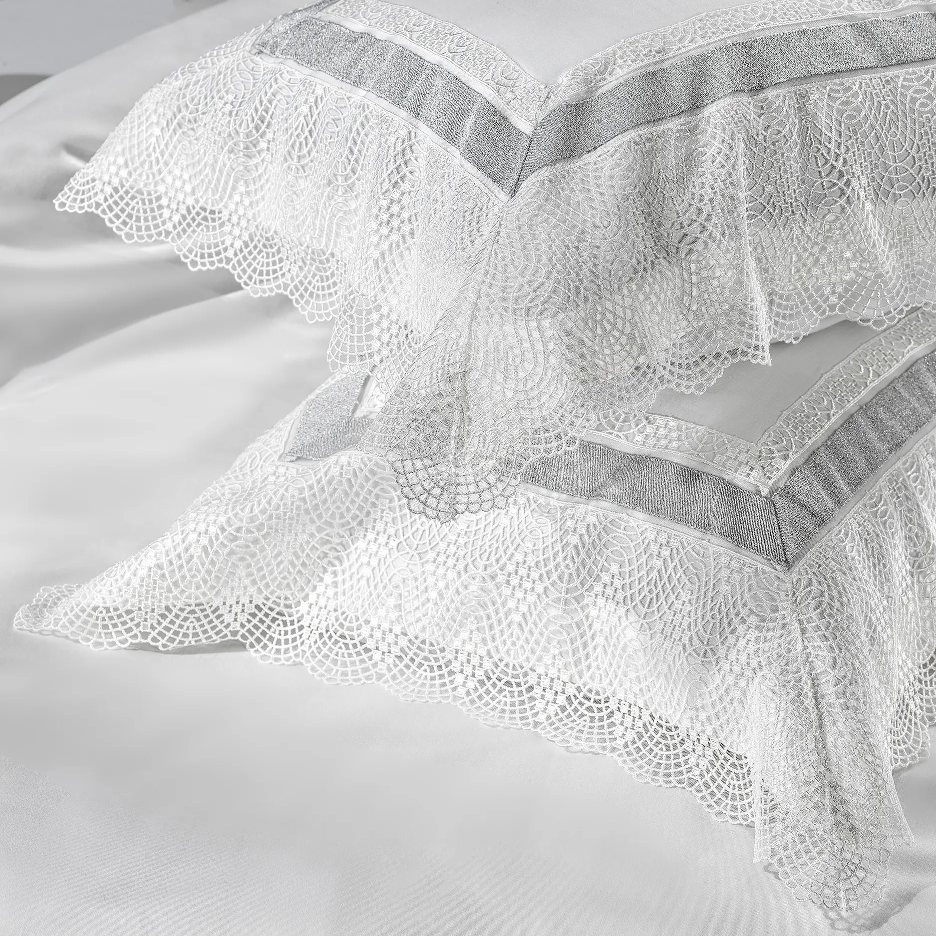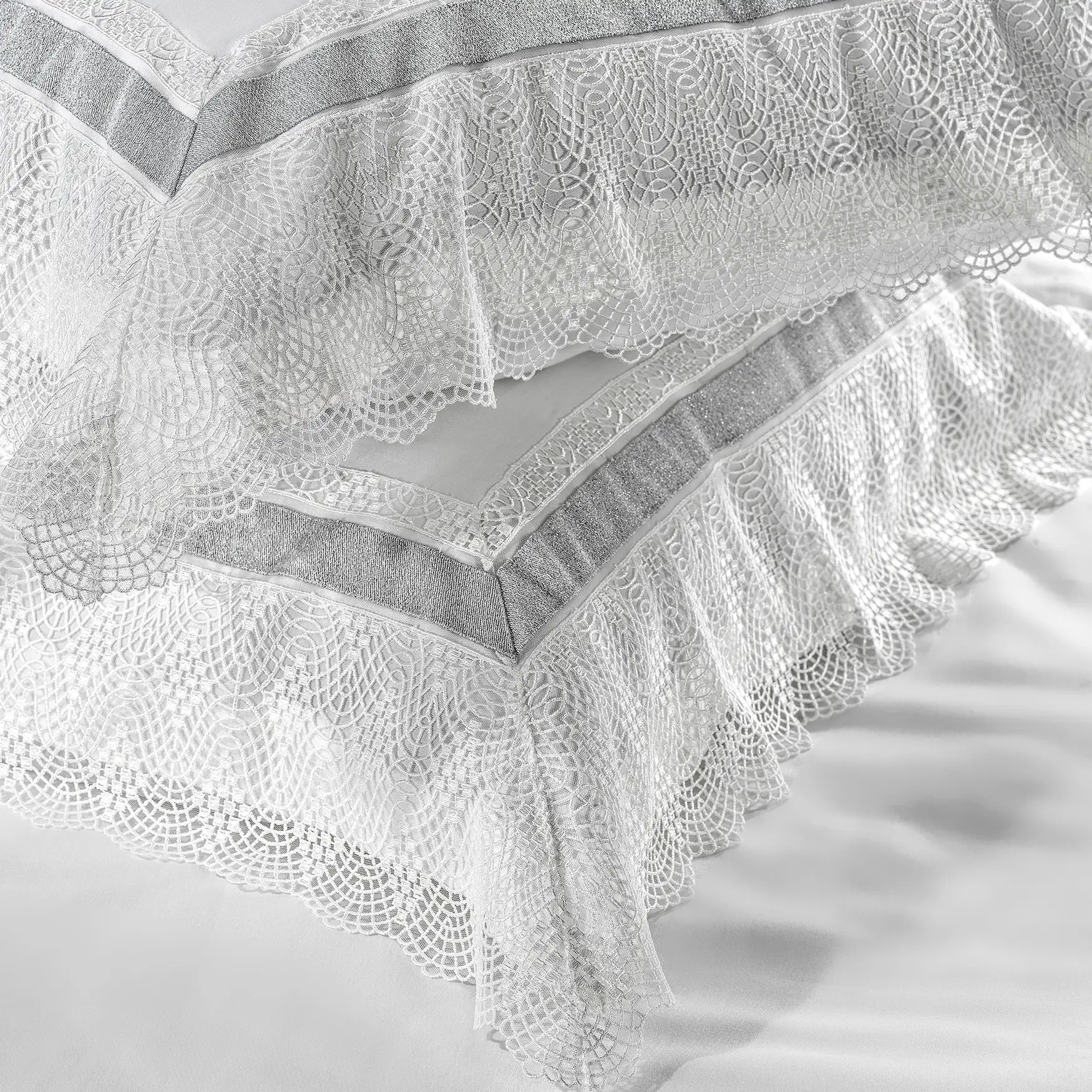 Hem yastık kılıflarının kenarlarında hem de nevresimde yer alan zarif dantel işlemeleri bulunmaktadır. Dantel detayları ince geometrik motiflerle işlenmiş ve oldukça ince bir işçilikle tasarlanmıştır. Dantel bölümleri hafif kabartmalı olup, klasik Fransız dantellerini andıran bir zarafete sahiptir. Bu detaylar takıma romantik ve sofistike bir hava katıyor.