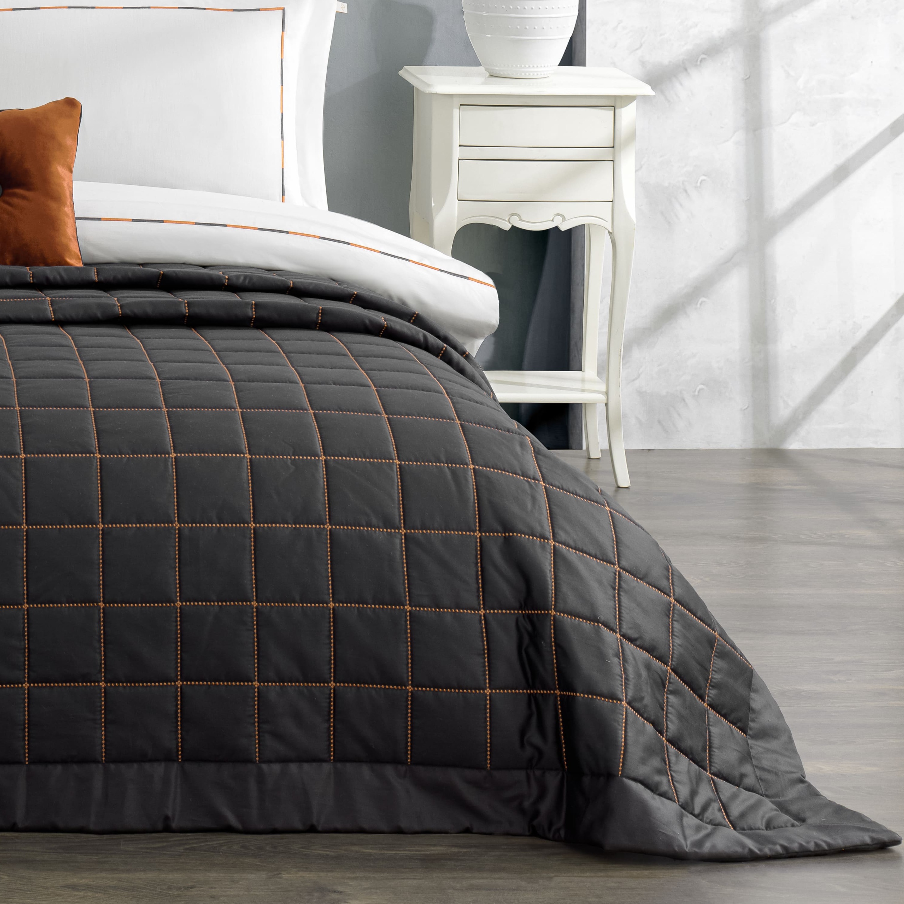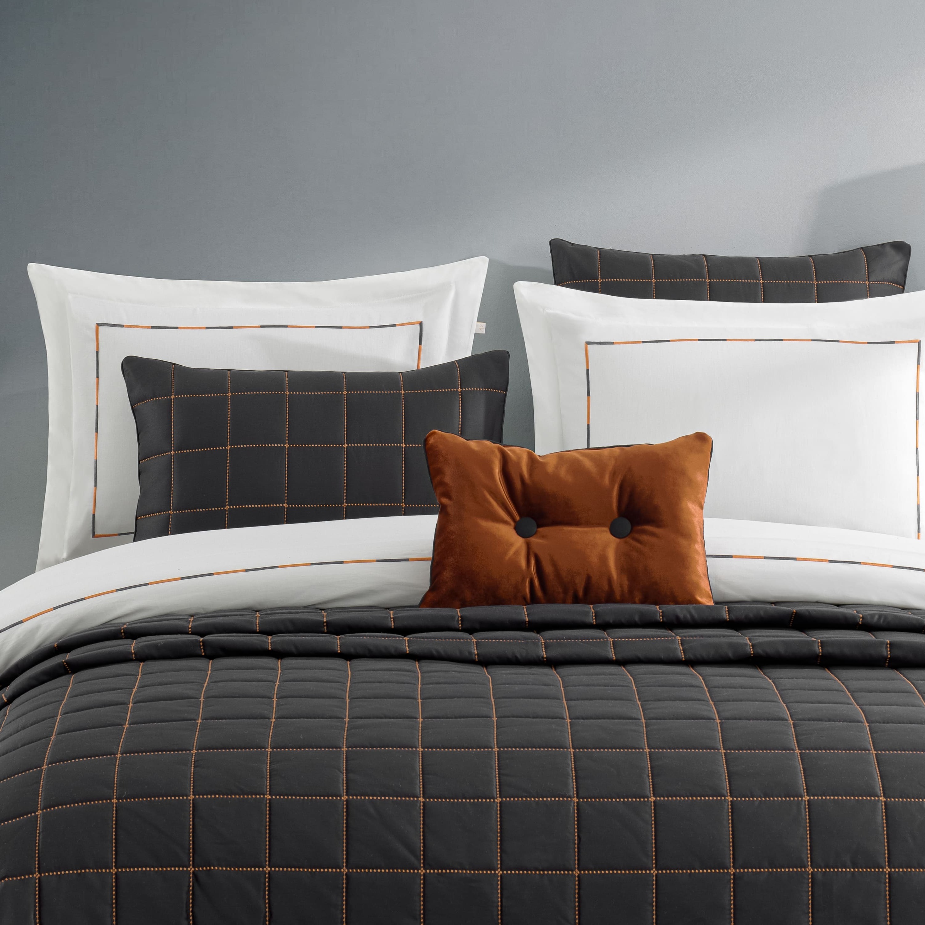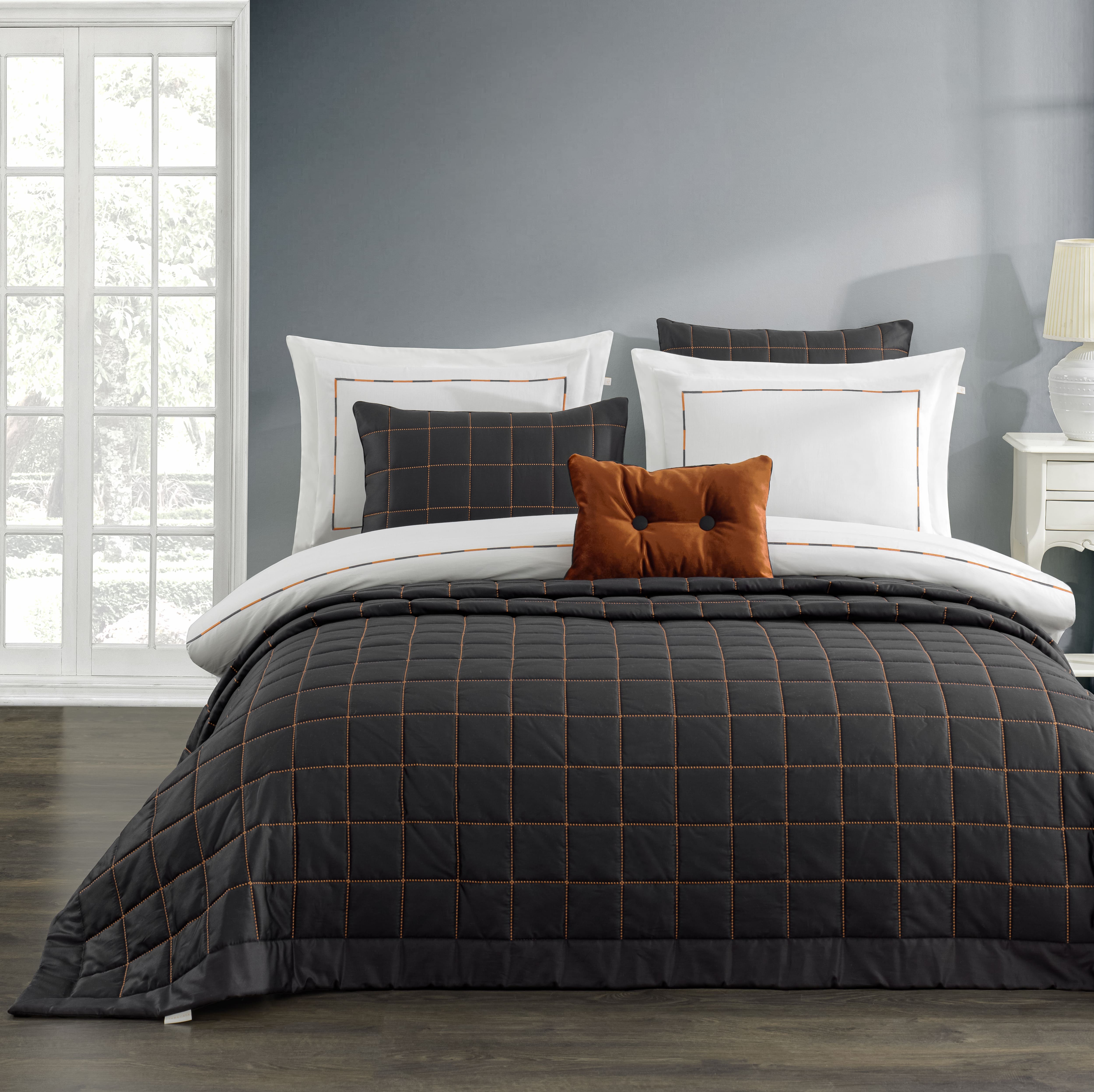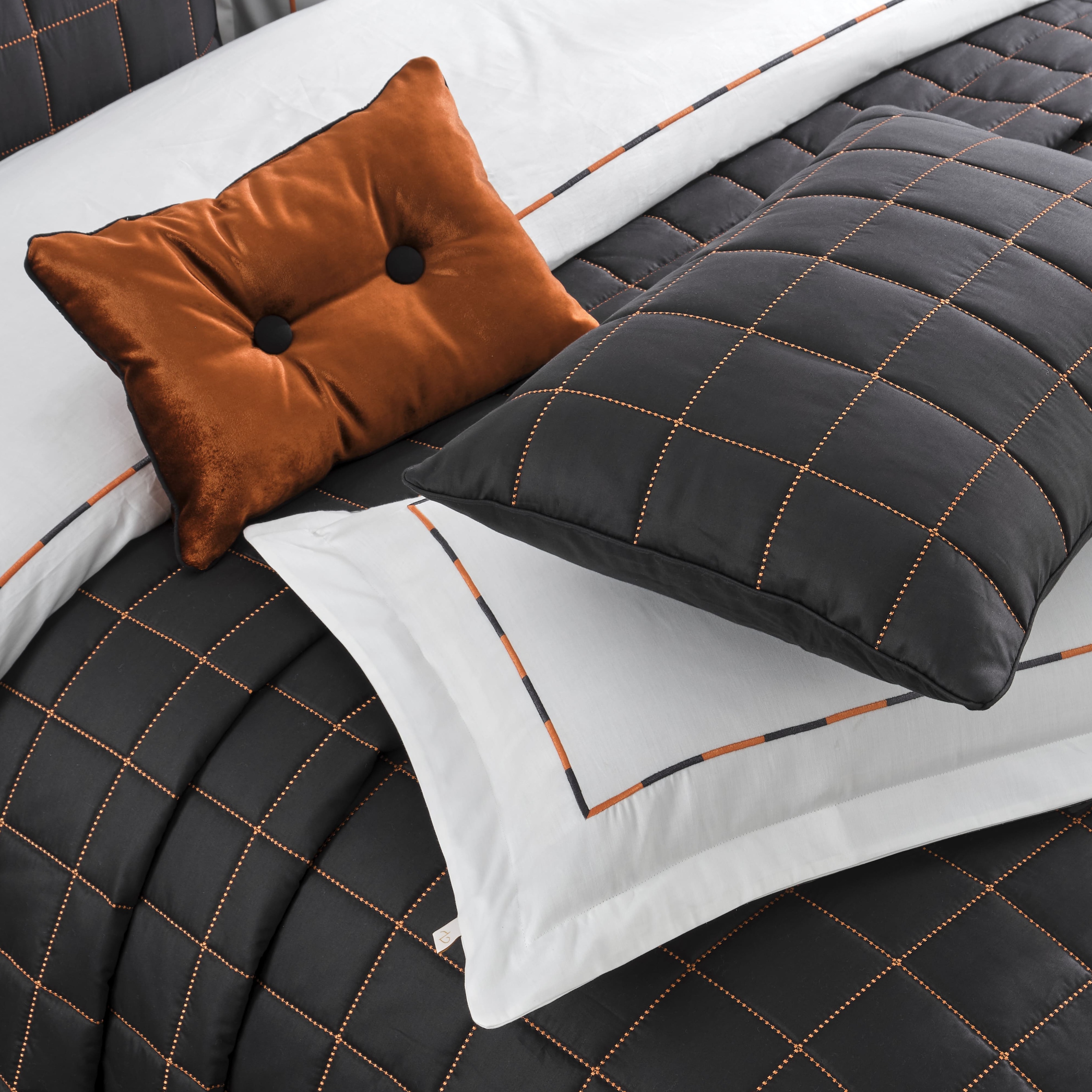 Peony Yatak Örtüsü Seti Antrasit, 83 tel pamuk/saten kumaşı ve sofistike nakış kapitone detaylarıyla yatak odanızda güçlü ve modern bir stil yaratır. Abiye set grubundaki bu ürün, antrasitin asil duruşu ile tasarlanmıştır. Nevresim nakışları ve kapitone geçişleri, zarafeti tamamlar.
