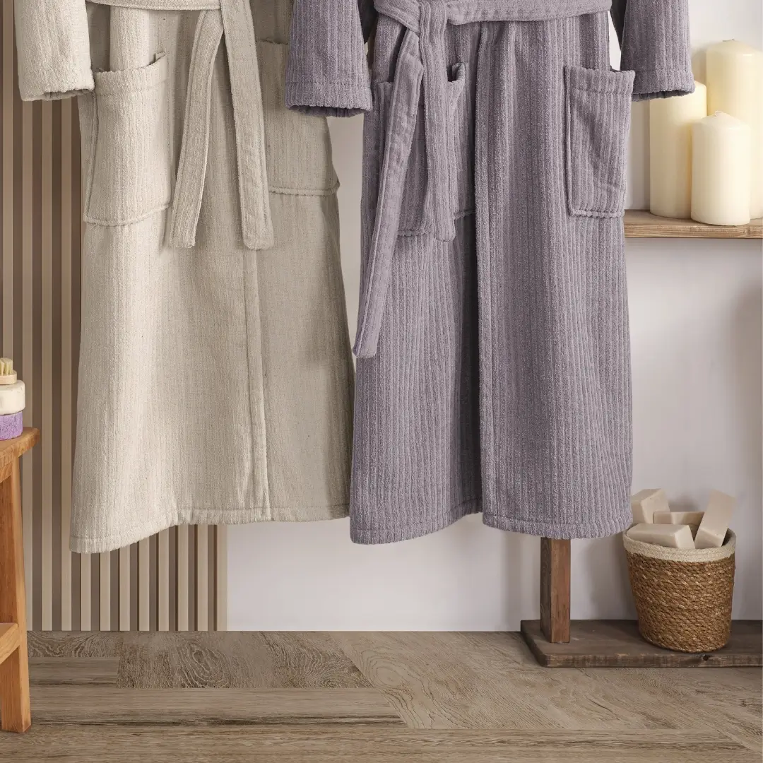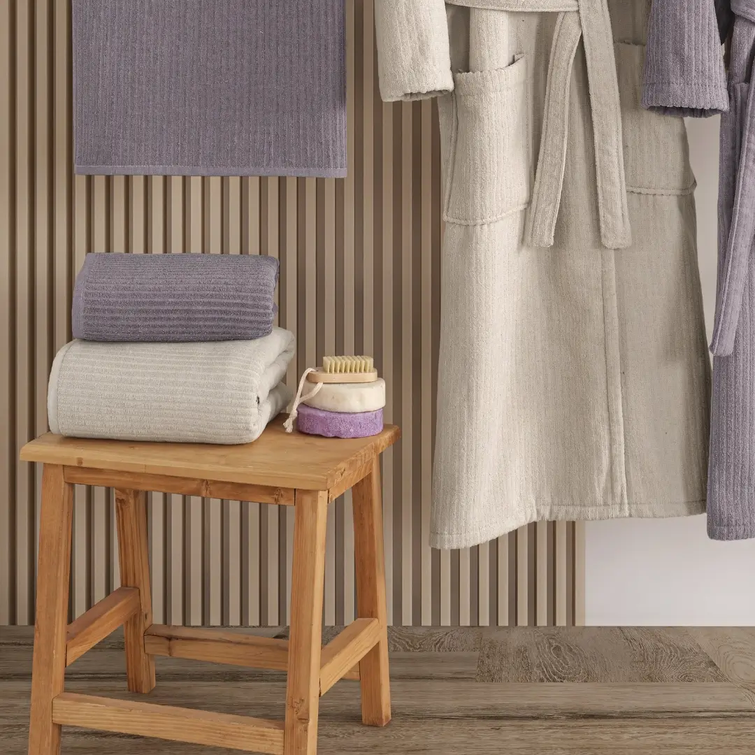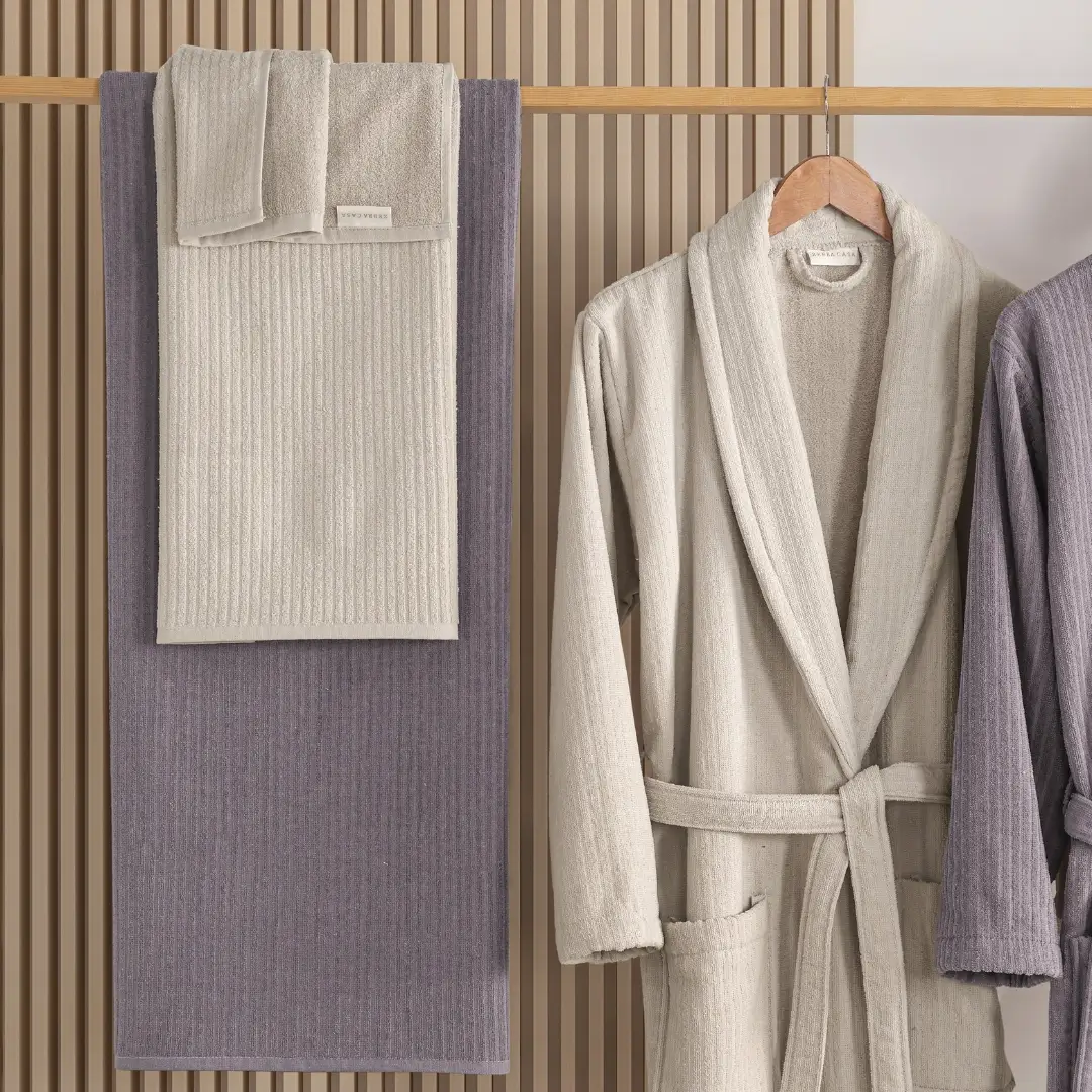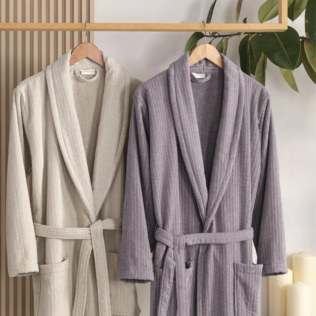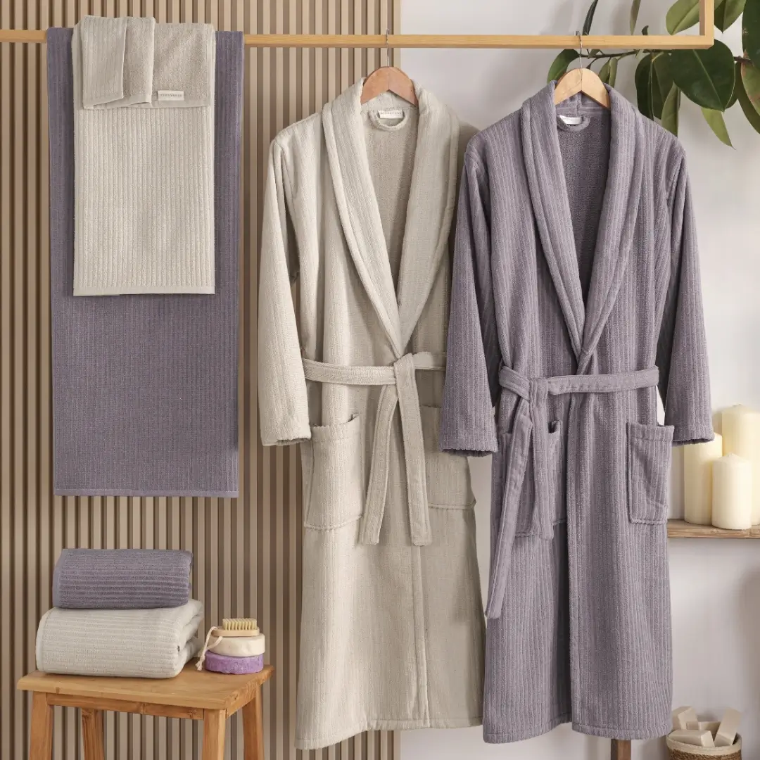 6 parçadan oluşan aile bornoz seti, kadın bornoz, erkek bornoz, 2 adet banyo havlusu ve 2 adet yüz havlusundan oluşur. Çizgili ve sade tasarımıyla günlük kullanıma uygundur. %100 pamuklu dokusuyla yüksek su emiciliğe sahiptir.