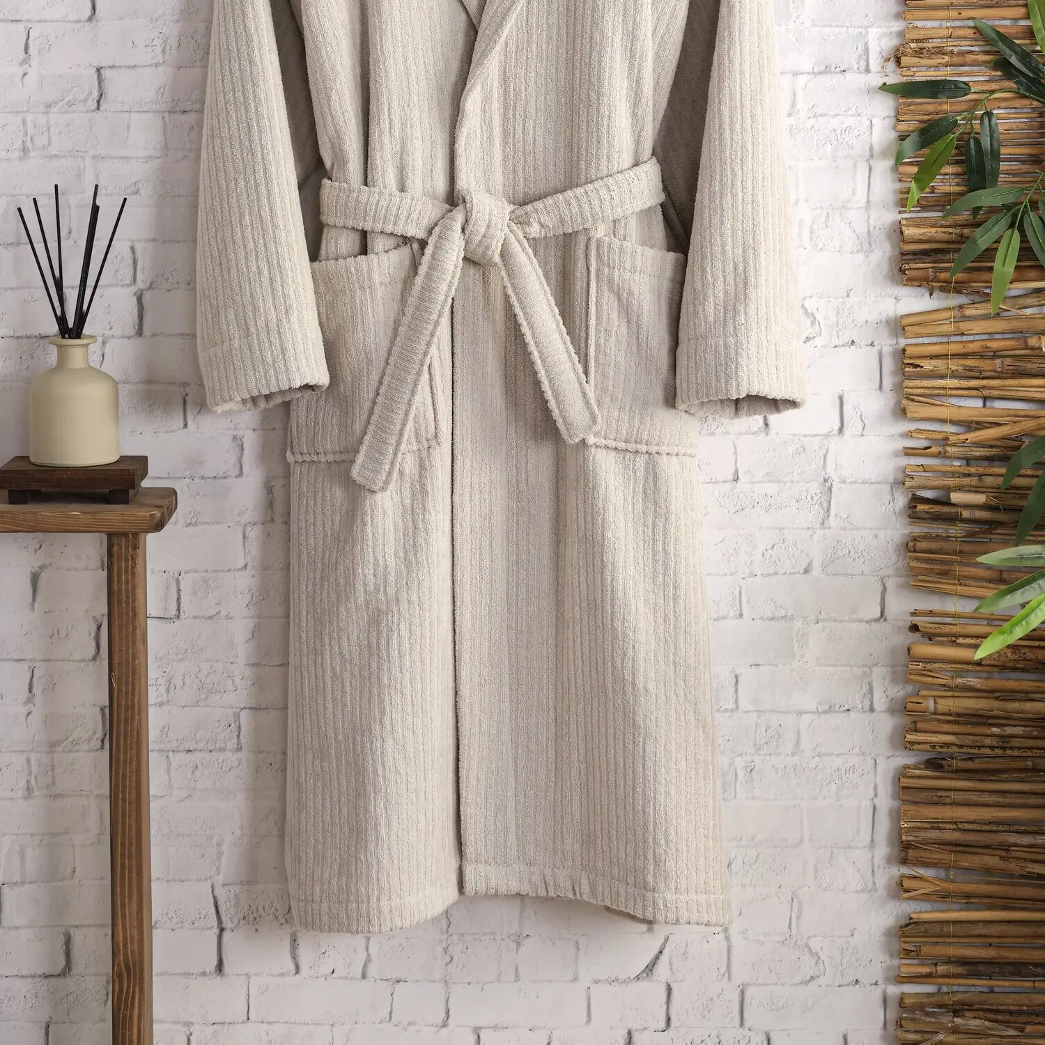 Tasarım: Bornozun rahat bir kesimi vardır. Uzun kollu ve belinde aynı kumaştan yapılmış bir kuşakla önden bağlanarak rahat bir kullanım sunuyor.
