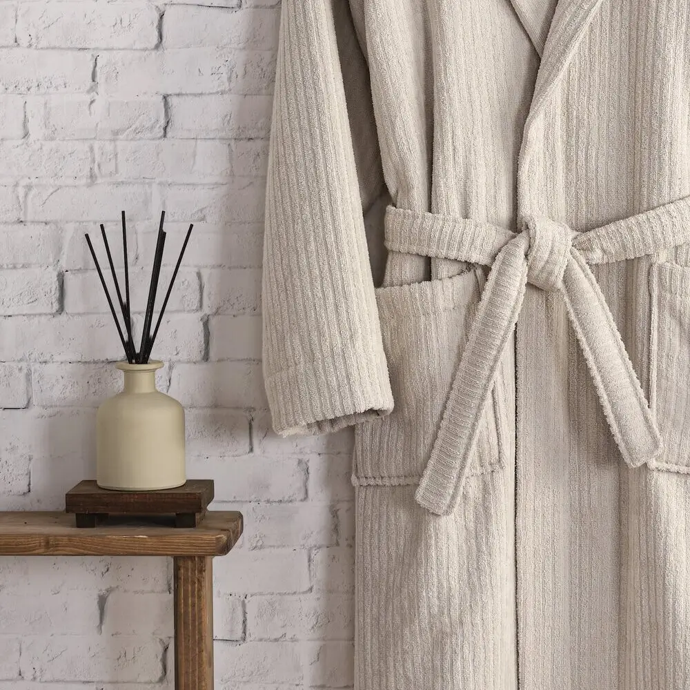 Doku: Yumuşak ve kabarık pamuk dokusuna sahip. Üzerindeki ince dikey çizgiler, dokusuna zarif bir hareketlilik katıyor.
