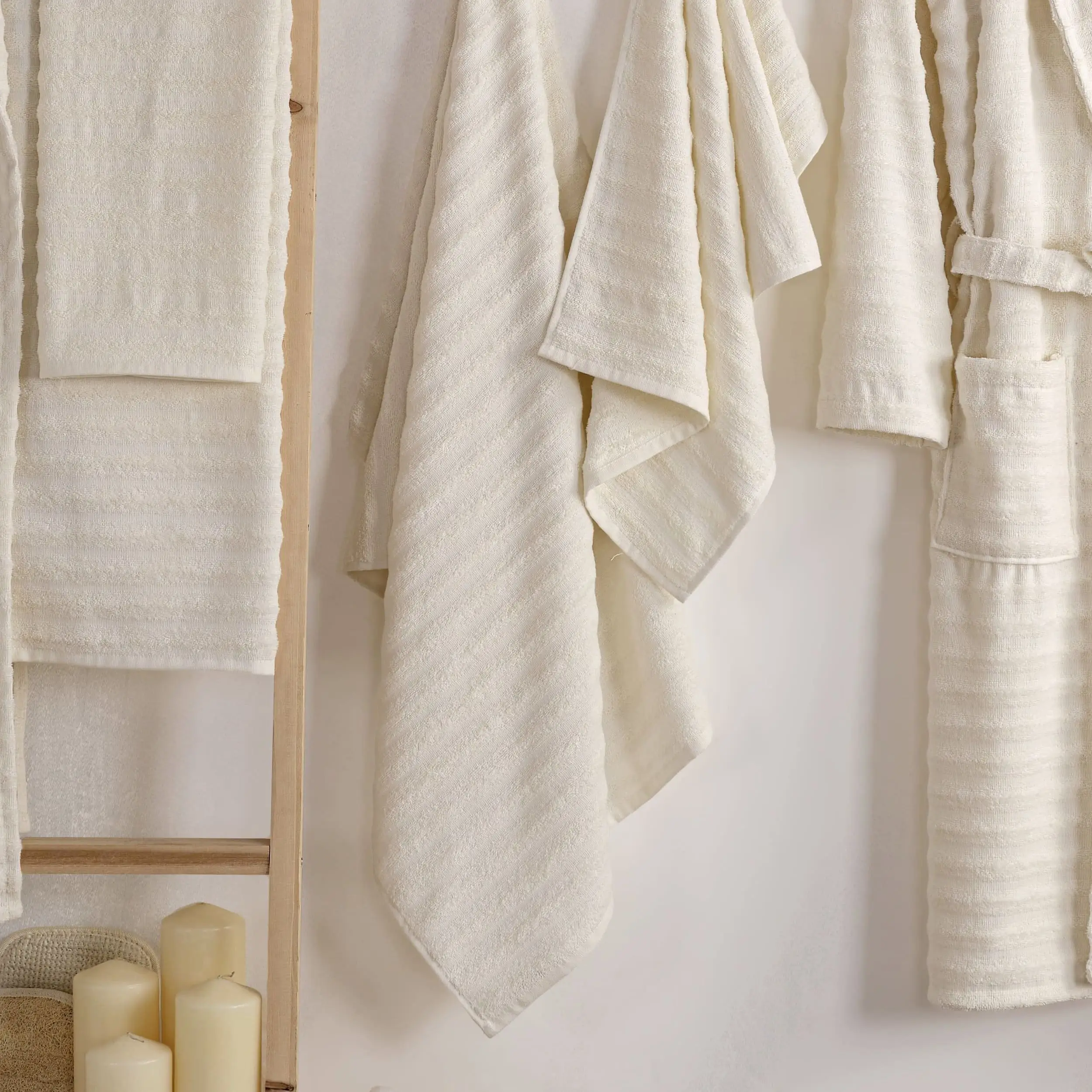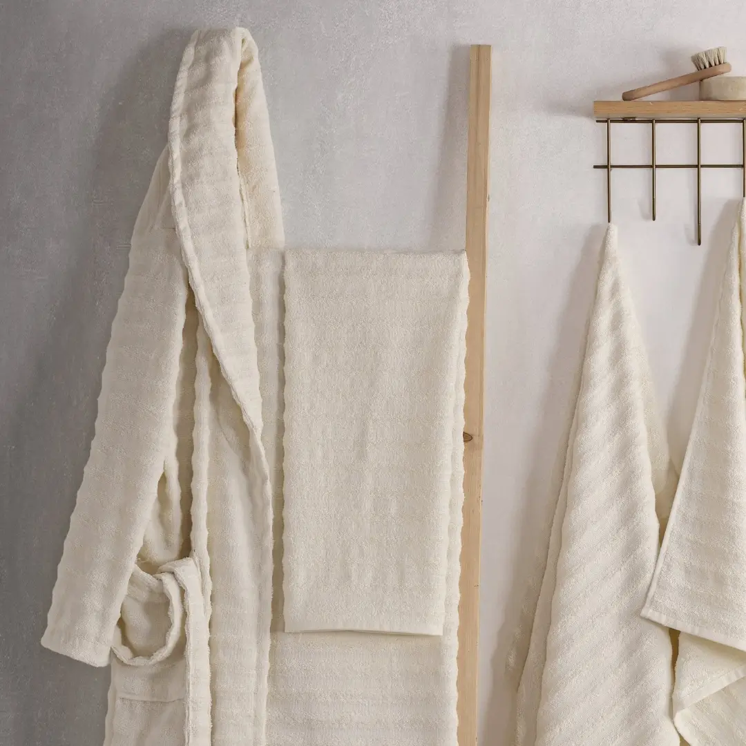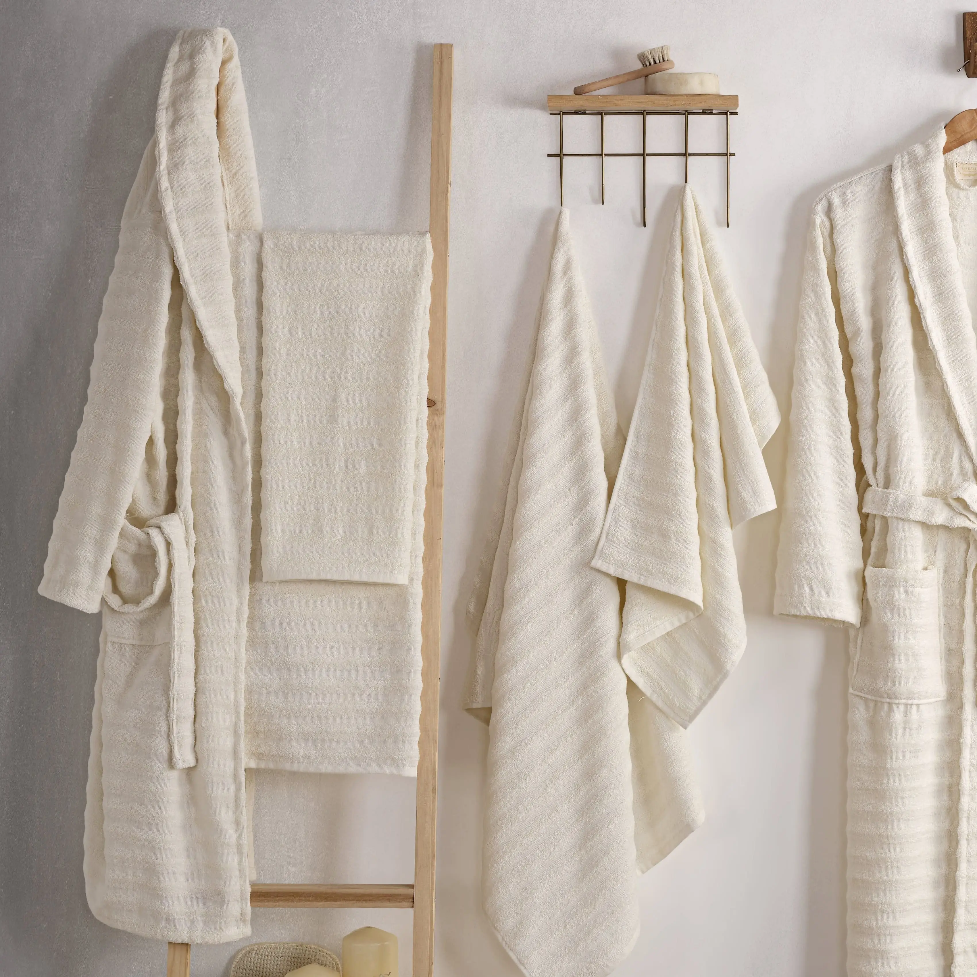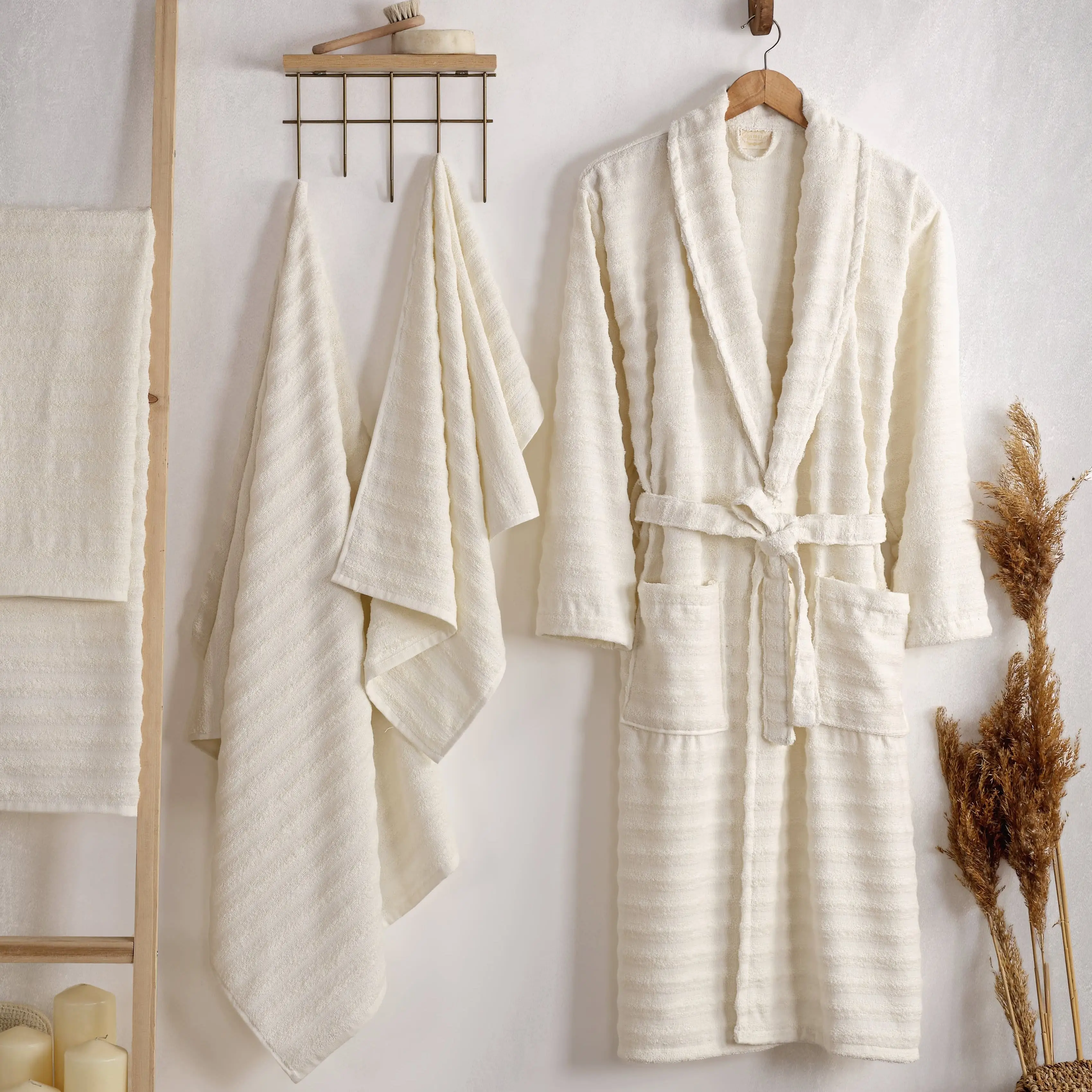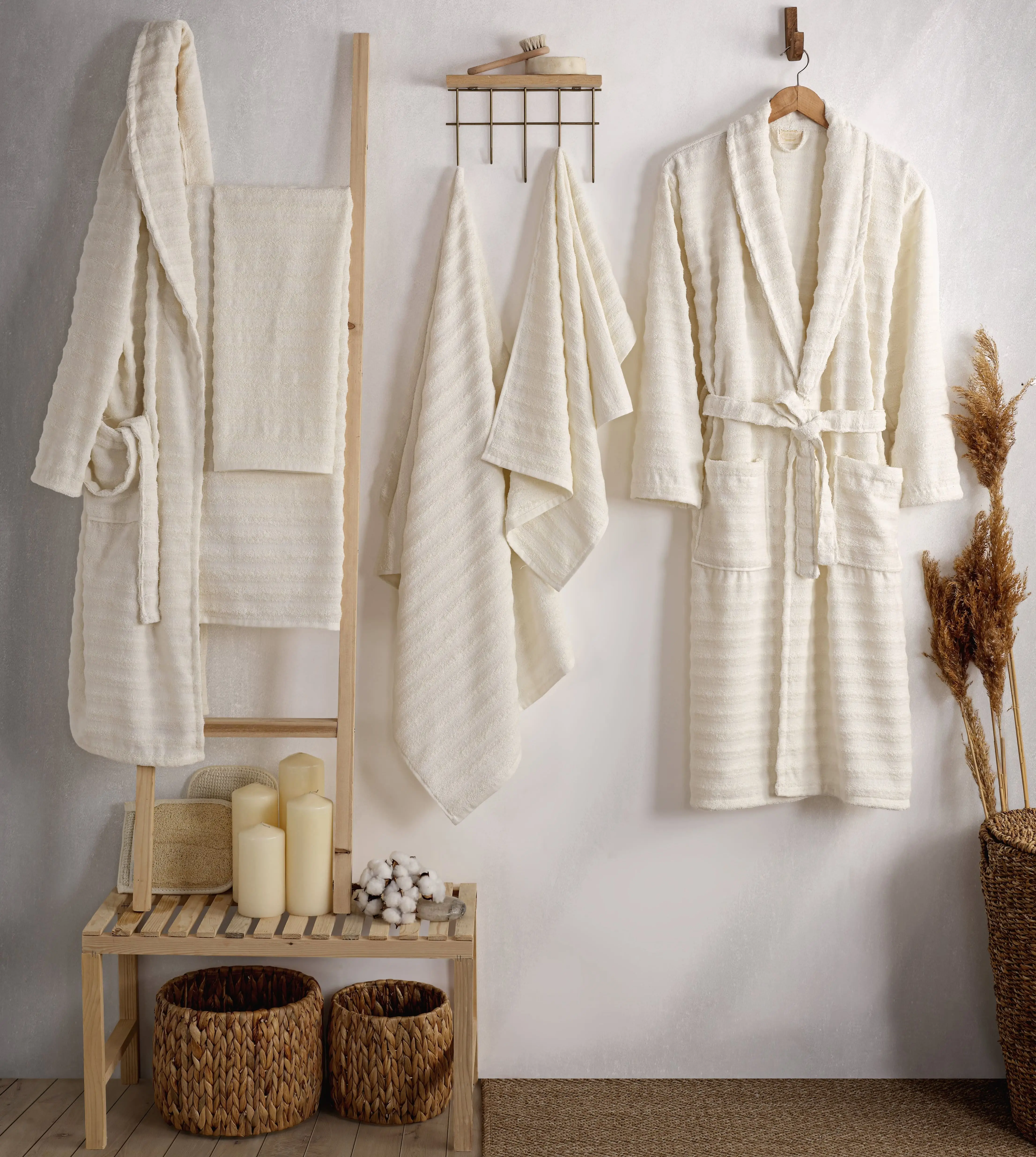 6 parçadan oluşan aile bornoz seti, kadın bornoz, erkek bornoz, 2 adet banyo havlusu ve 2 adet baş havlusundan oluşmaktadır. Bombeli tasarımı ve sade görünümü ile günlük kullanıma uygundur. %100 pamuklu dokusu sayesinde yüksek su emiciliğine sahiptir.