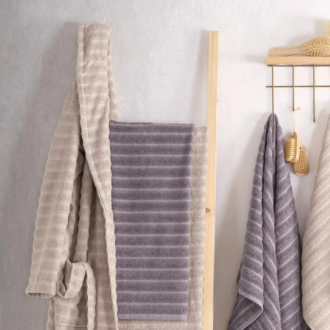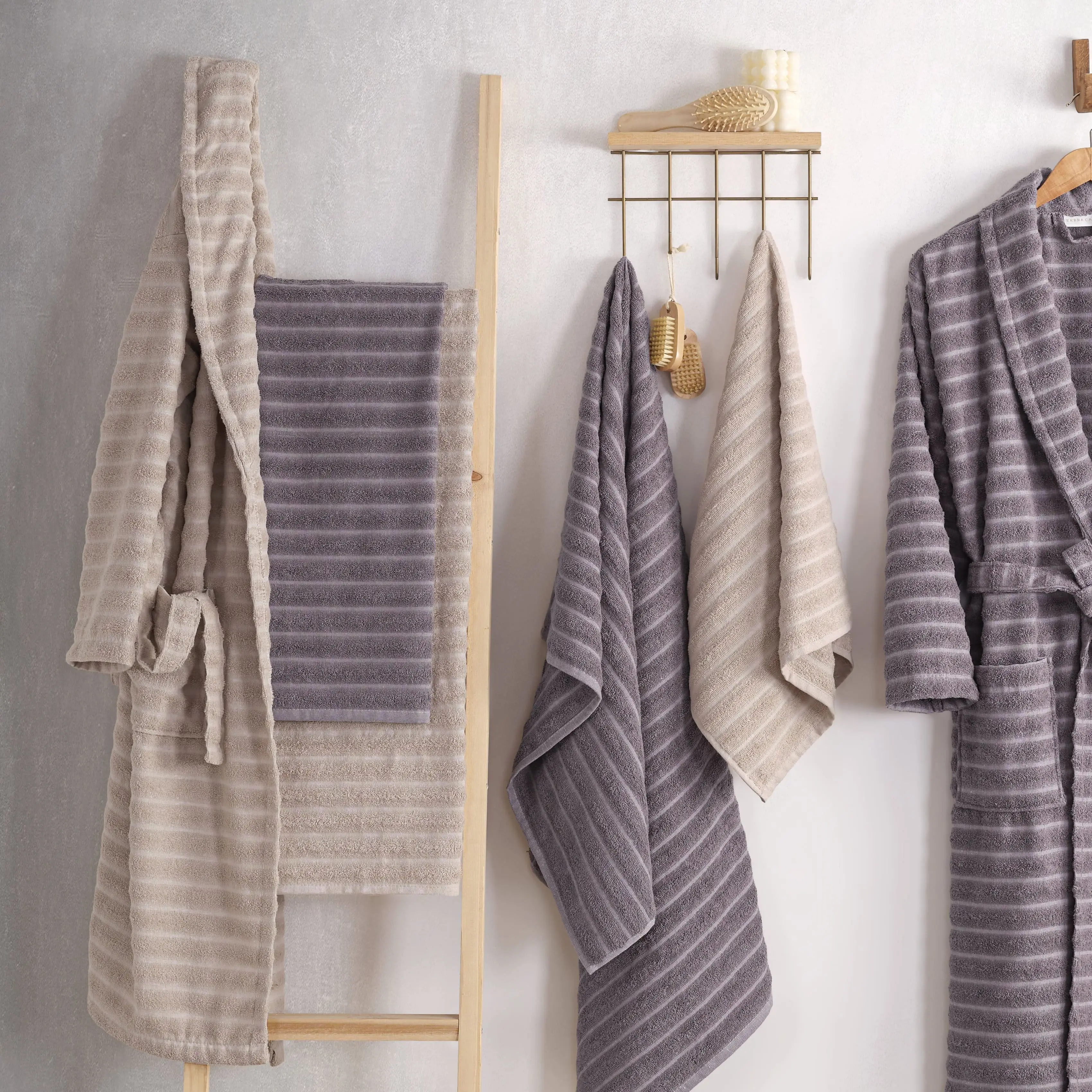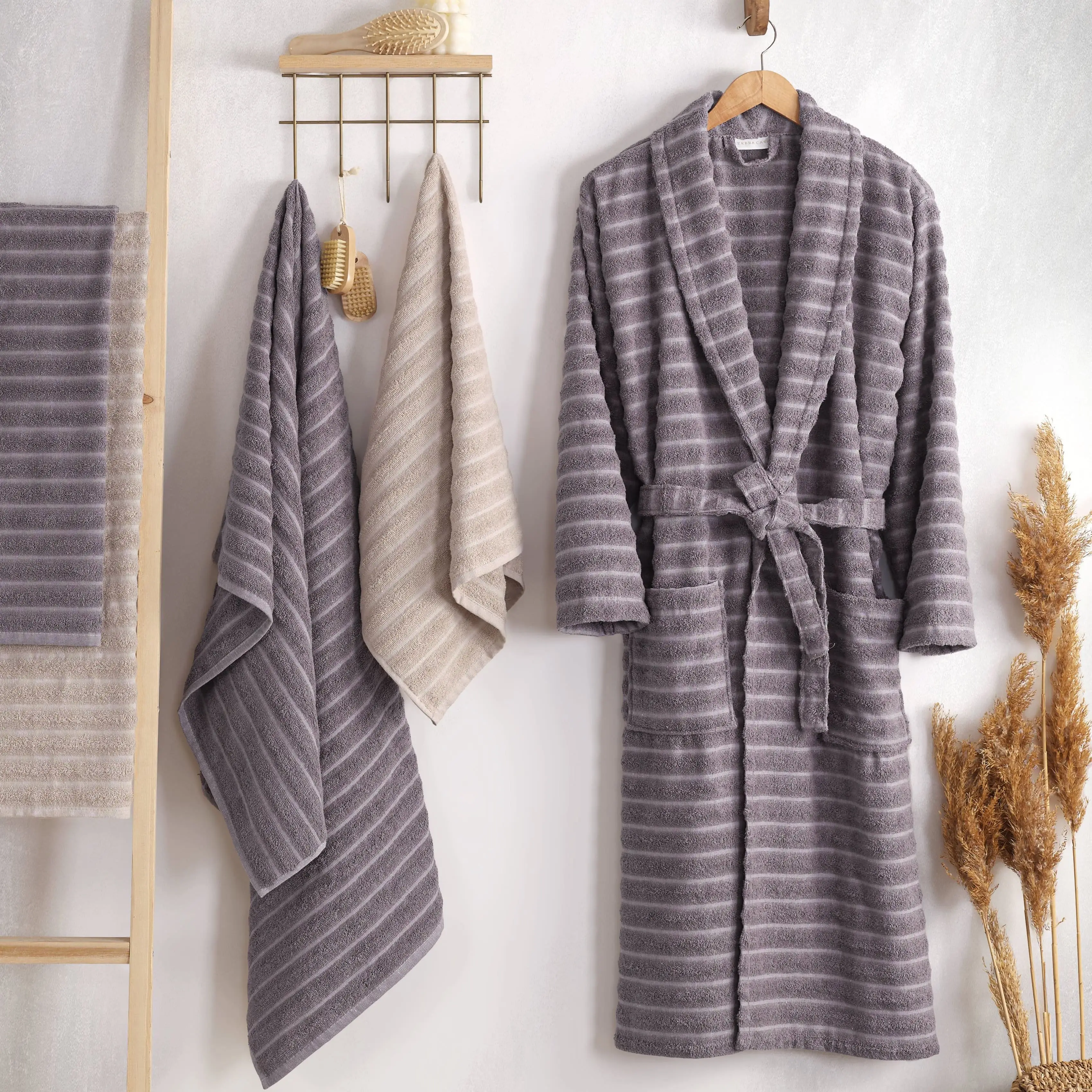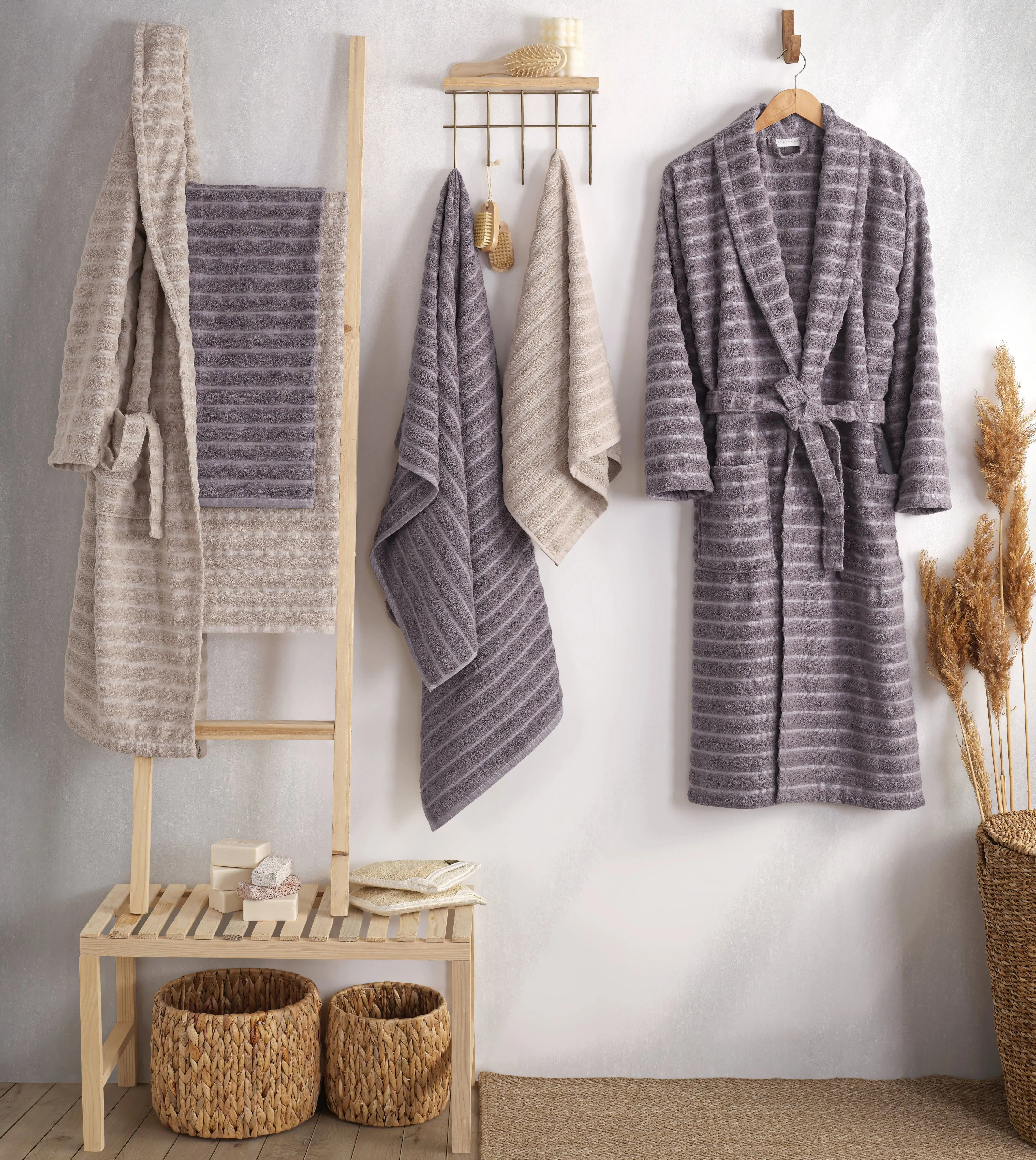6 parçadan oluşan aile bornoz seti, kadın bornoz, erkek bornoz, 2 adet banyo havlusu ve 2 adet baş havlusundan oluşmaktadır. Bombeli tasarımı ve sade görünümü ile günlük kullanıma uygundur. %100 pamuklu dokusu sayesinde yüksek su emiciliğine sahiptir.