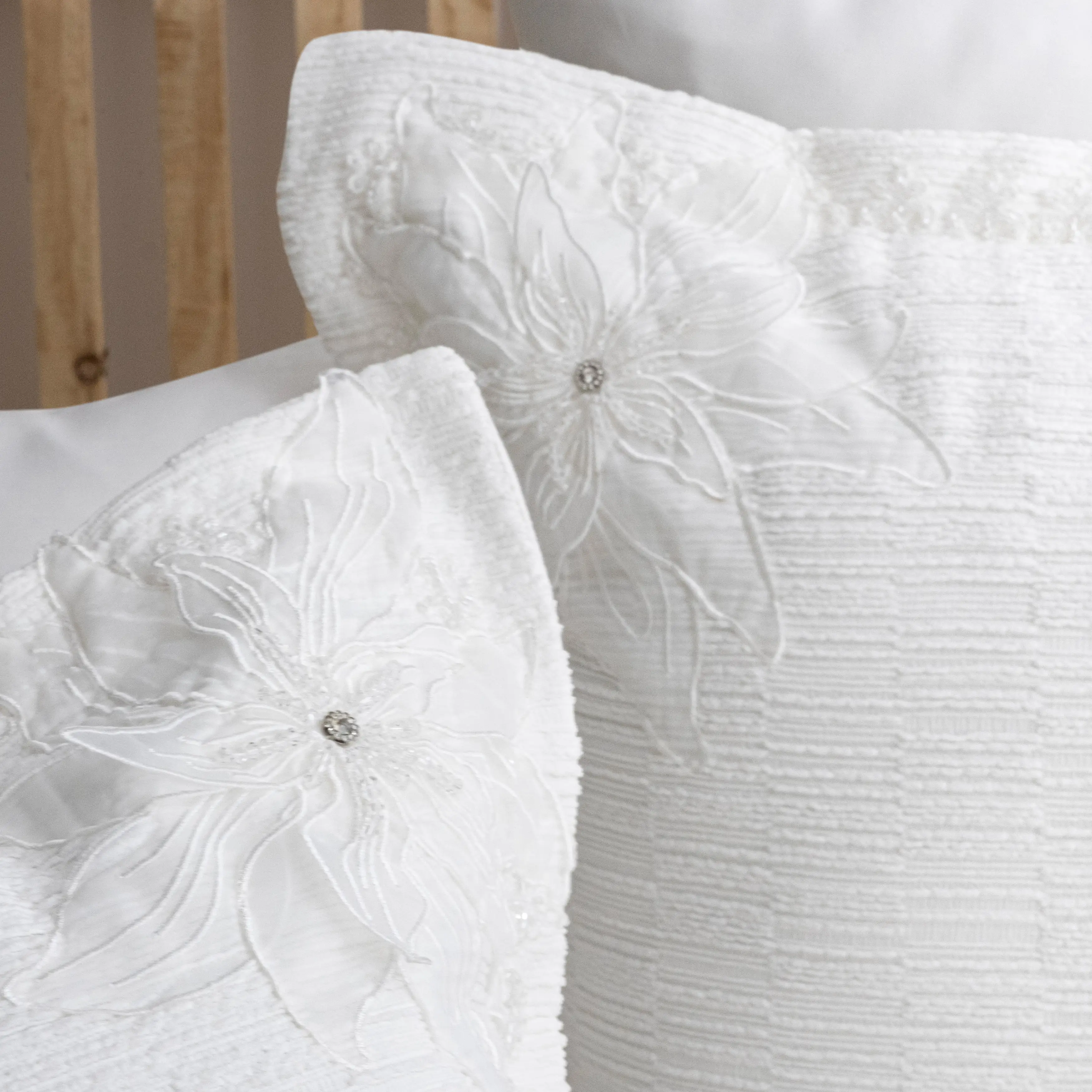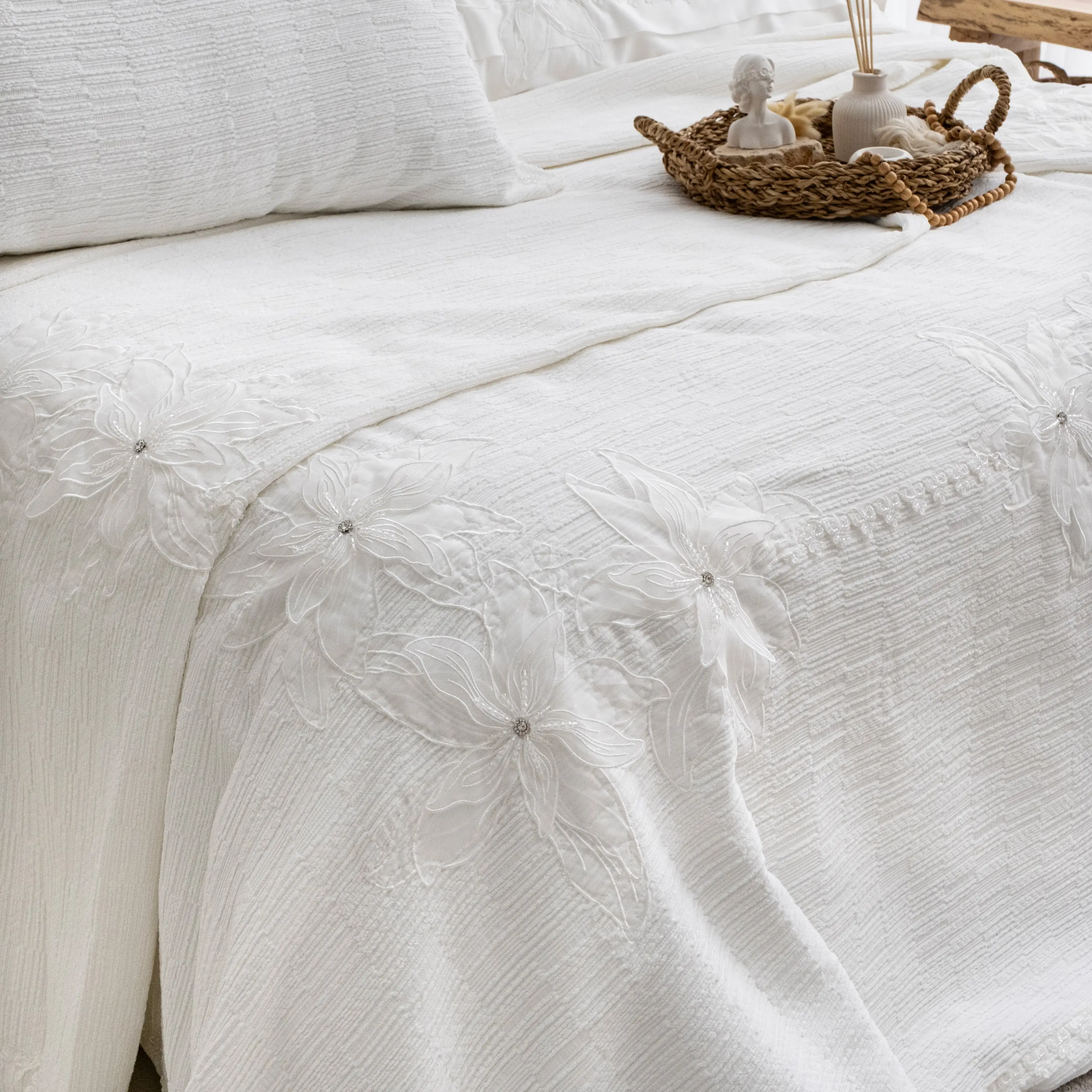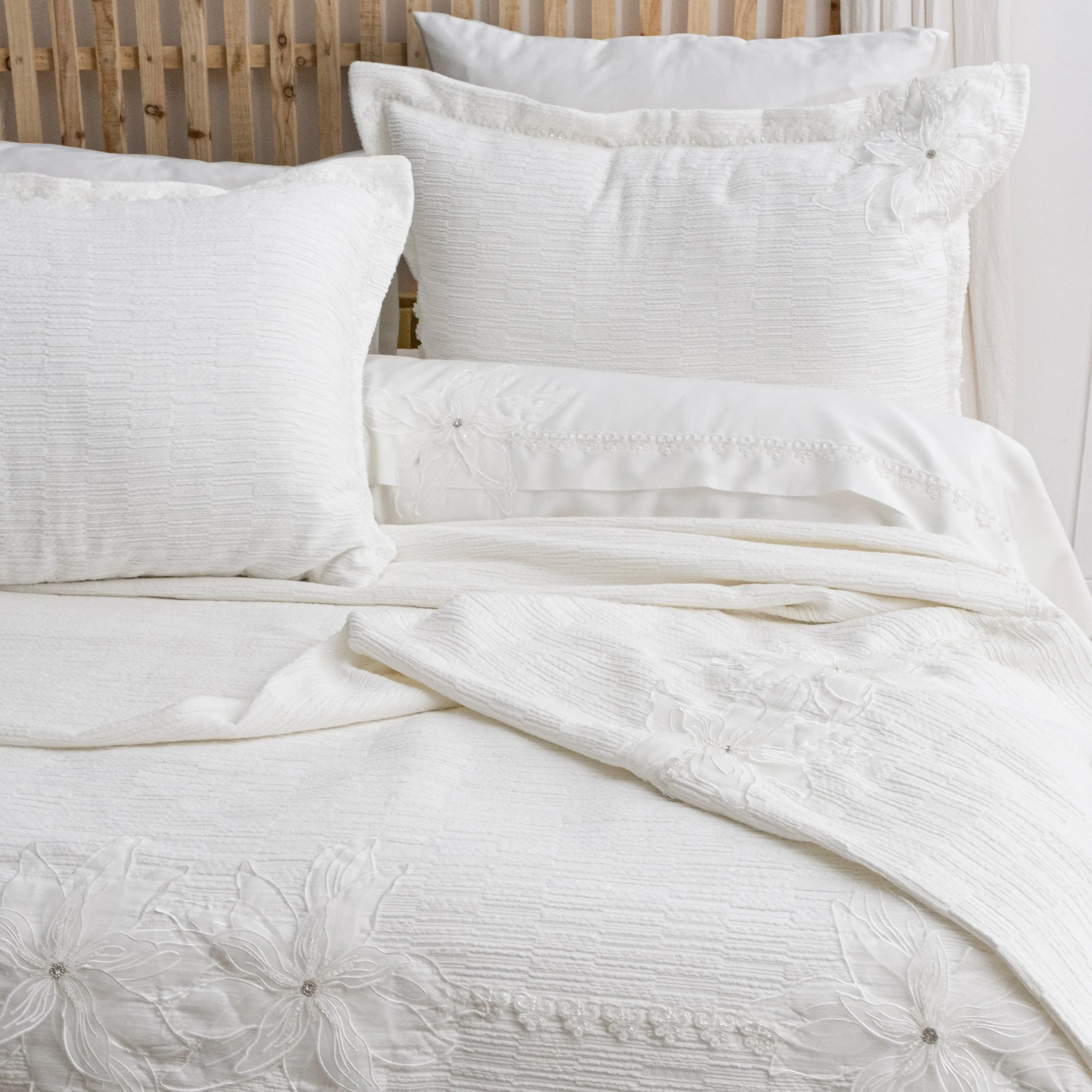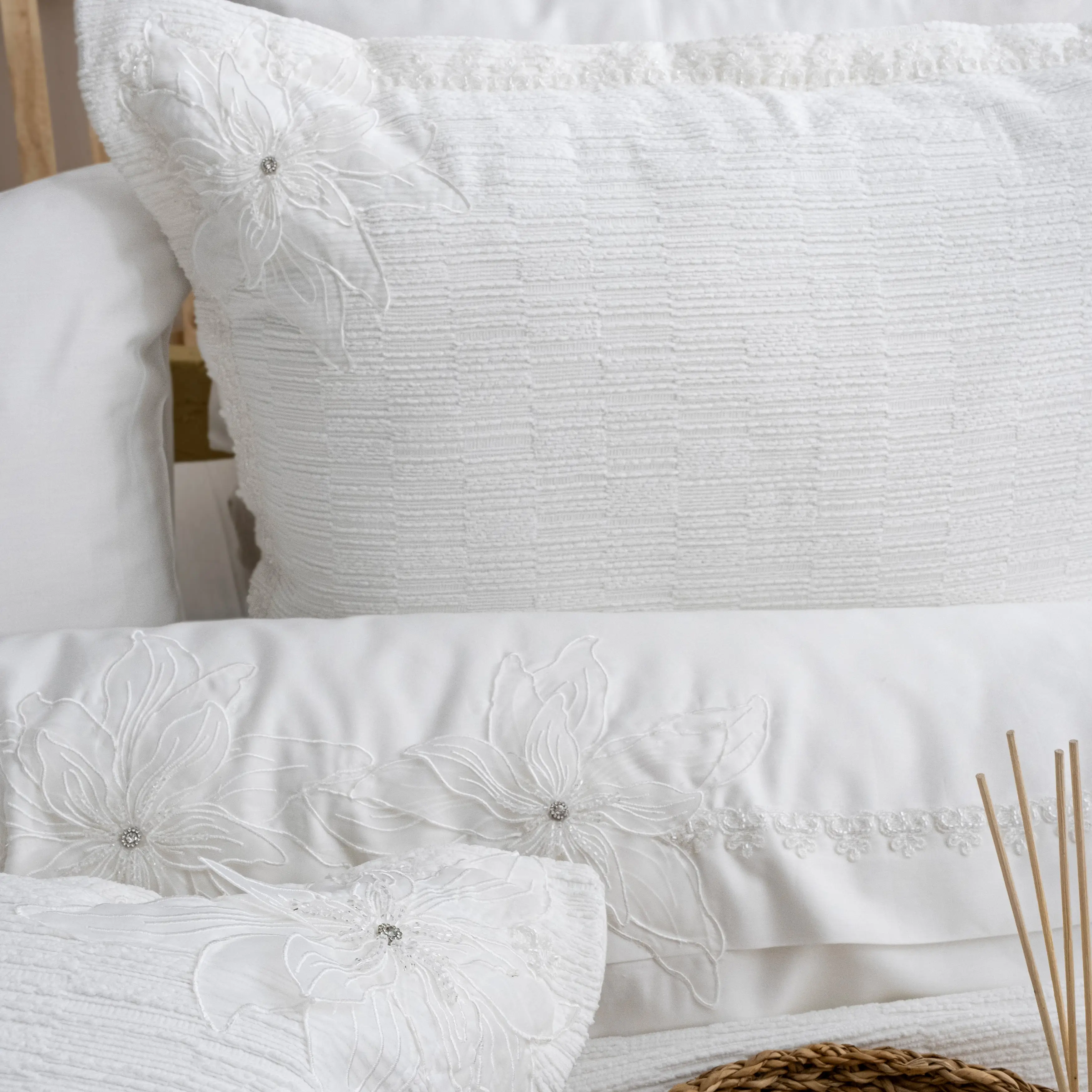 Pike, nevresim ve yastık kılıflarında yer alan zarif gül aplik detaylarıyla tasarlanmıştır.