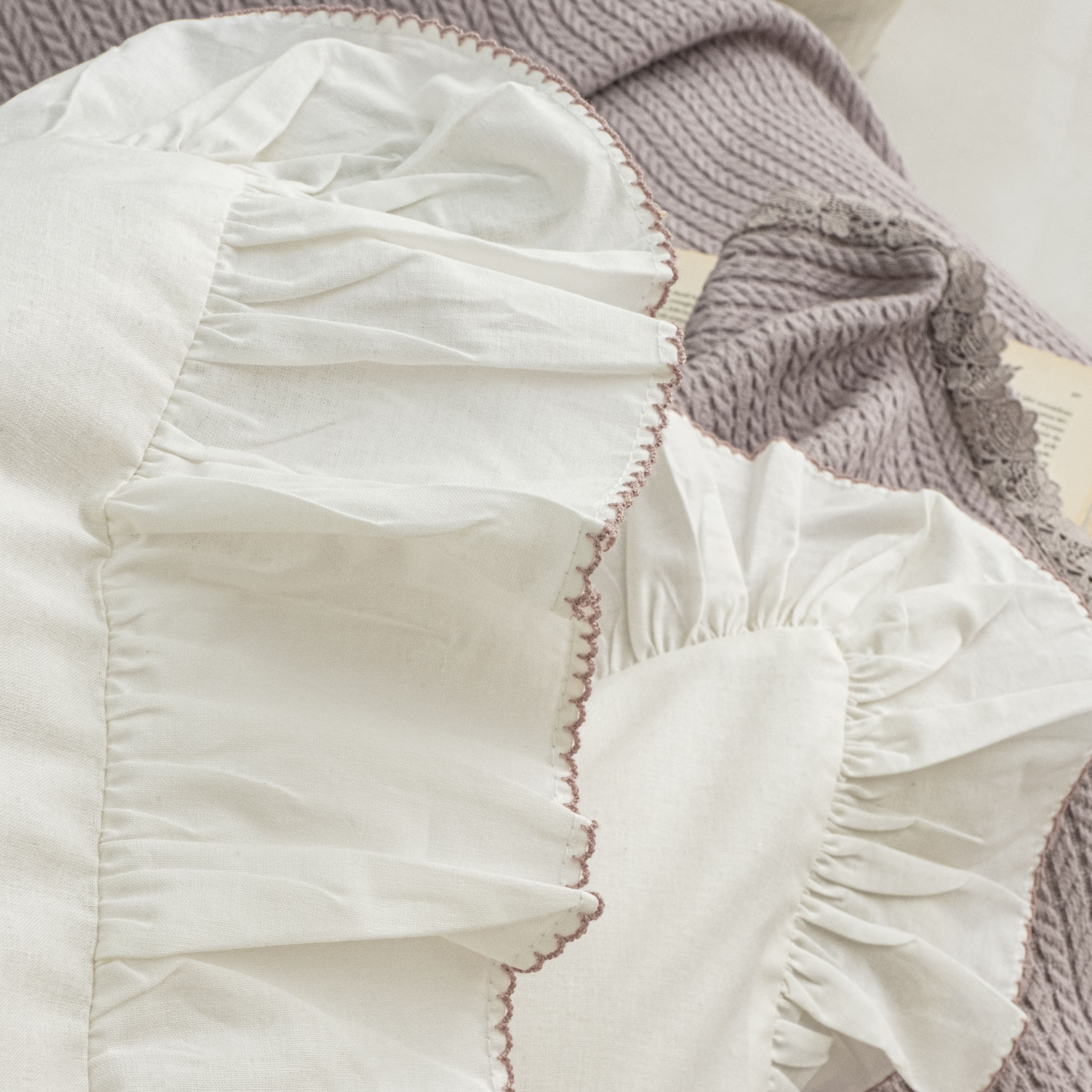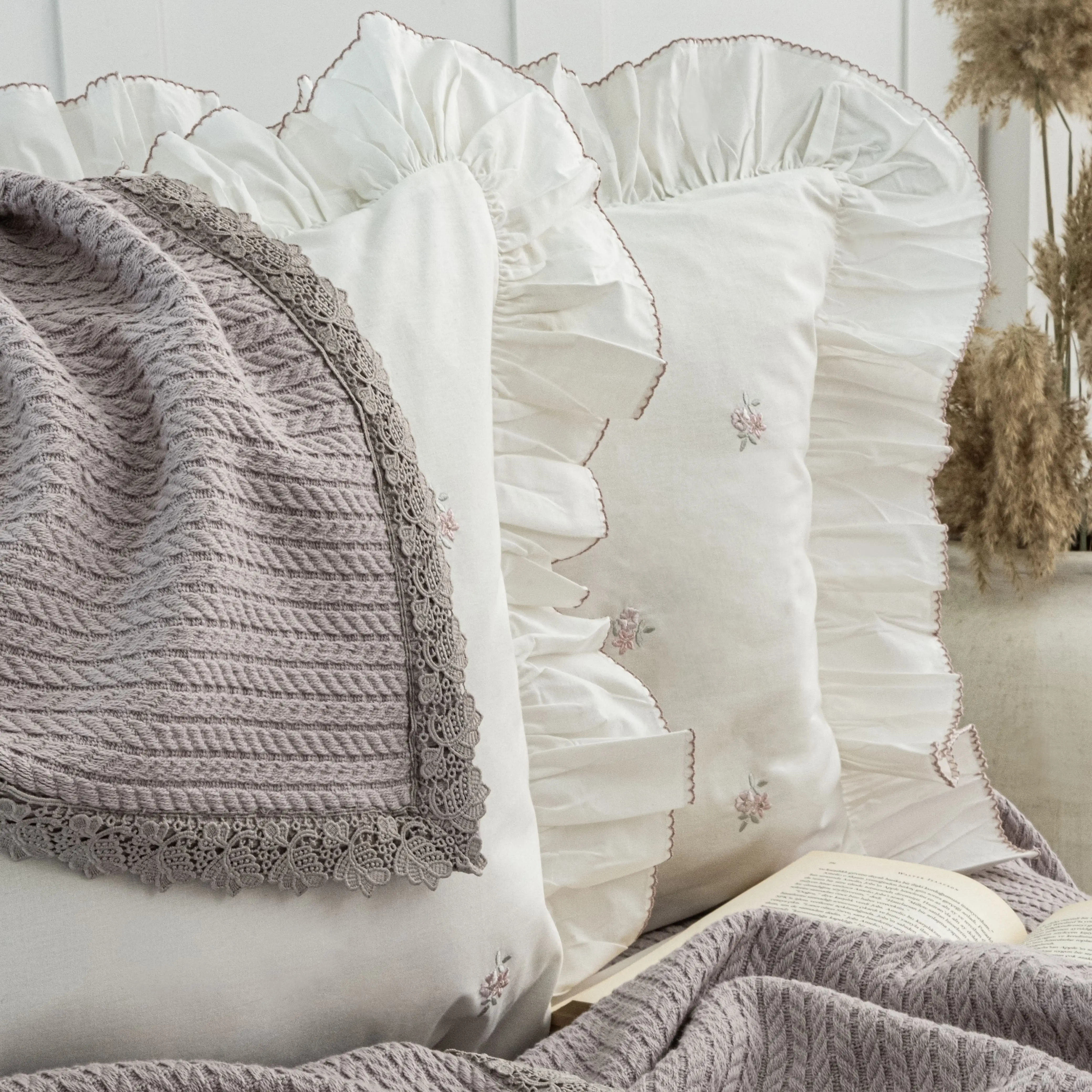 Yumuşak, nefes alabilen ve ciltle temasa uygun pamuklu kumaş tercih edilmiştir. Yastıkların ve nevresimin etrafındaki volanlı (fırfırlı) lila rengi dikişler ürüne hem nostaljik hem de feminen bir hava katıyor. Nakışın verdiği romantik ve dekoratif hissi benzer şekilde yansıtıyor. Fırfırların dikiş rengiyle uyum sağlayan pikenin yumuşak dokusu ve etek uçlarındaki dantel şeritleri dokusunu tamamlamaktadır.