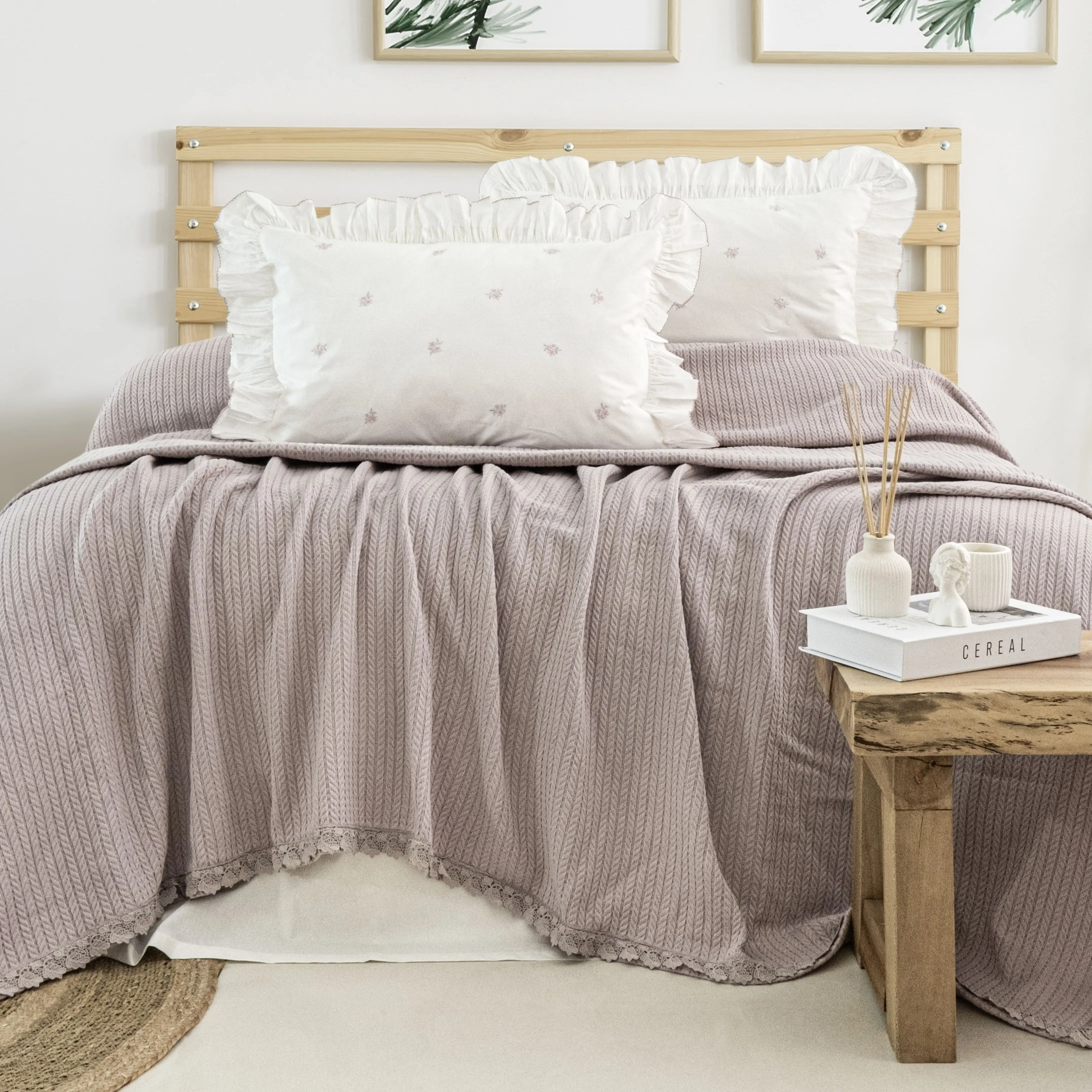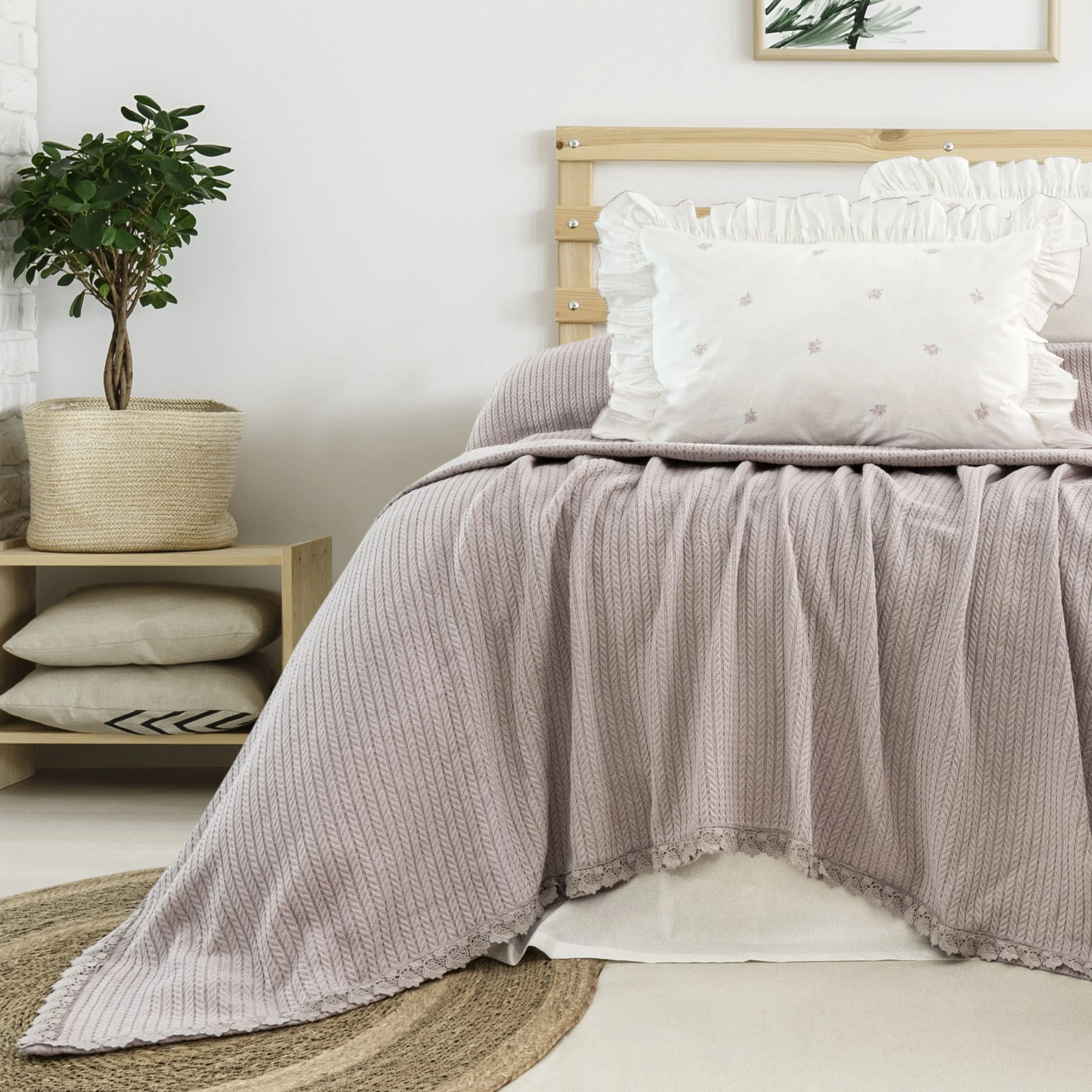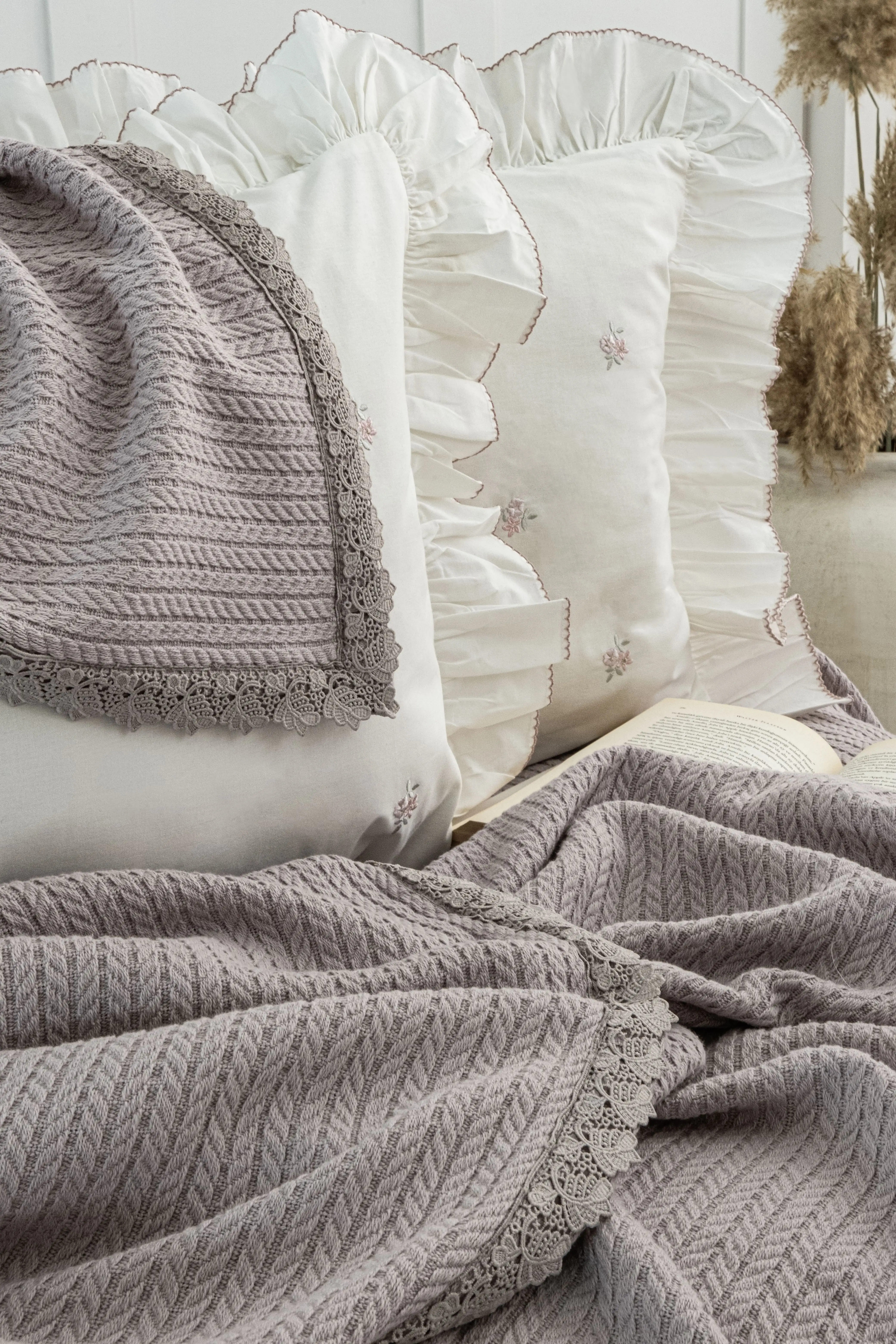 Nevresim takımının ana rengi kremdir; bu, sadelik hissini ön plana çıkarırken, üzerine işlenmiş çiçek desenleri romantik ve huzurlu kontrast oluşturulmuştur. Çiçek desenleri tüm yüzeye eşit aralıklarla serpiştirilmiş olup görünümünü hem düzenli hem de canlı kılmıştır. Çiçek desenlerinin soft tonu nevresimle hoş bir uyum içinde, gözü yormayan ama dikkat çeken bir detay sunar. Çiçek desenleri ile birlikte lila rengi pikenin örgü desenleri bir harmoni yakalarak yatak odanızda soft bir hava oluşturur.