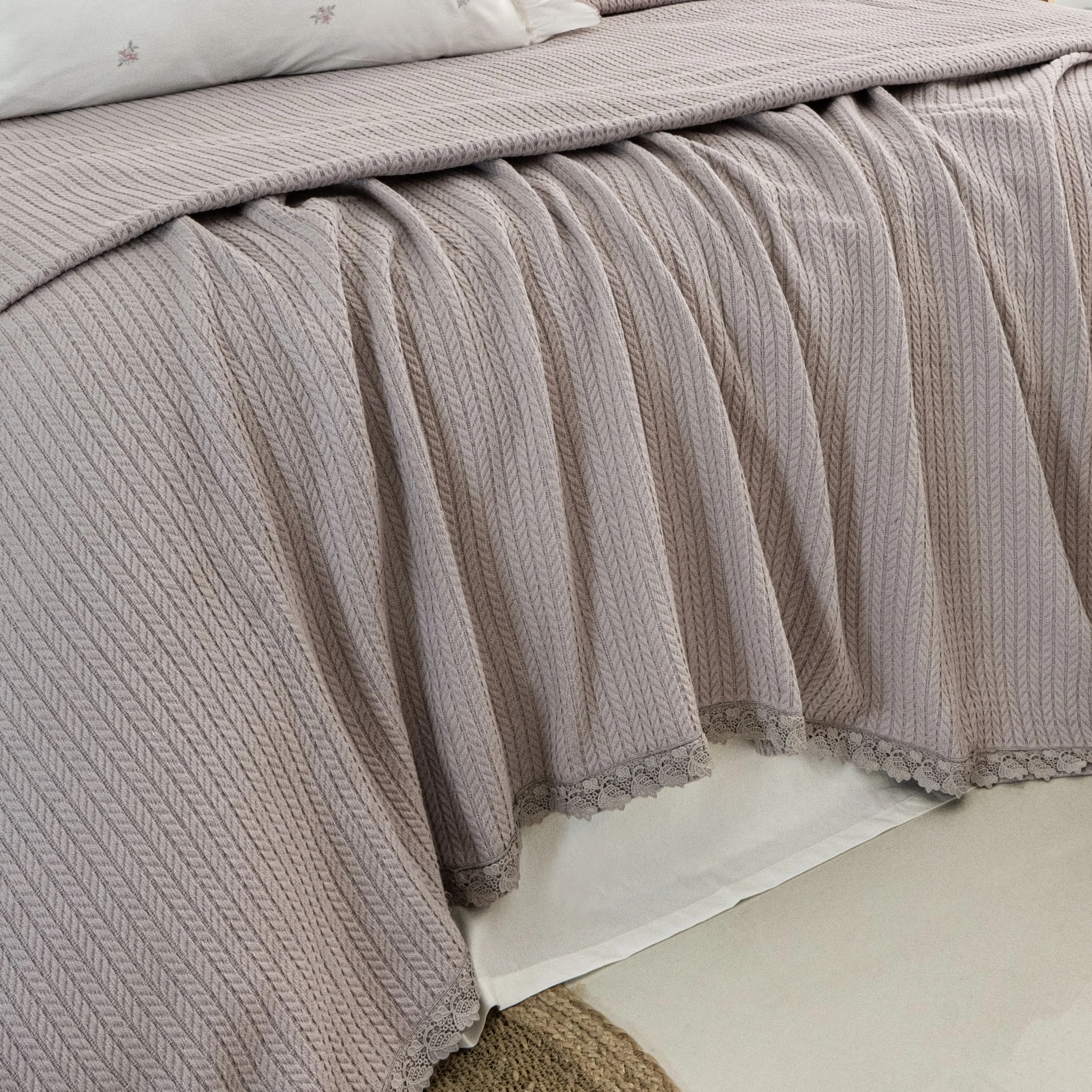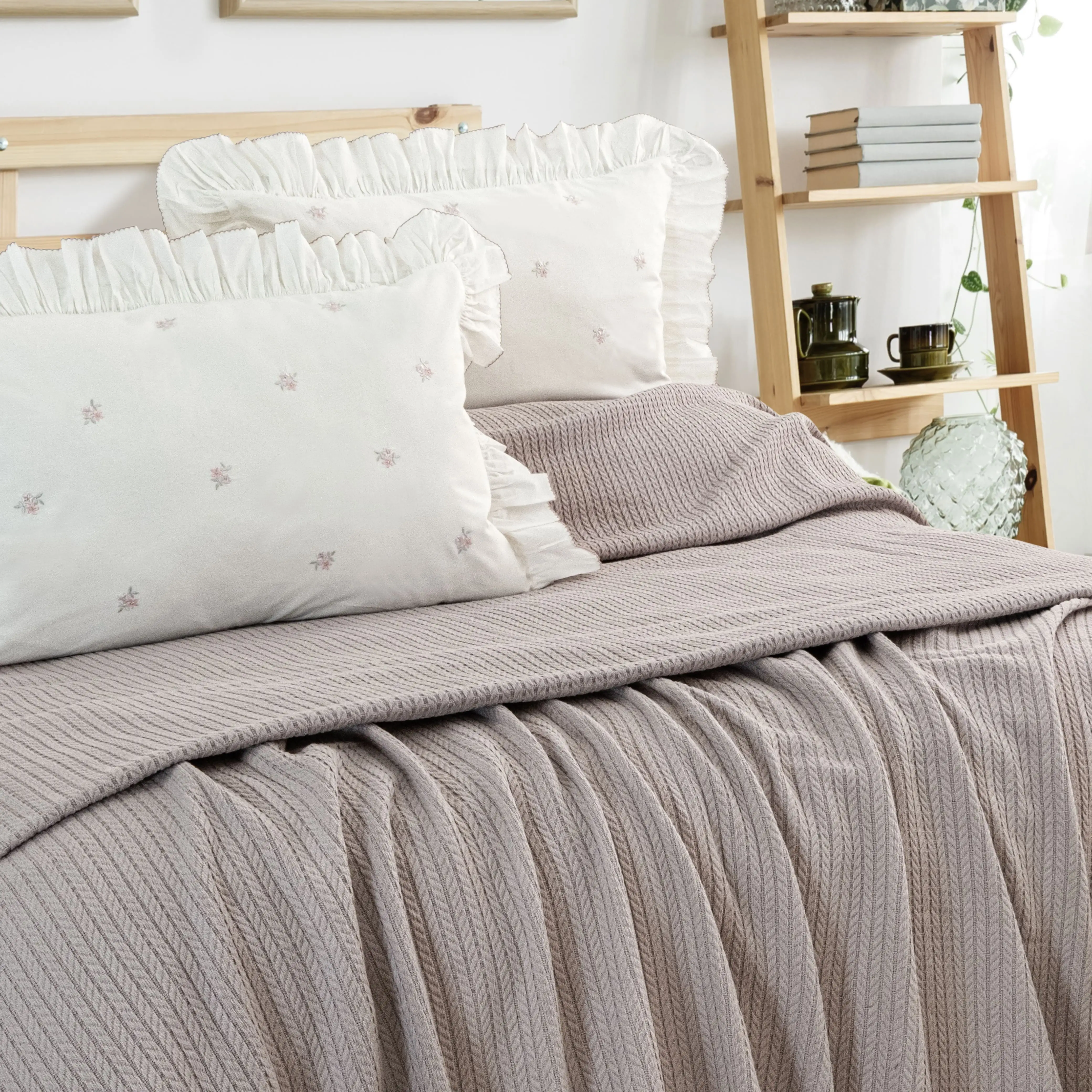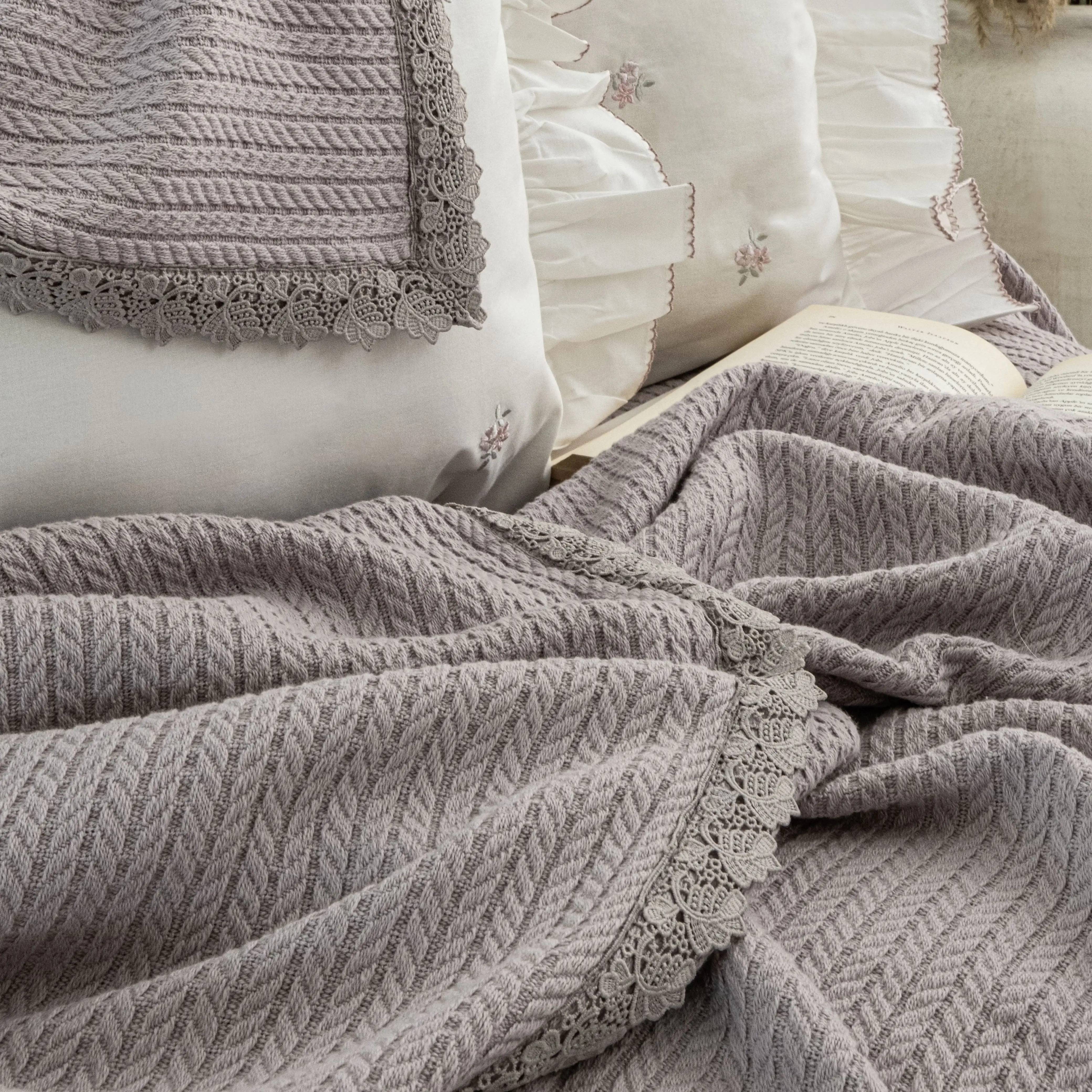 Nevresim takımının ana rengi kremdir; bu, sadelik hissini ön plana çıkarırken, üzerine işlenmiş çiçek desenleri romantik ve huzurlu kontrast oluşturulmuştur. Çiçek desenleri tüm yüzeye eşit aralıklarla serpiştirilmiş olup görünümünü hem düzenli hem de canlı kılmıştır. Çiçek desenlerinin soft tonu nevresimle hoş bir uyum içinde, gözü yormayan ama dikkat çeken bir detay sunar. Çiçek desenleri ile birlikte lila rengi pikenin örgü desenleri bir harmoni yakalarak yatak odanızda soft bir hava oluşturur.