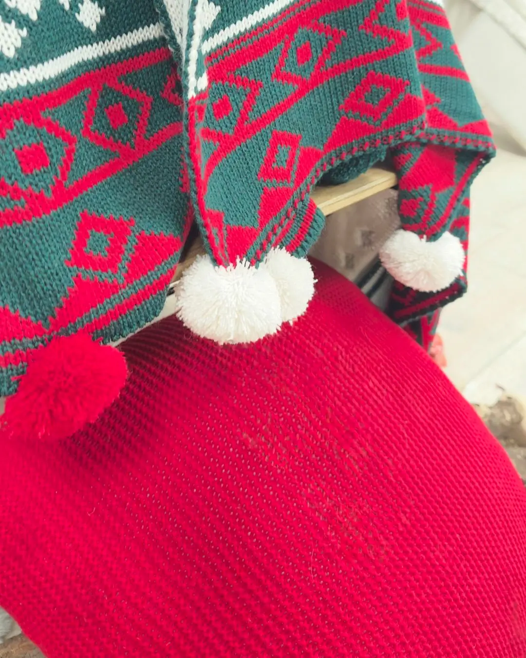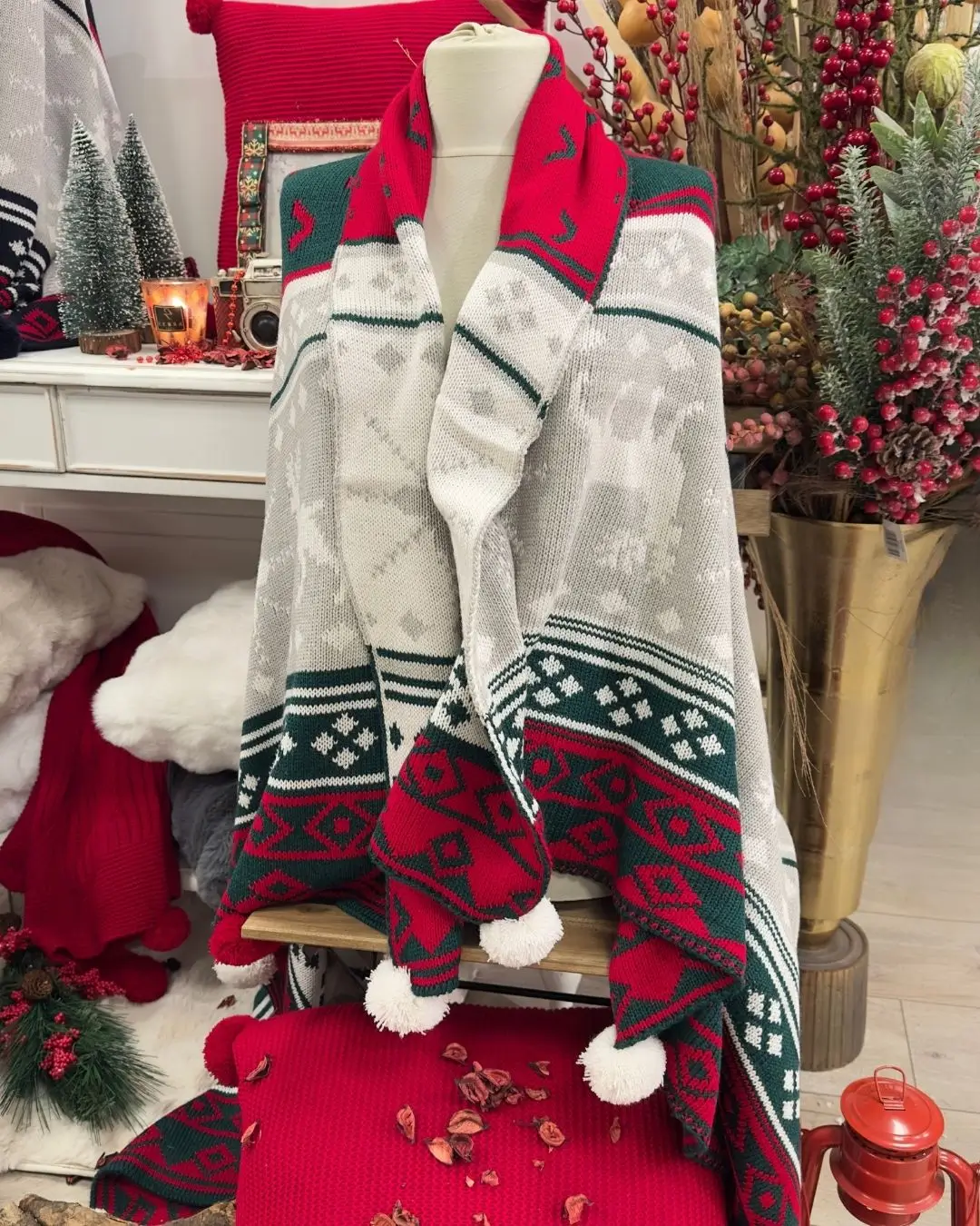Snow Set Triko Şal & 45x45 Kırlent / Kırmızı - Yeşil