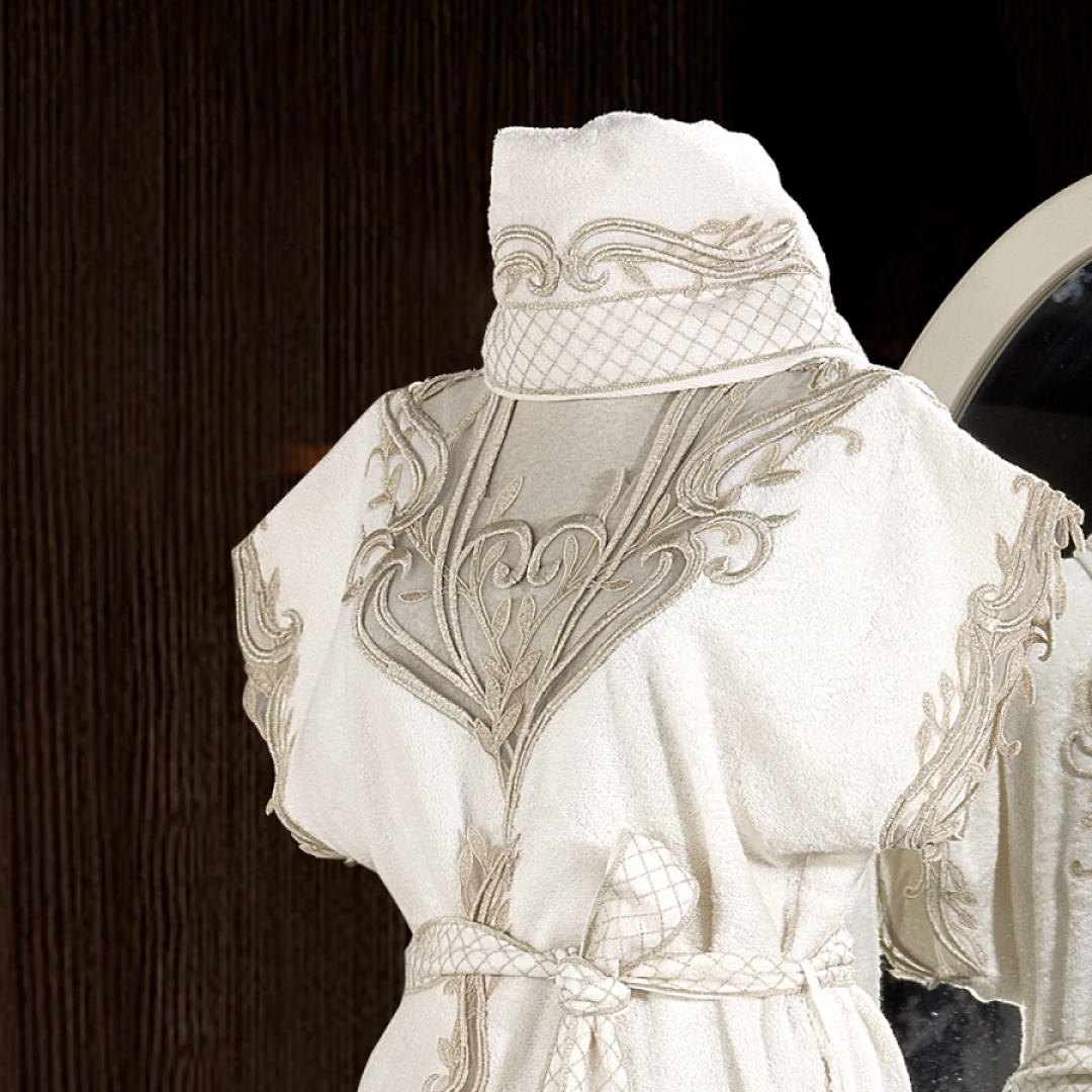 Tasarım: Gri tonlarında tasarlanan bornozun yaka kısmı ve göğüs bölgesinde işlenmiş dantelleri bulunmaktadır.