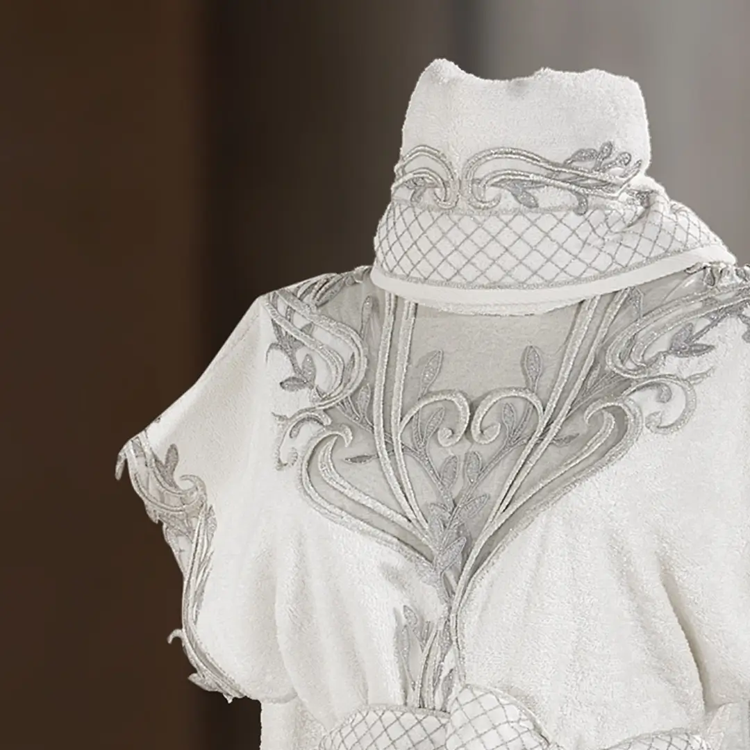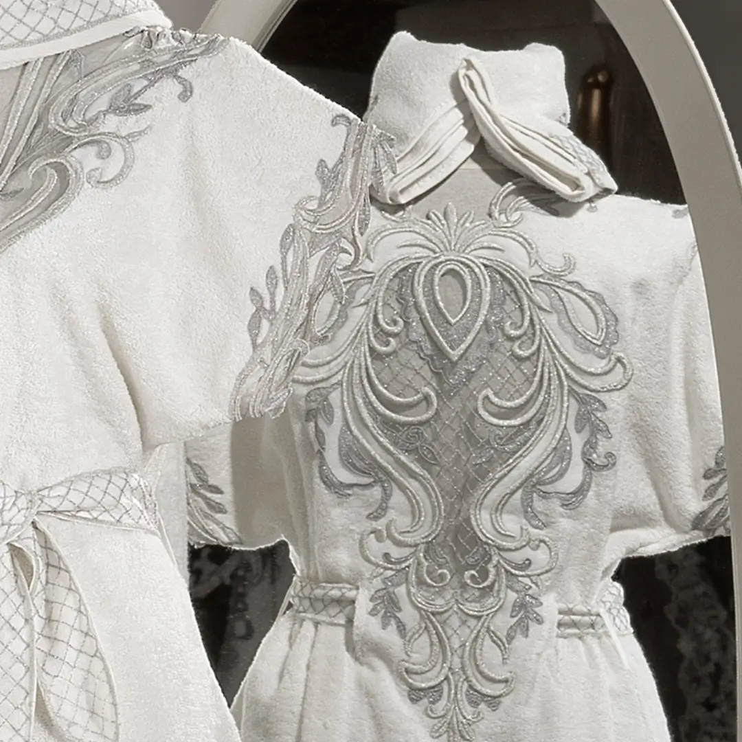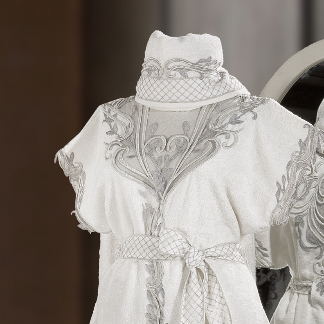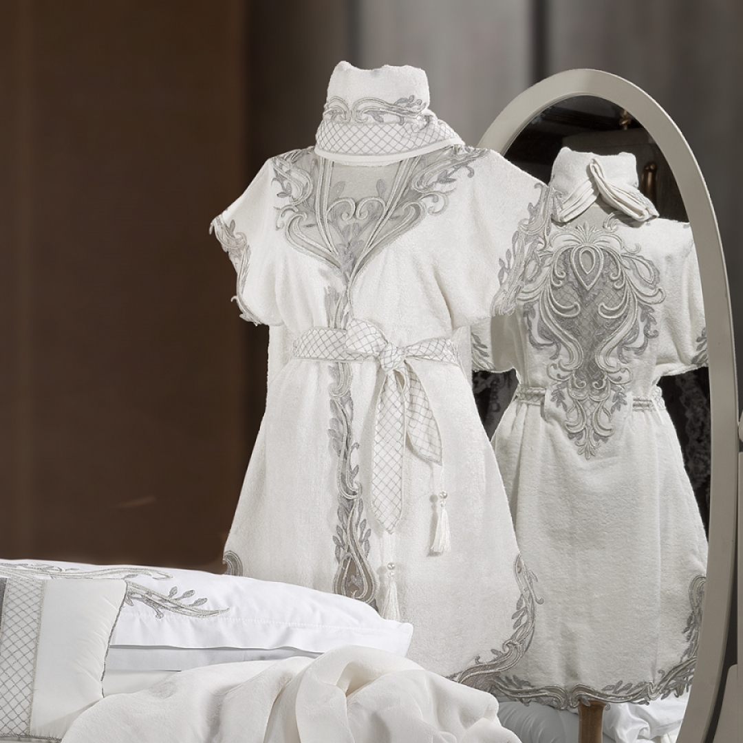 Tasarım: Gri tonlarında tasarlanan bornozun yaka kısmı ve göğüs bölgesinde işlenmiş dantelleri bulunmaktadır.