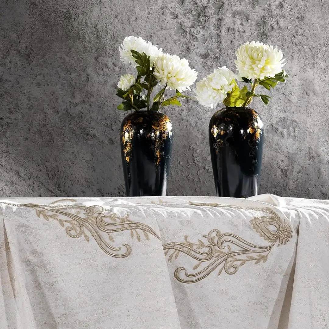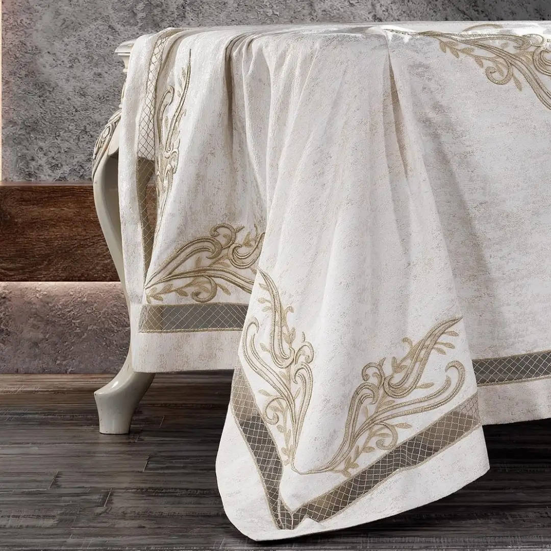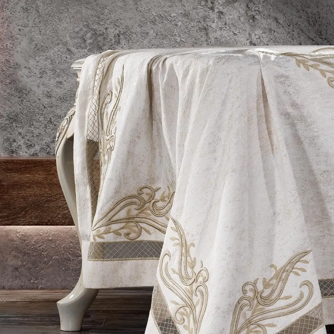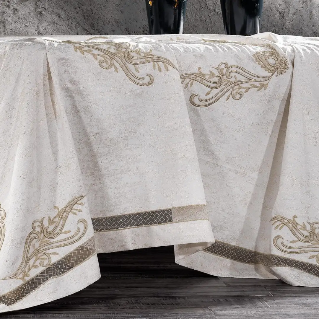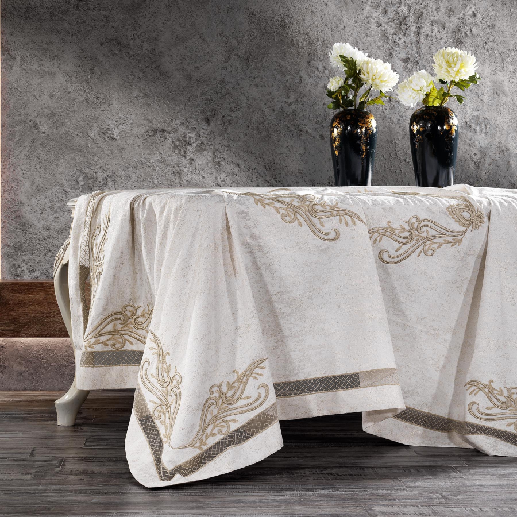 Gelince Haber VerTIARA MASA ÖRTÜSÜ / CAPPUCCINO Evinizin dekoruna zarafet katacak şık işlemeli masa örtüsü takımı, klasik ve modern tasarımın mükemmel uyumunu sunuyor. Cappuccino renk fonu üzerine özenle işlenmiş floral desenleri, sofralarınıza ve misafir ağırlamalarınıza şıklık kazandırır.