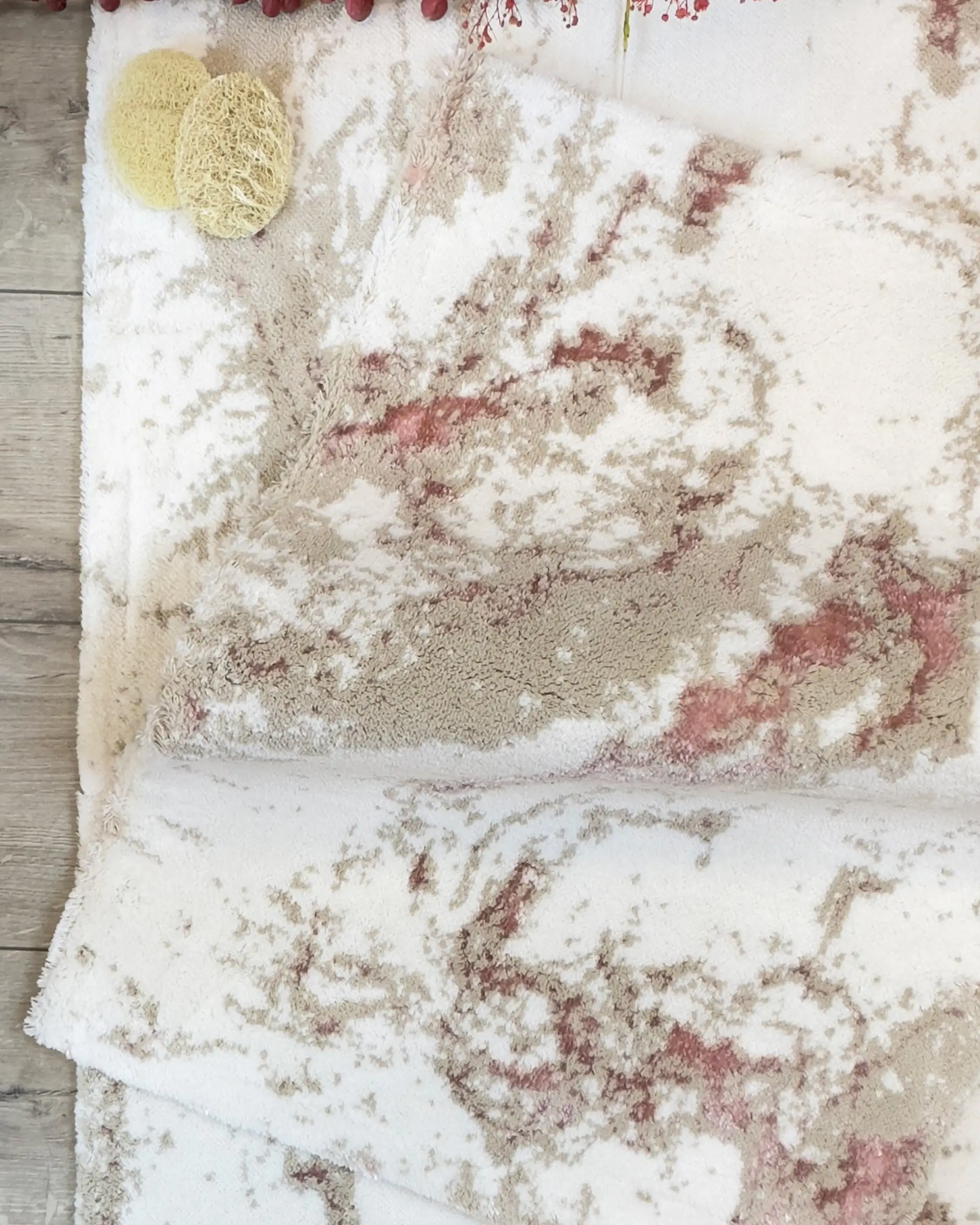 VERONICA 2'Lİ PASPAS TAKIMI, bu zarif paspas seti, Pamuk - viskon ipliğinden üretilmiş olup, yumuşak dokusu sayesinde konforlu bir kullanım sunar. Alt kısmı halı tabanlıdır, bu sayede kaymaz özelliğe sahiptir ve güvenli bir kullanım sağlar.