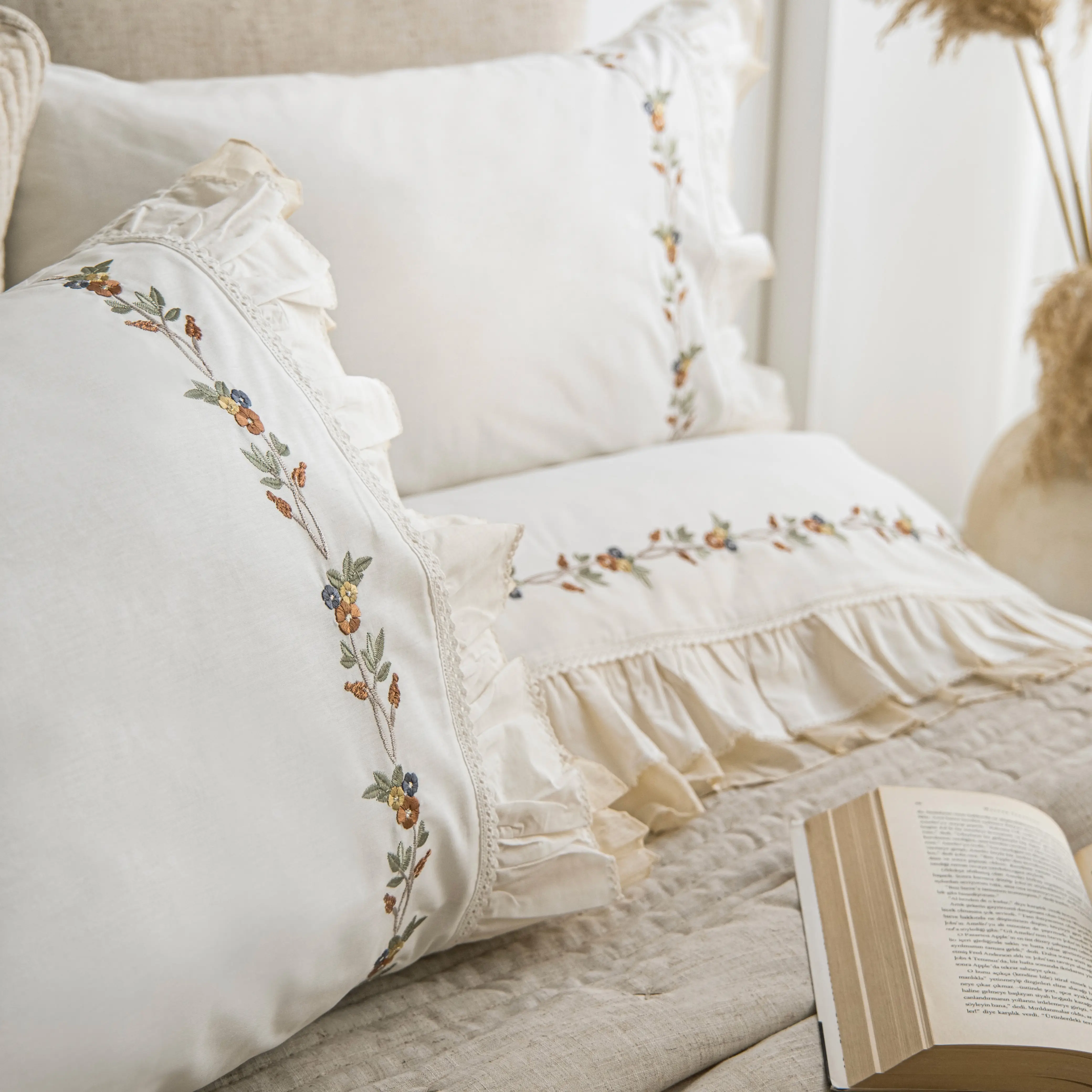 Yastık kılıflarında ince çiçek nakışları ve fırfırlı kenar detayları